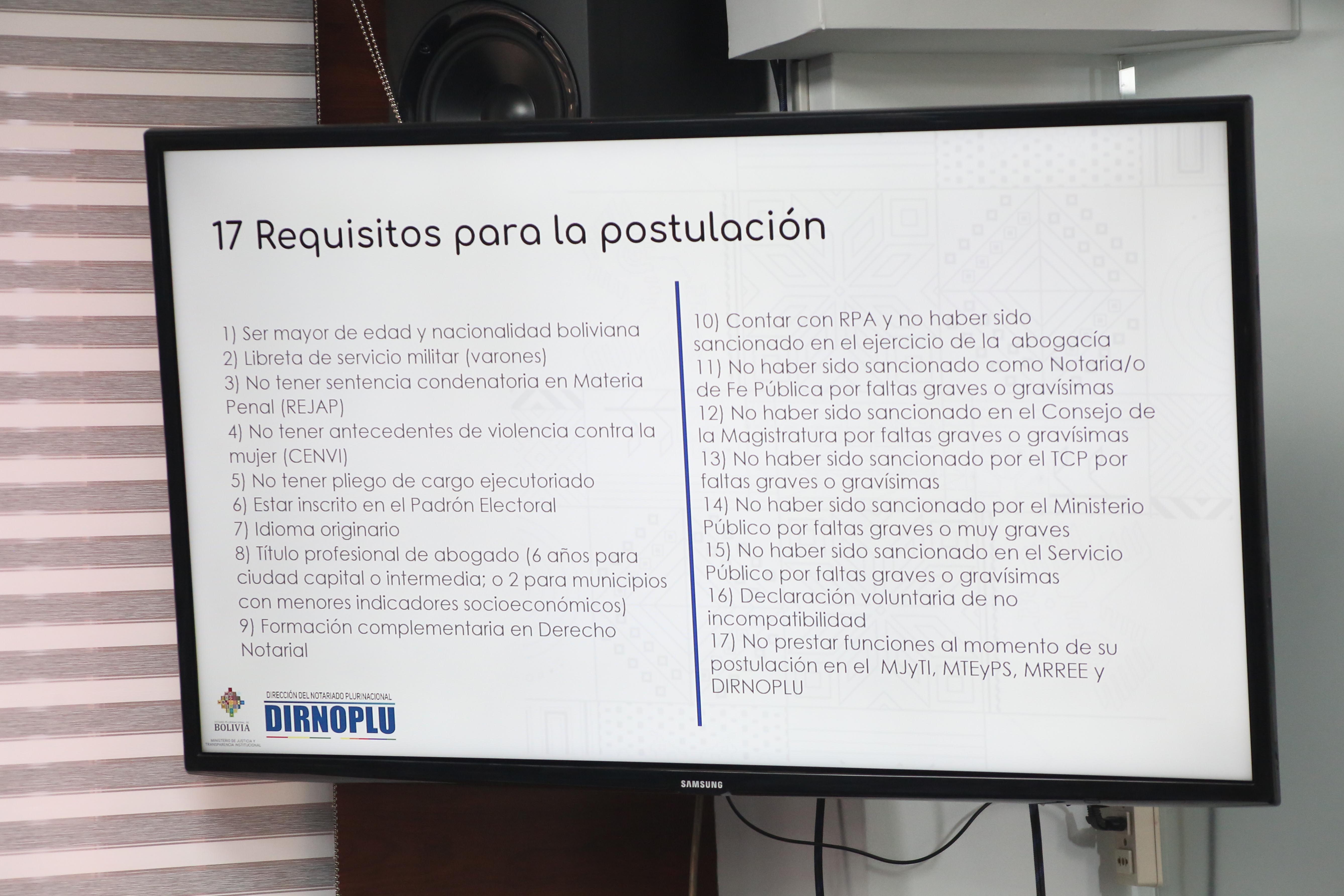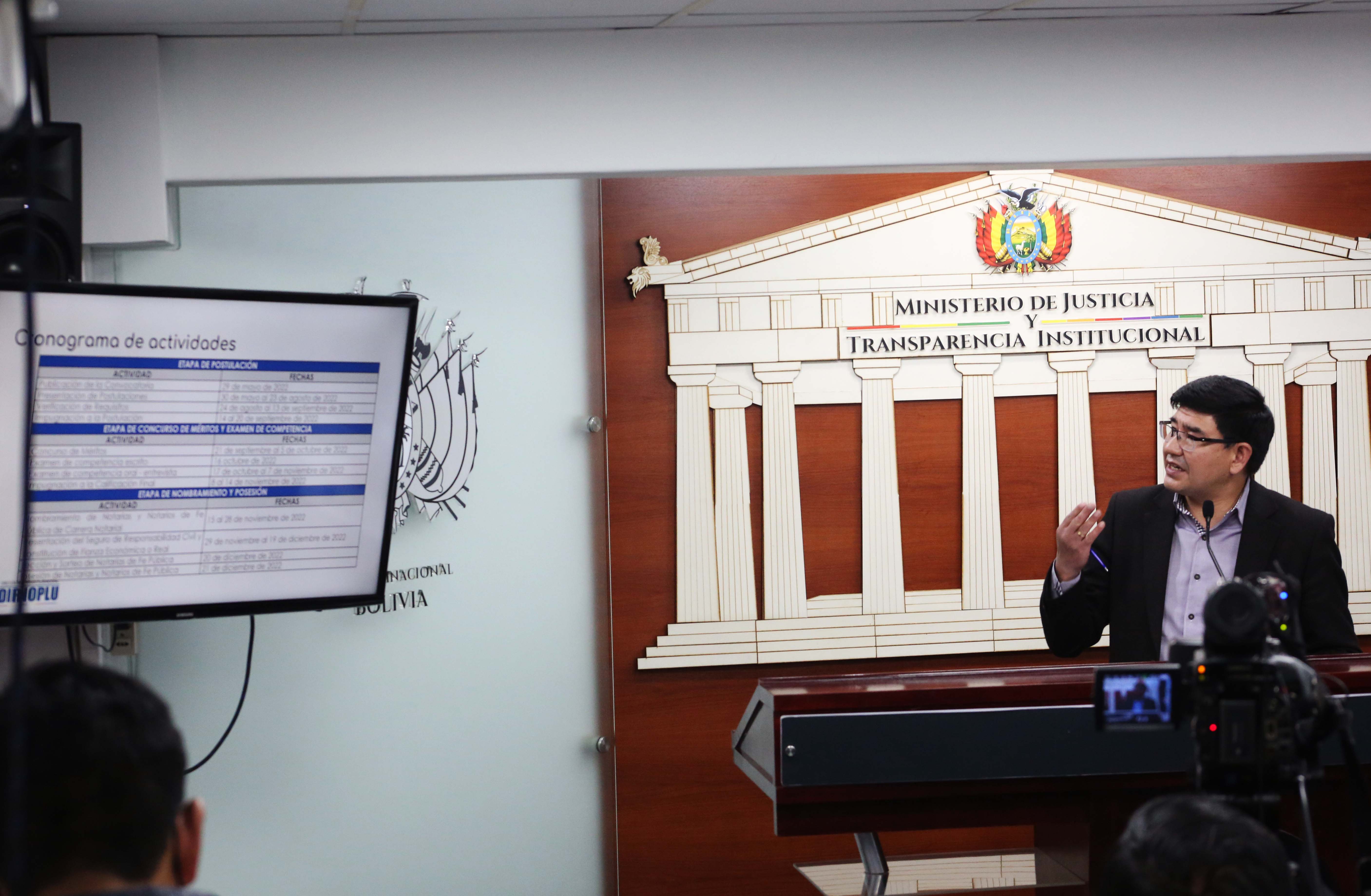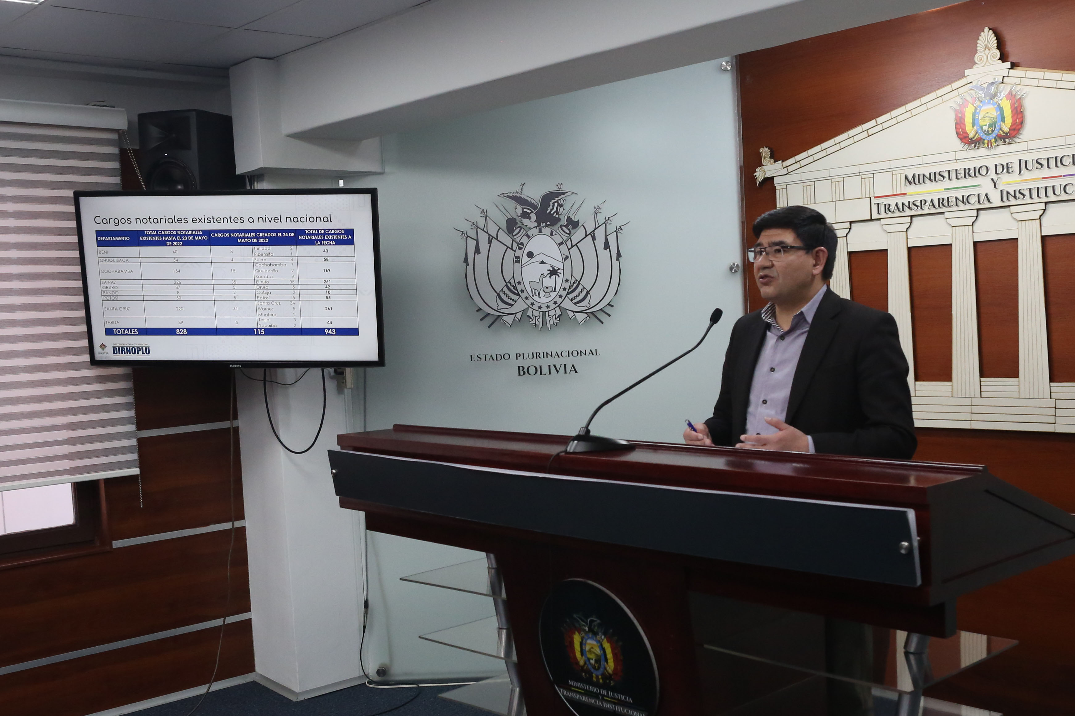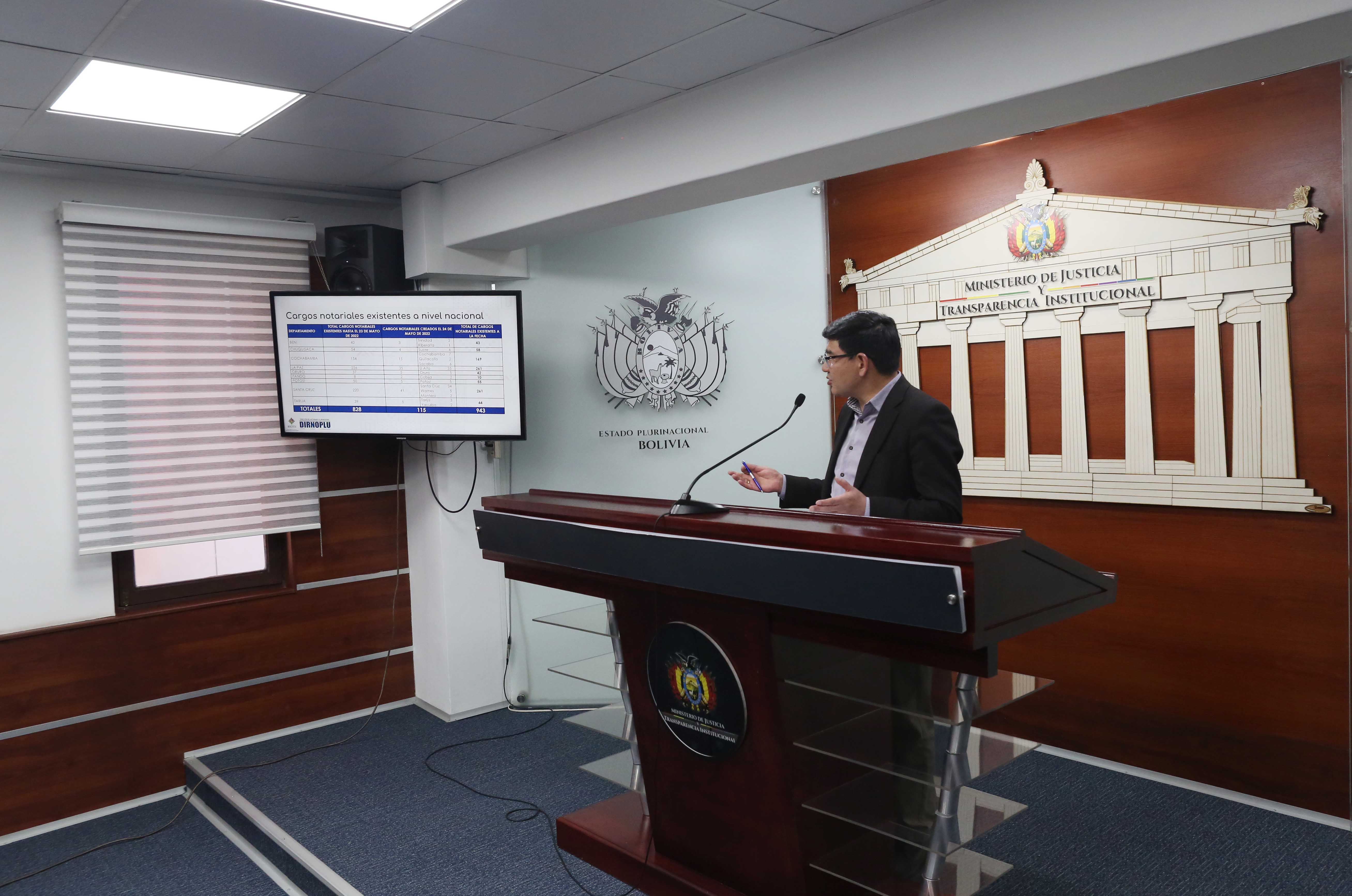 El director de la Dirección del Notariado Plurinacional DIRNOPLU, Milton Barón, dio a conocer la convocatoria pública a cargos notariales y los resultados a la fecha de la implementación del Sistema Informático del Notariado Plurinacional SINPLU