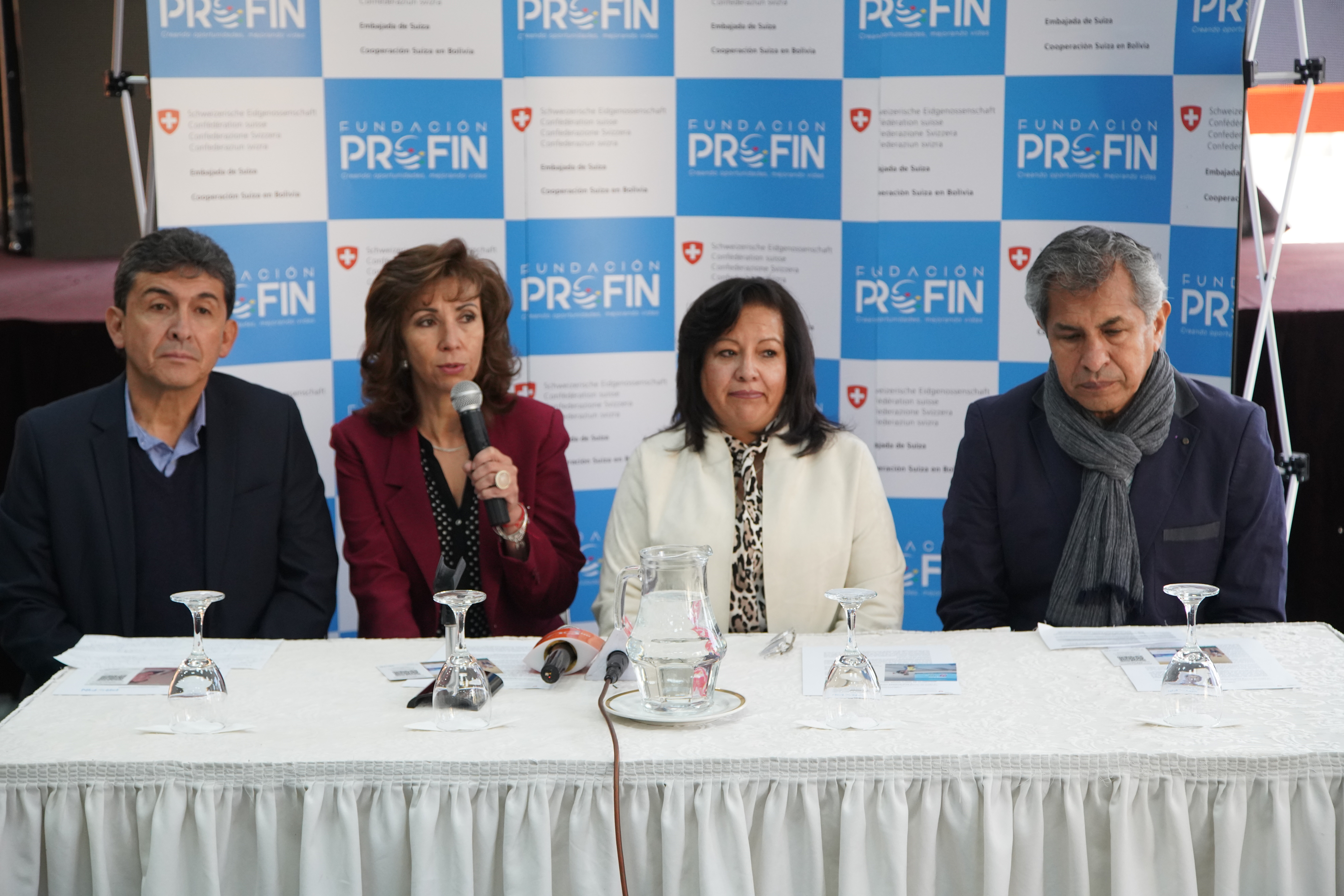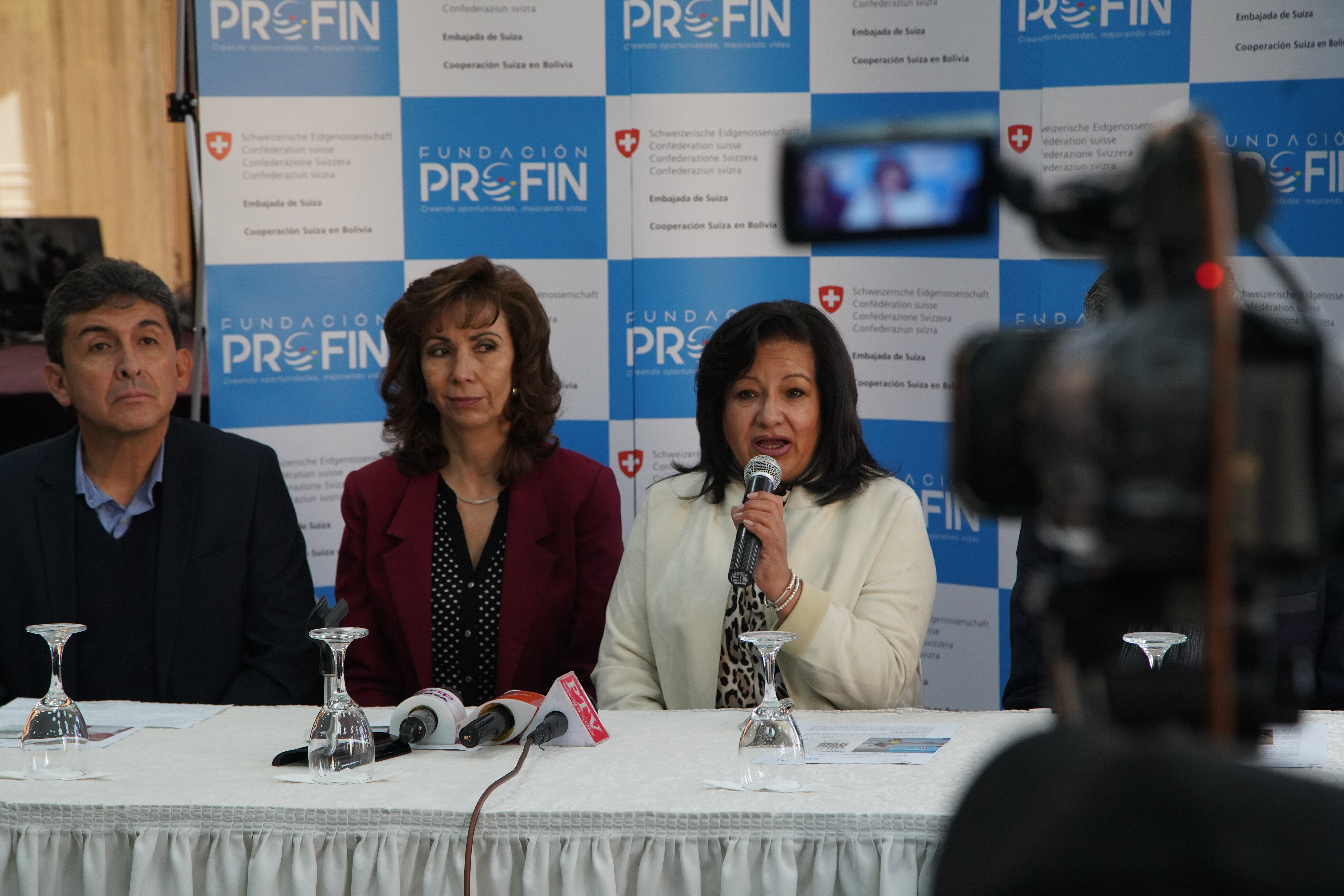 Conferencia de Prensa, voceros José Luis Pereira, Oficial Nacional de Programas de la Cooperación Suiza; Kathia Ferrufino, Presidenta Directorio PROFIN; Edwin Vargas, sobre los avances y resultados finales del proyecto seguros inclusivos en Bolivia