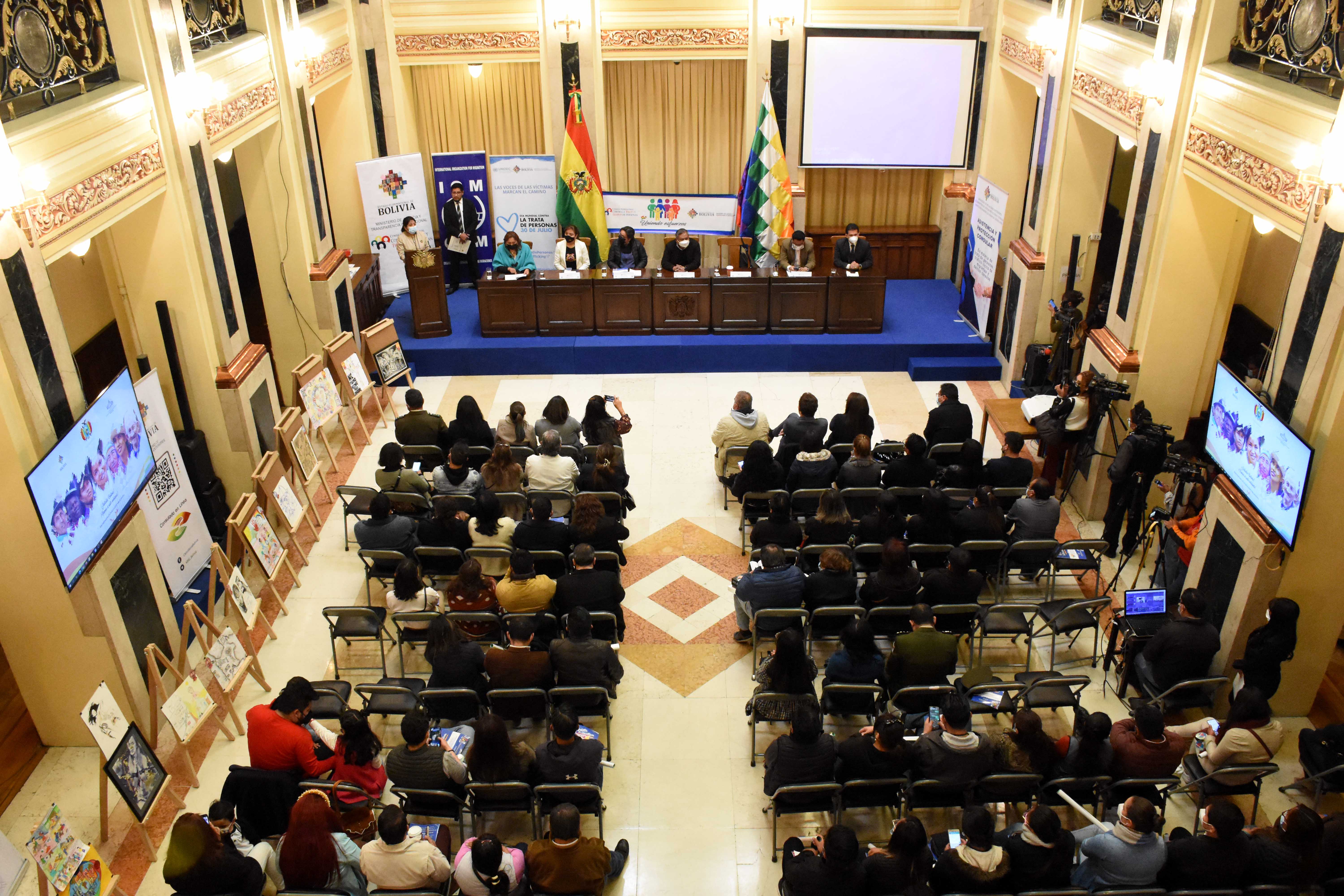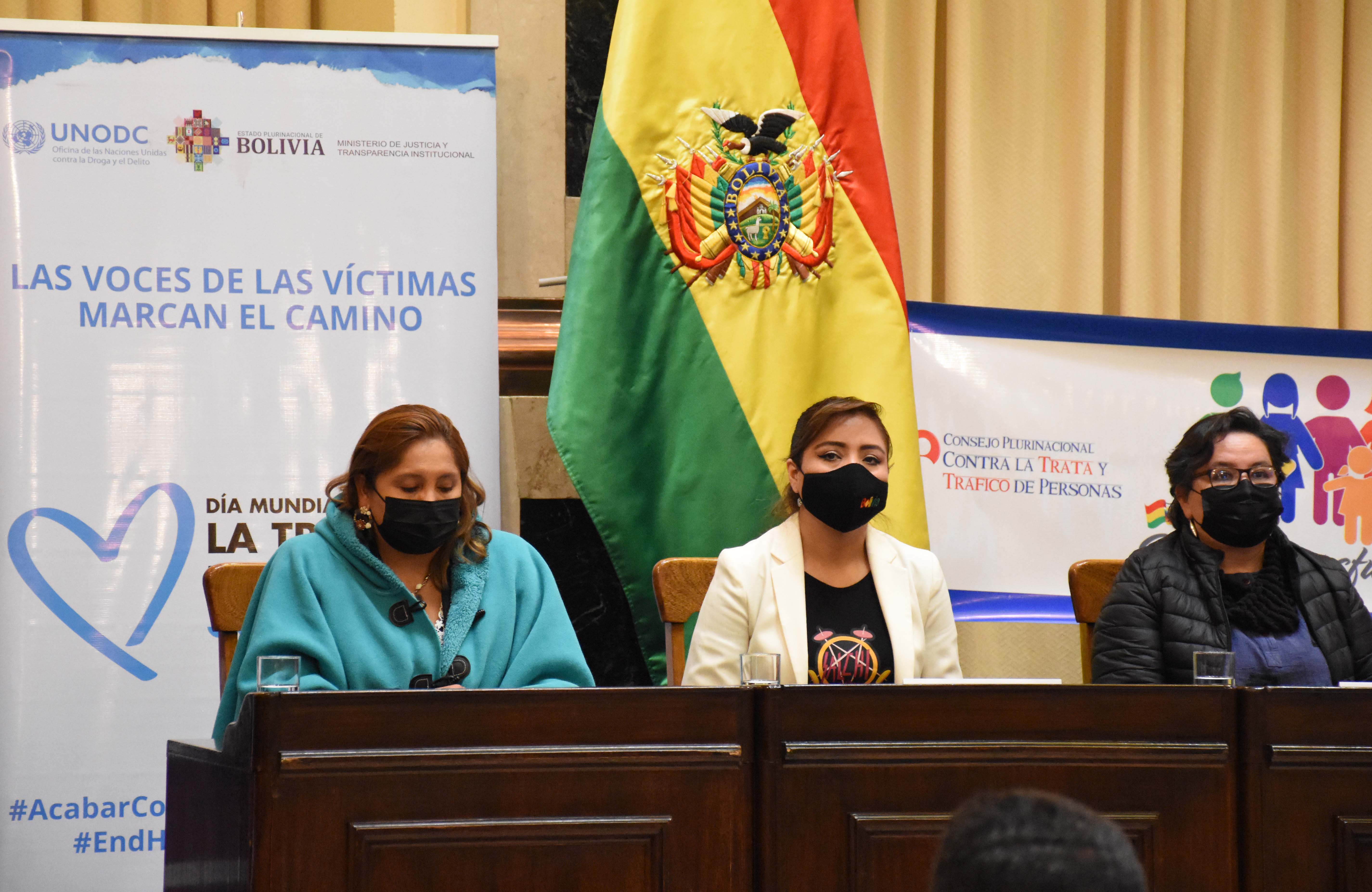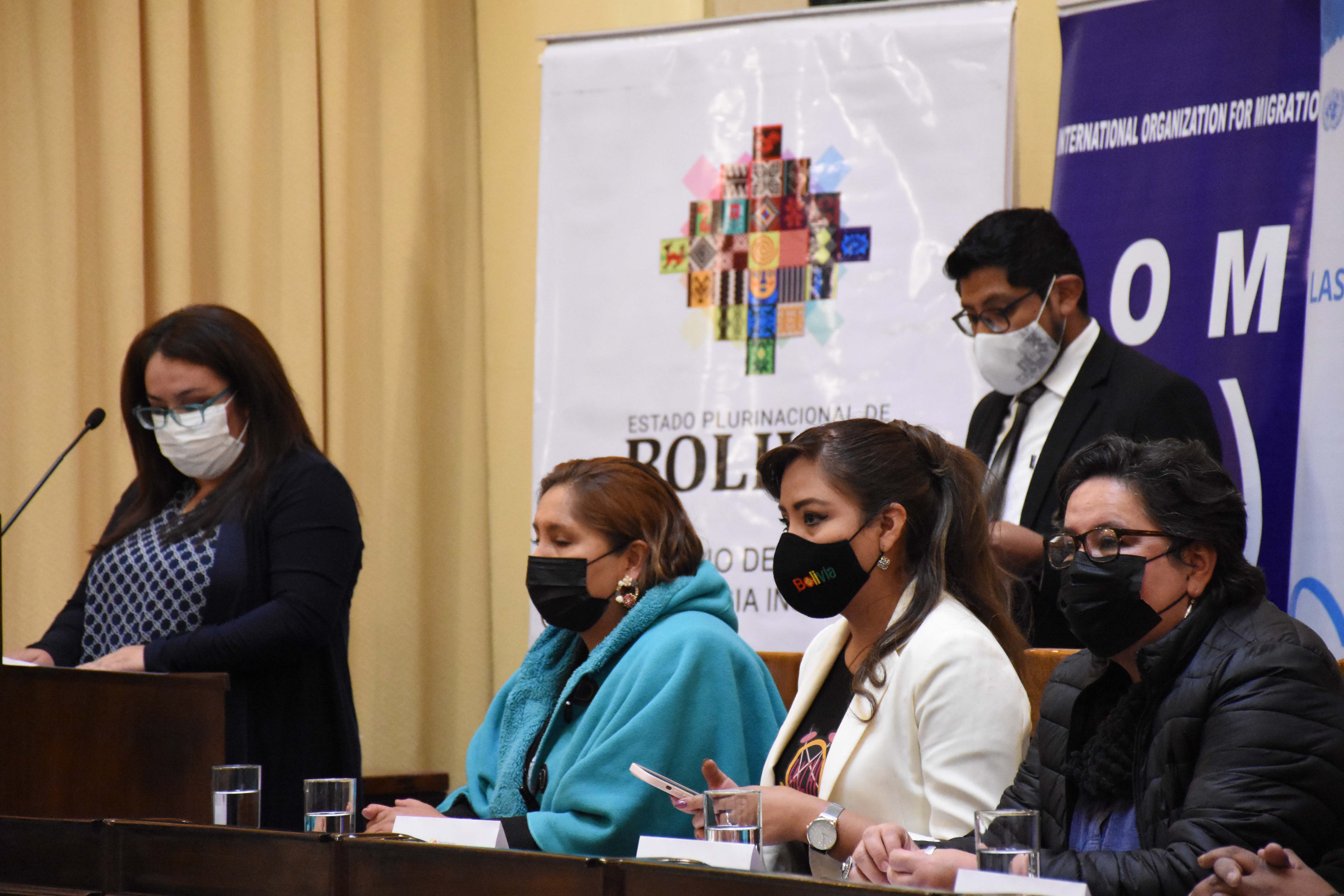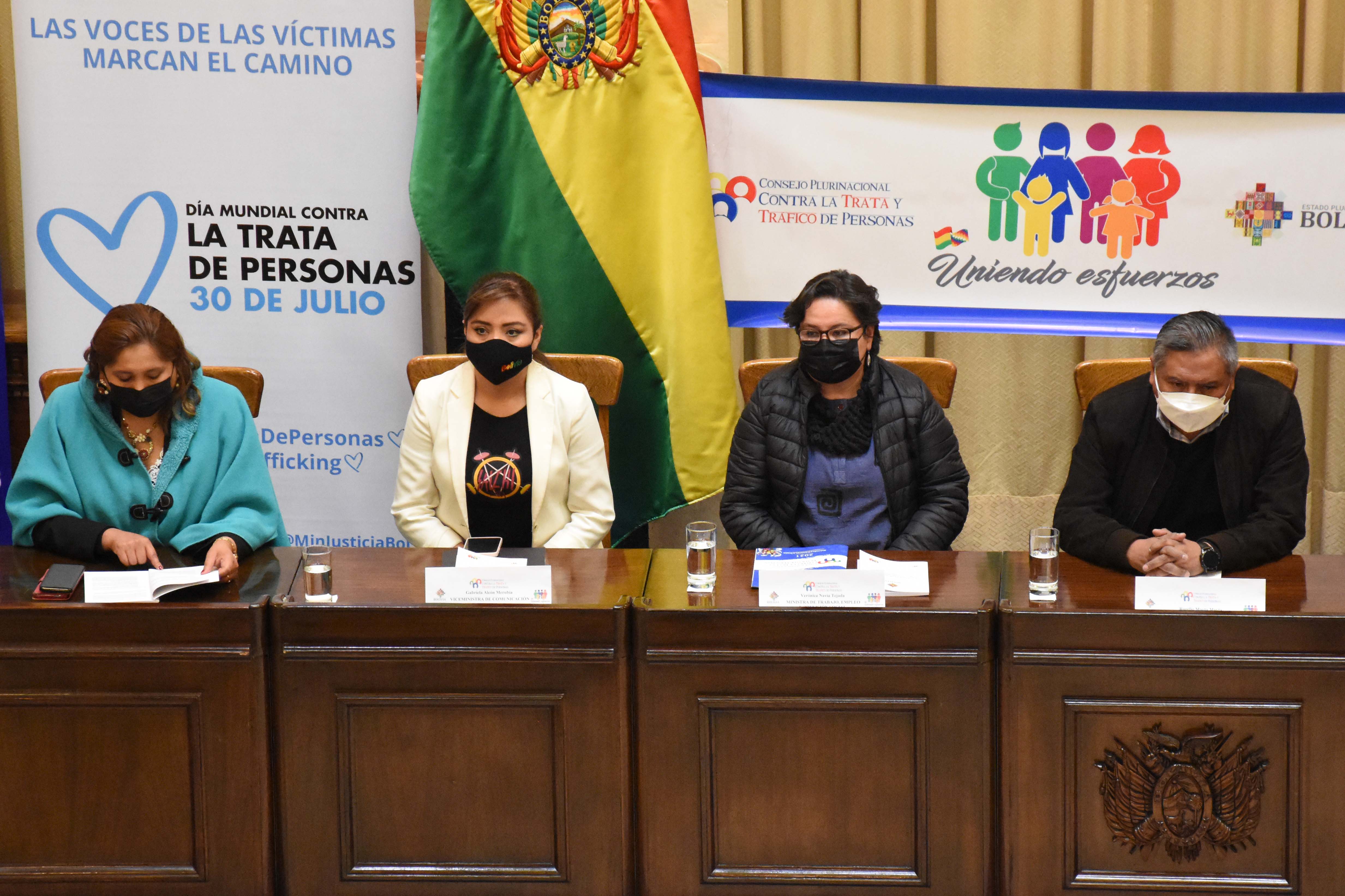 Acto de presentación de la Política Plurinacional contra la Trata de Personas, Tráfico Ilícito de Migrantes y Delitos Conexos 2021-2025, con la presencia de la viceministra de Comunicación, Gabriela Alcón, Defensora del Pueblo, Nadia Cruz, el canciller Ro