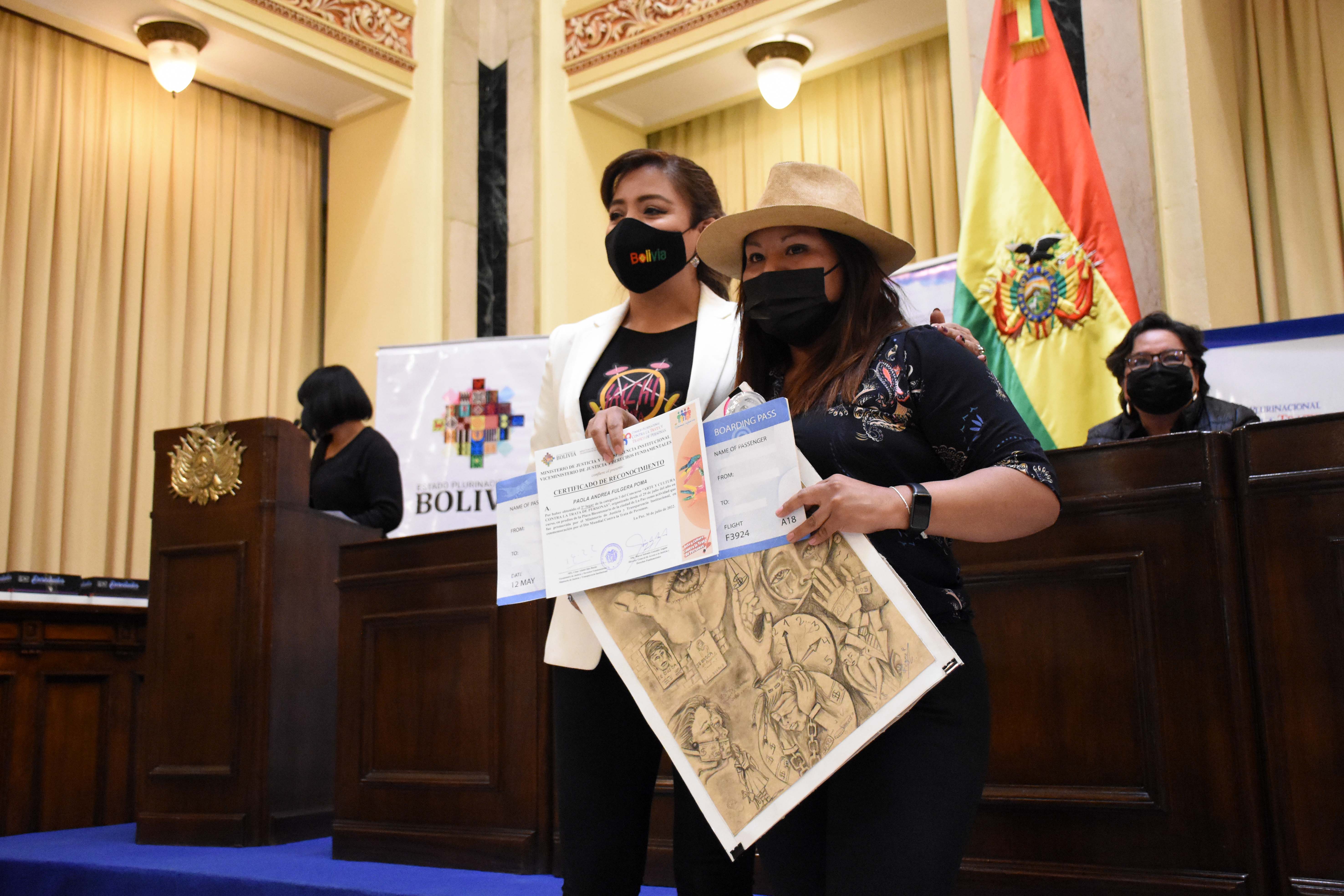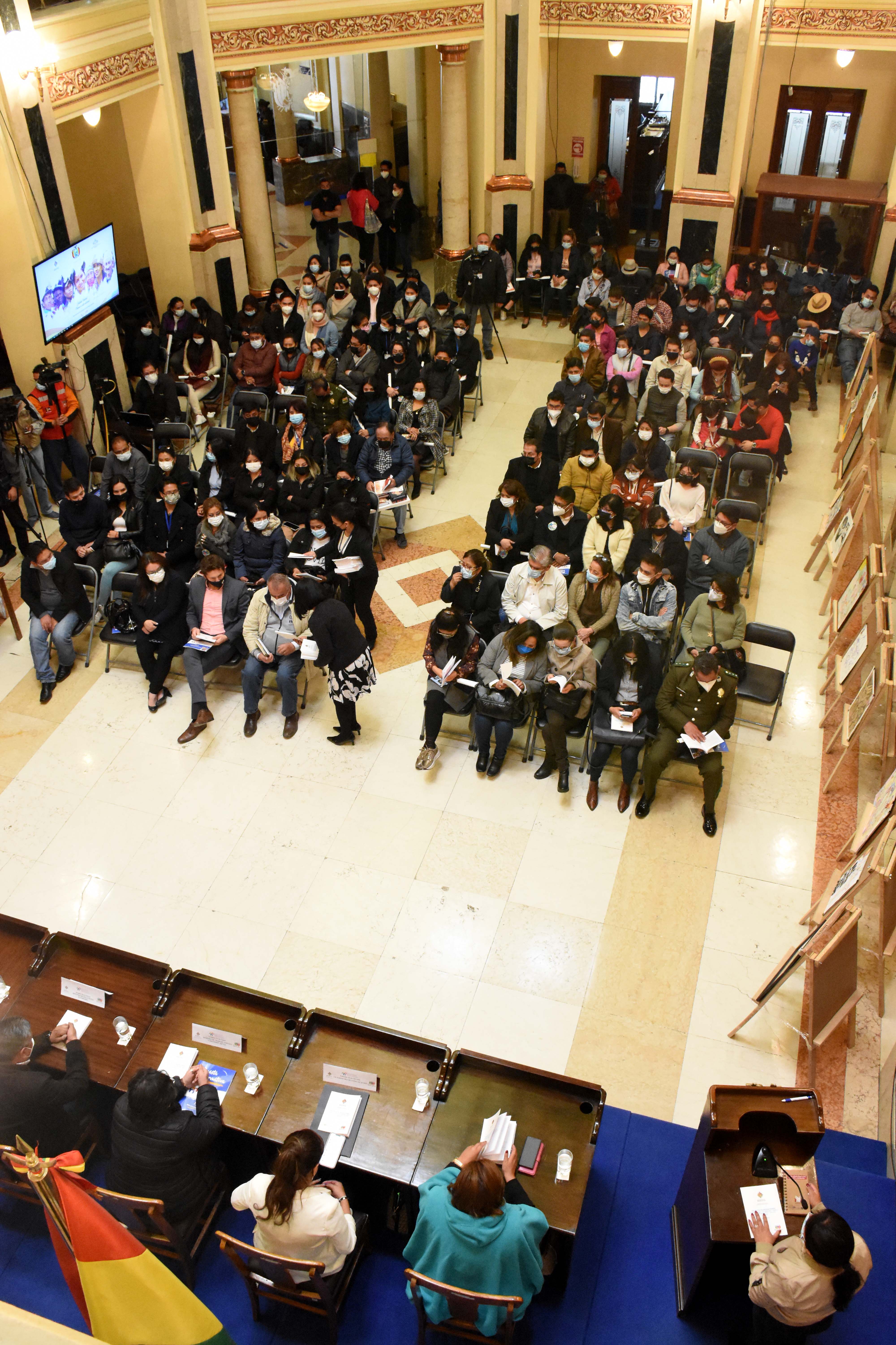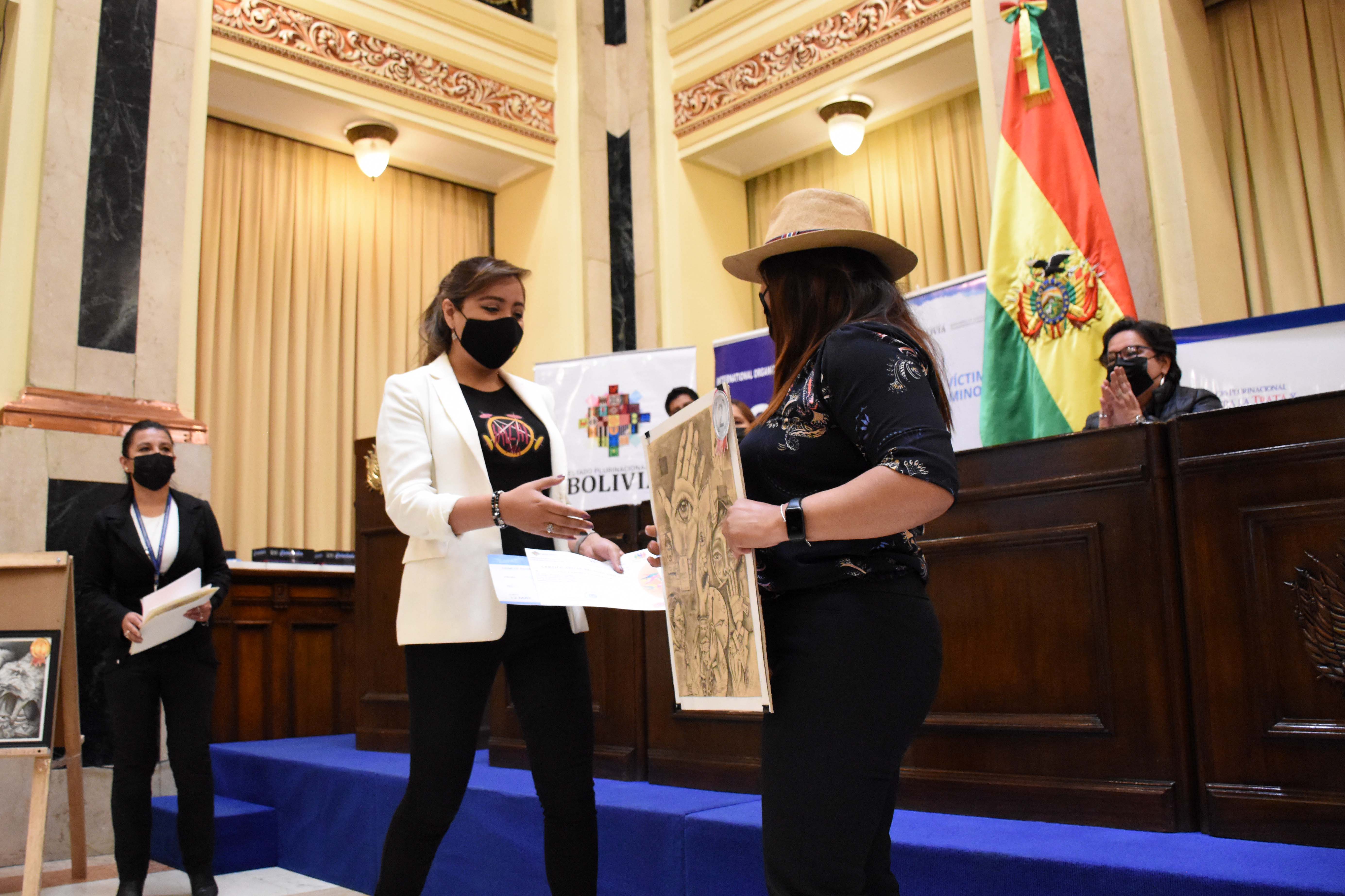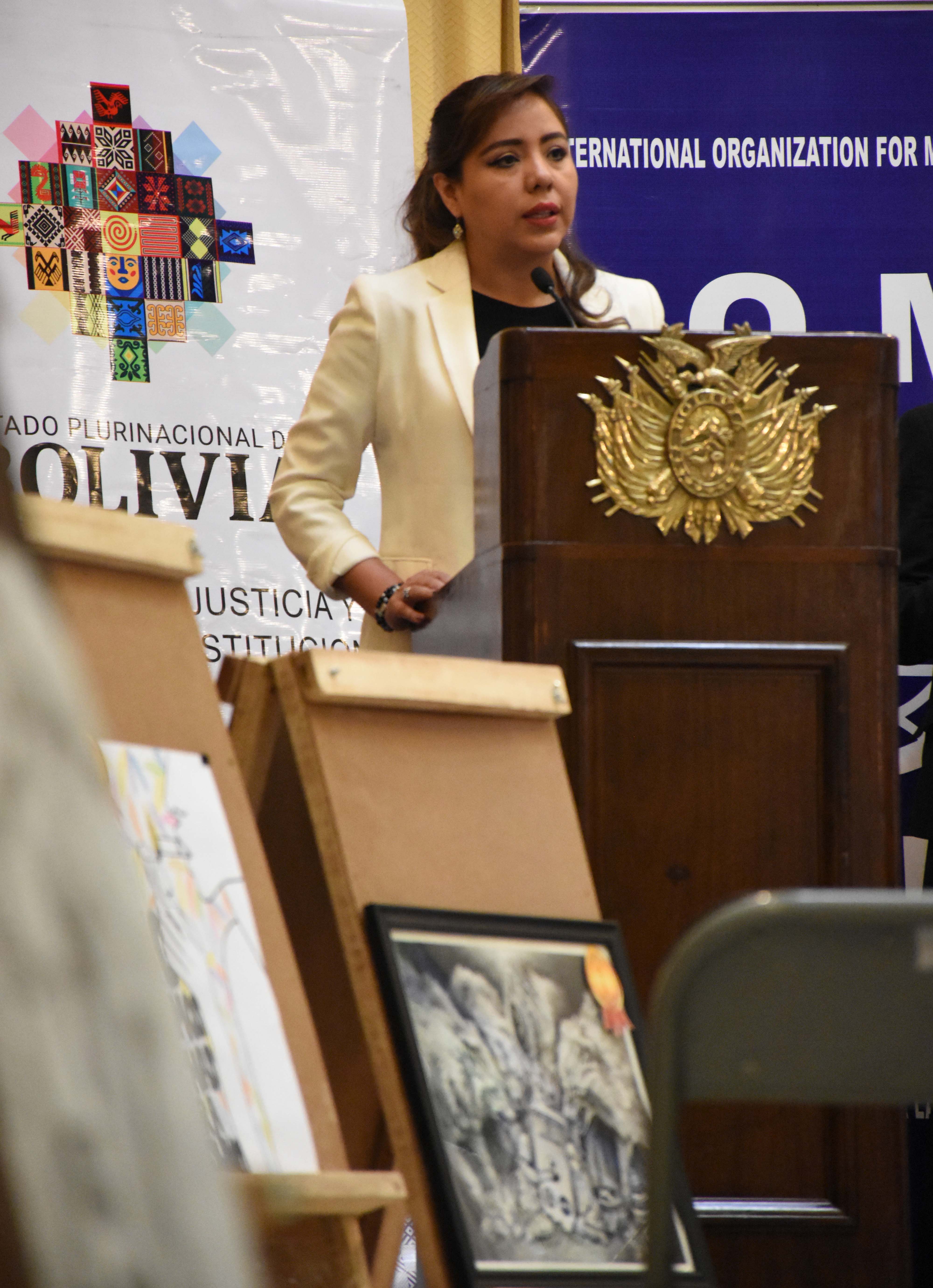 Acto de presentación de la Política Plurinacional contra la Trata de Personas, Tráfico Ilícito de Migrantes y Delitos Conexos 2021-2025, con la presencia de la viceministra de Comunicación, Gabriela Alcón, Defensora del Pueblo, Nadia Cruz, el canciller Ro