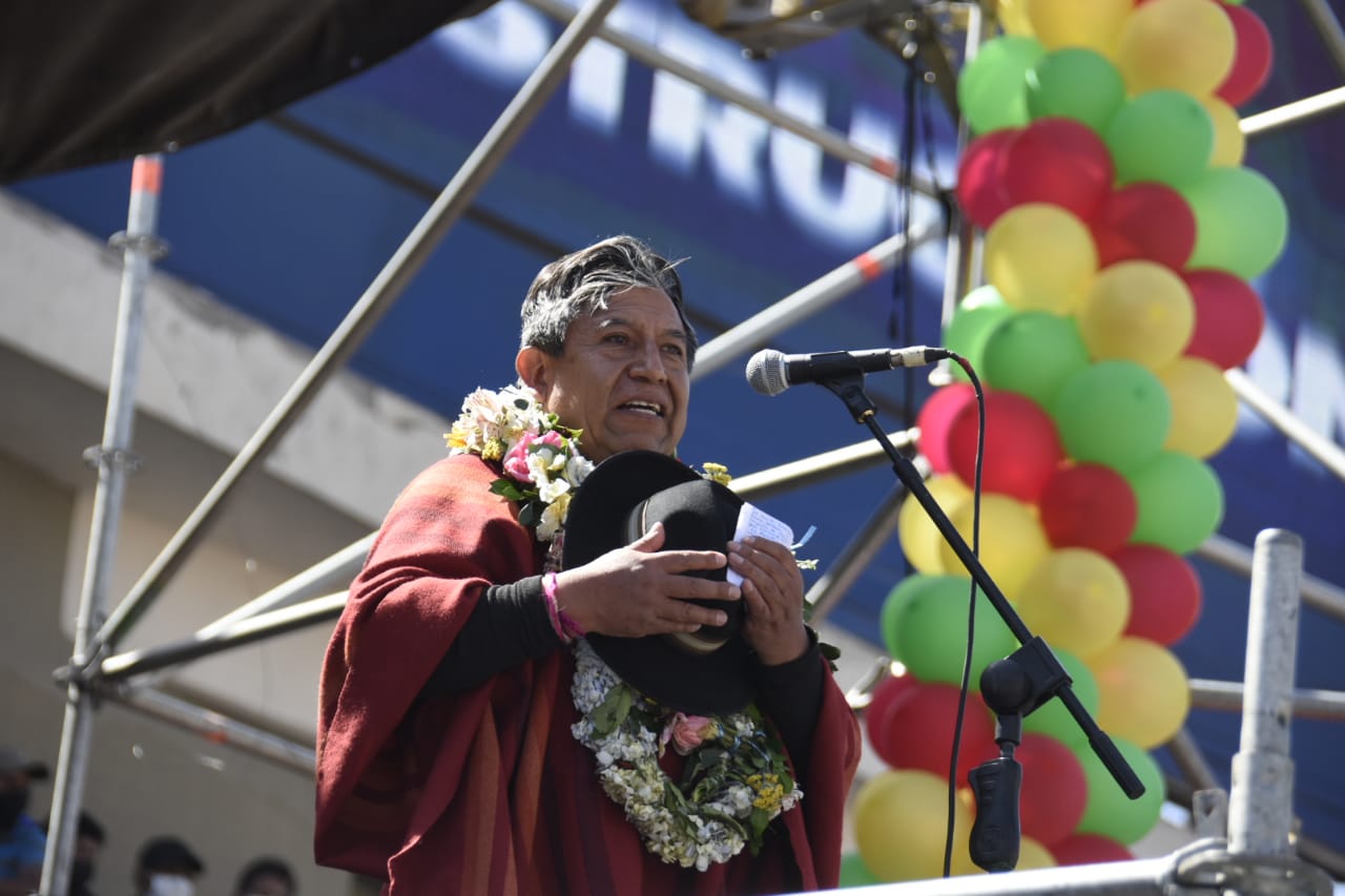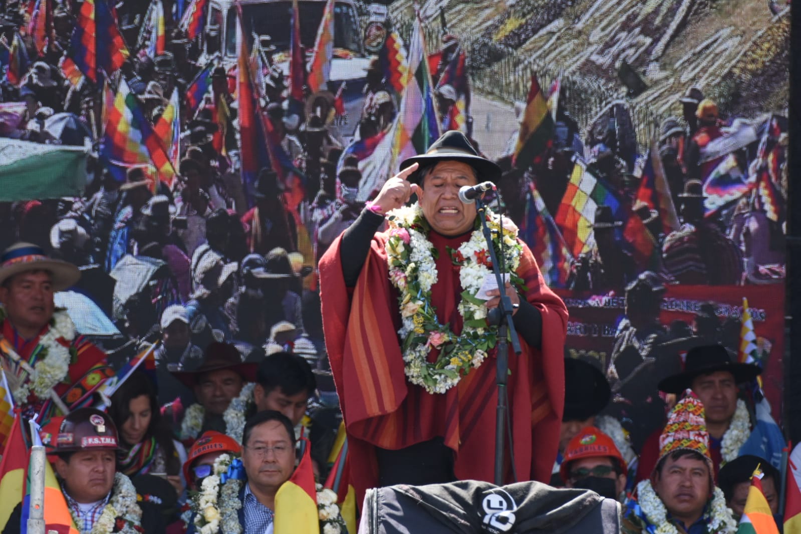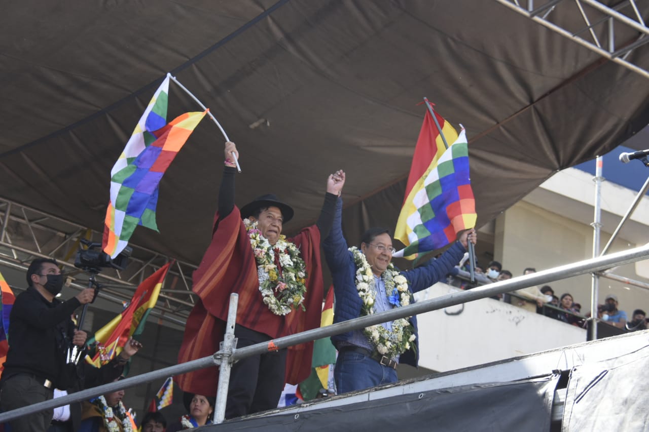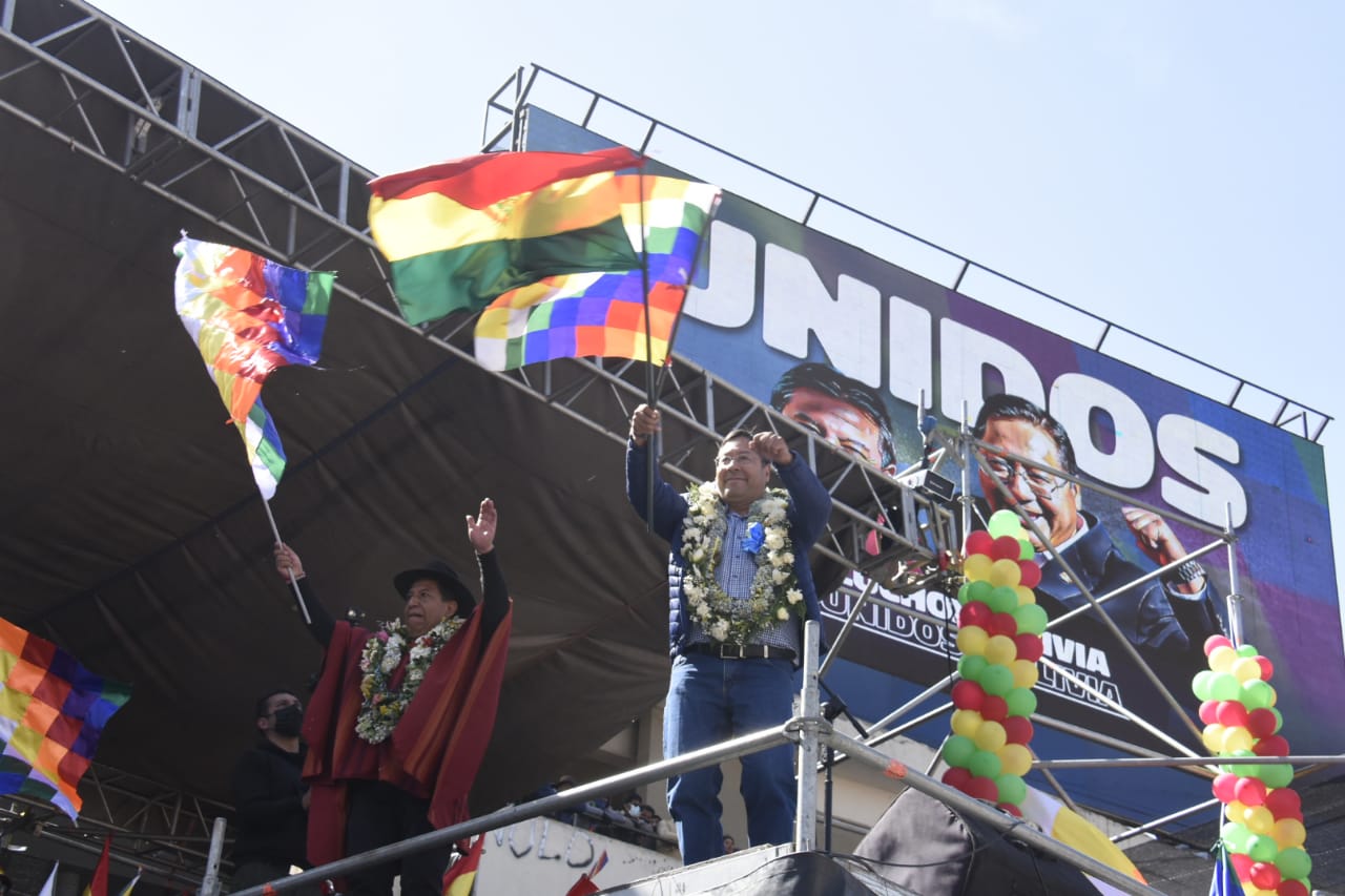 Presidente Luis Arce, Vicepresidente David Choquehuanca y ex Presidente Evo Morales discursan ante la concentración de los marchistas llegados en Defensa de la Democracia y la Reconstrucción Económica
