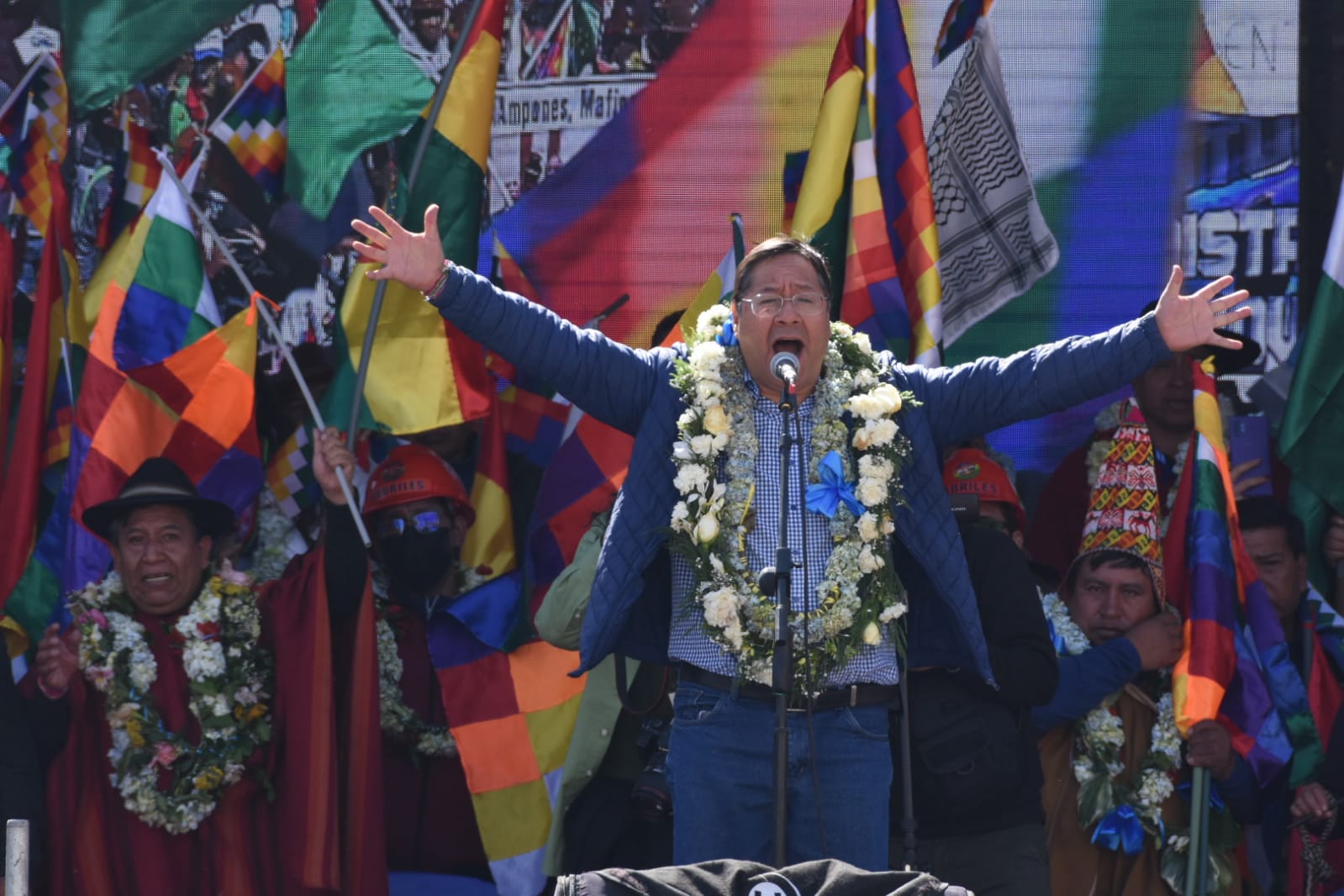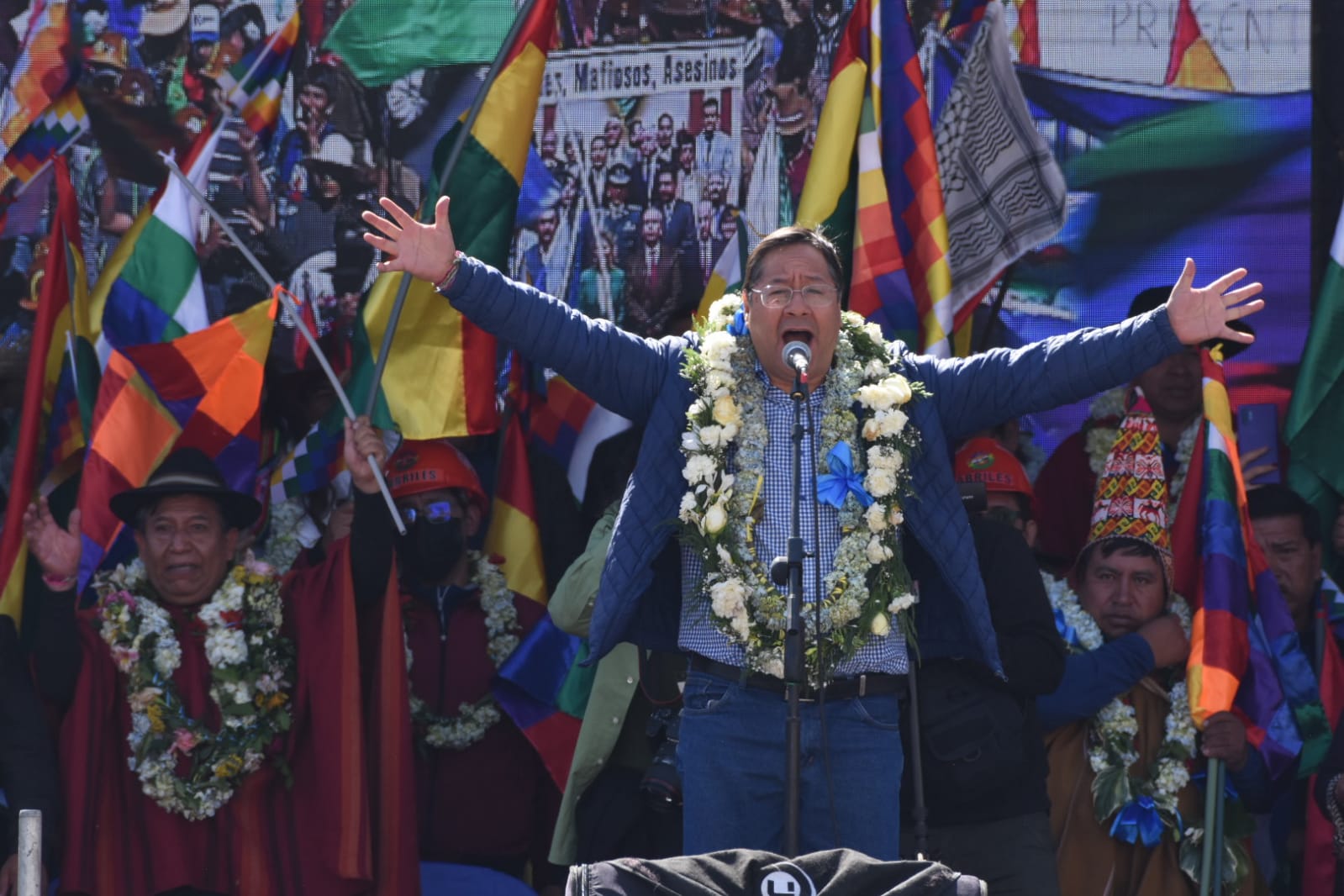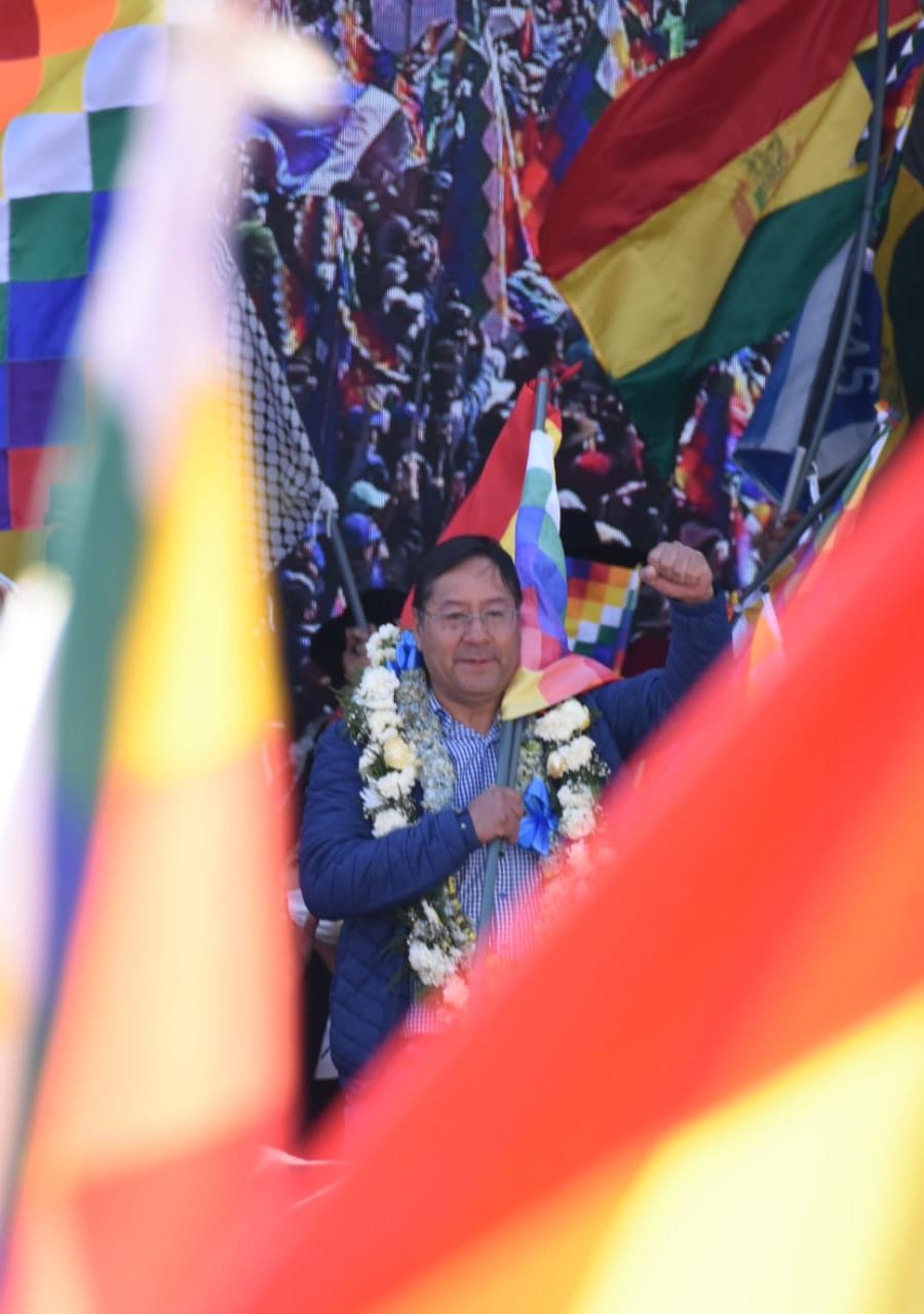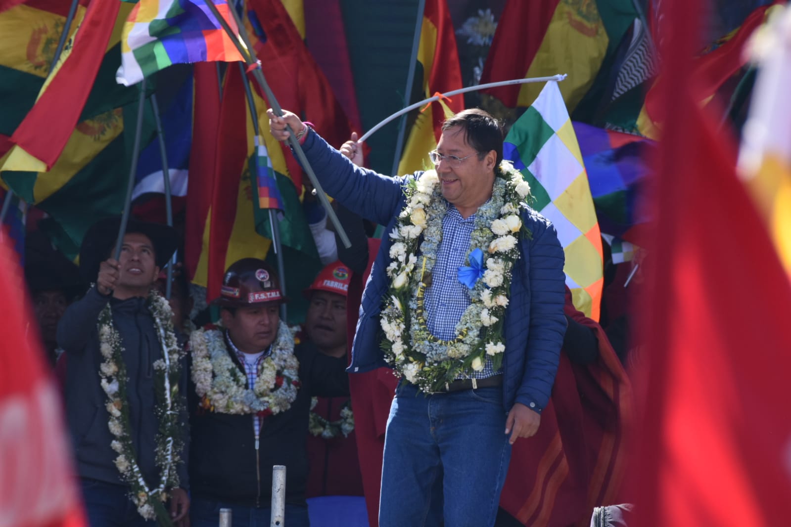 Presidente Luis Arce, Vicepresidente David Choquehuanca y ex Presidente Evo Morales discursan ante la concentración de los marchistas llegados en Defensa de la Democracia y la Reconstrucción Económica