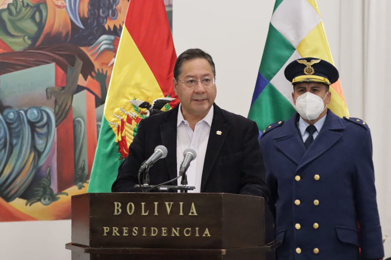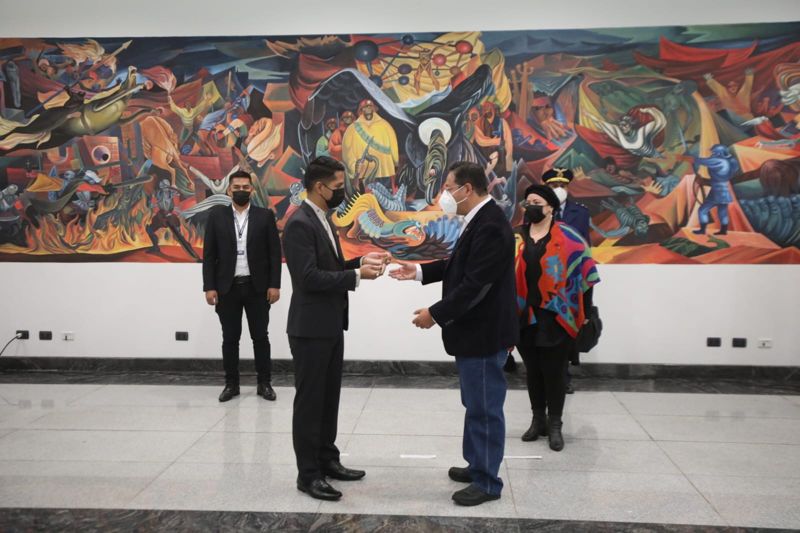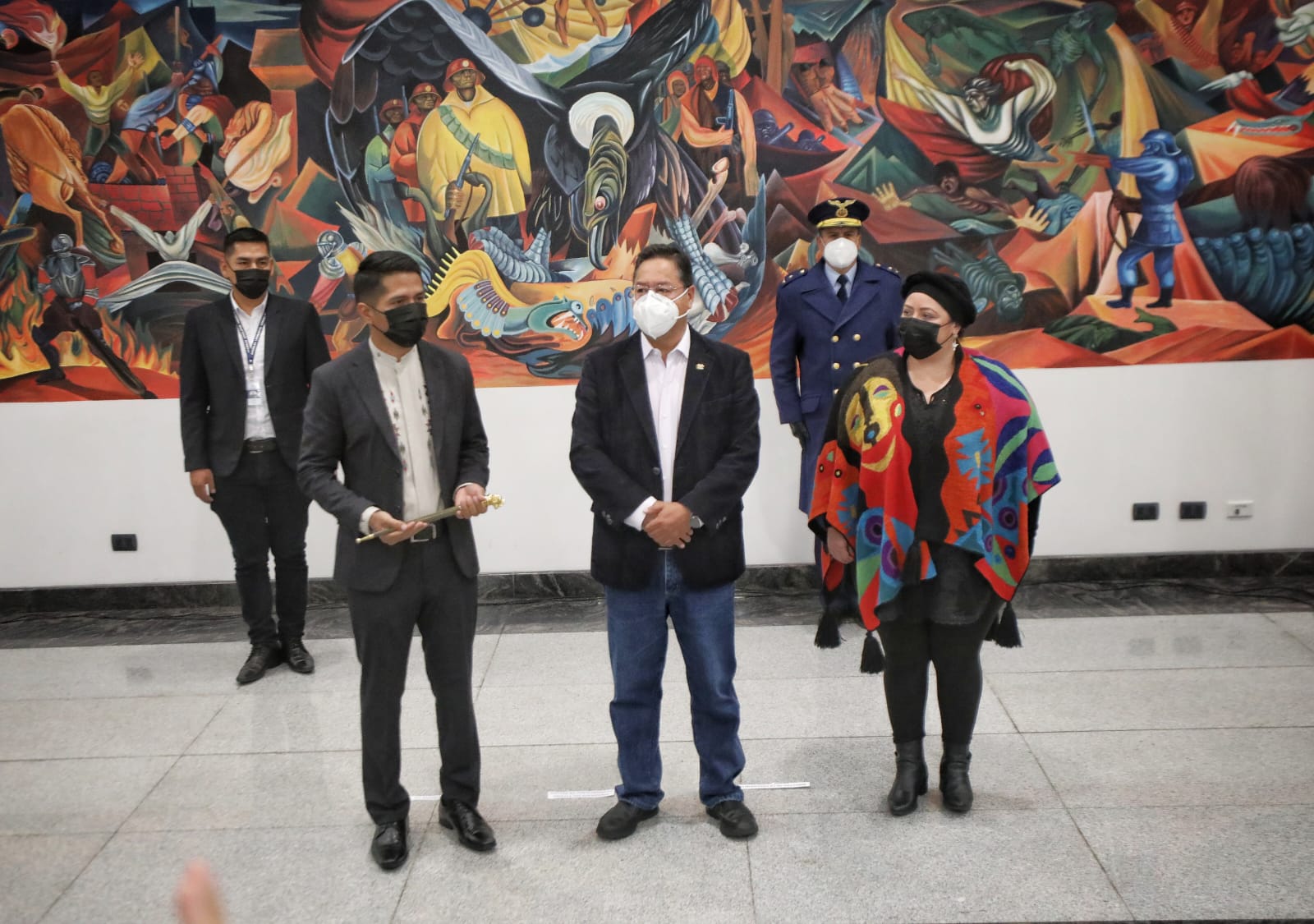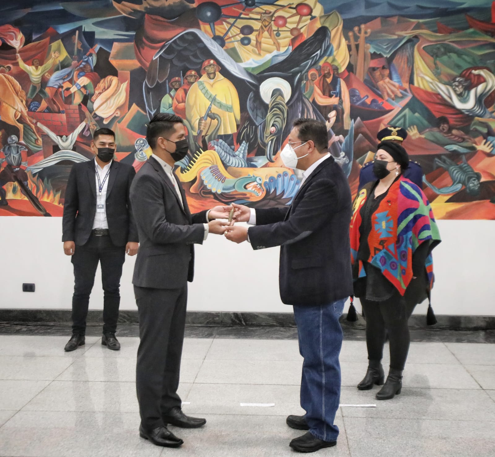 El presidente, Luis Alberto Arce Catacora, hace entrega del Bastón de Mando al presidente de la Cámara de Senadores, Andrónico Rodríguez, para viajar al 77 periodo de sesiones de las Naciones Unidas en EUA