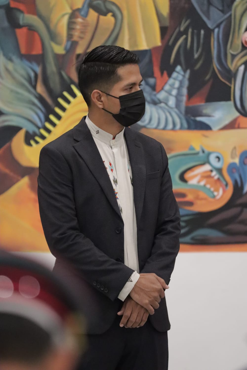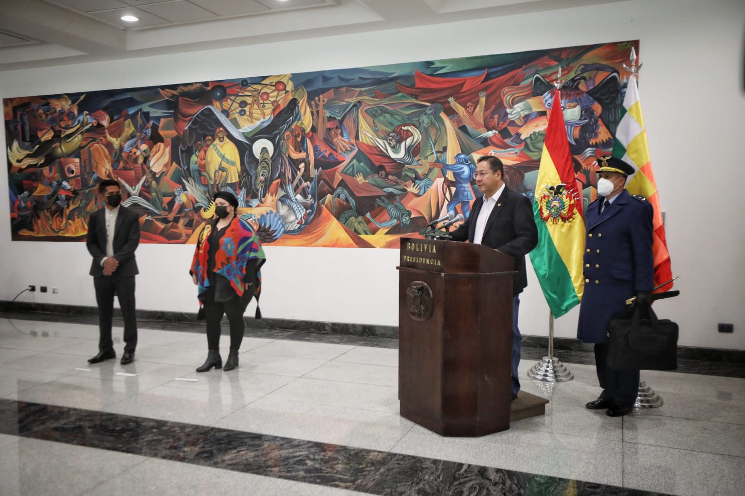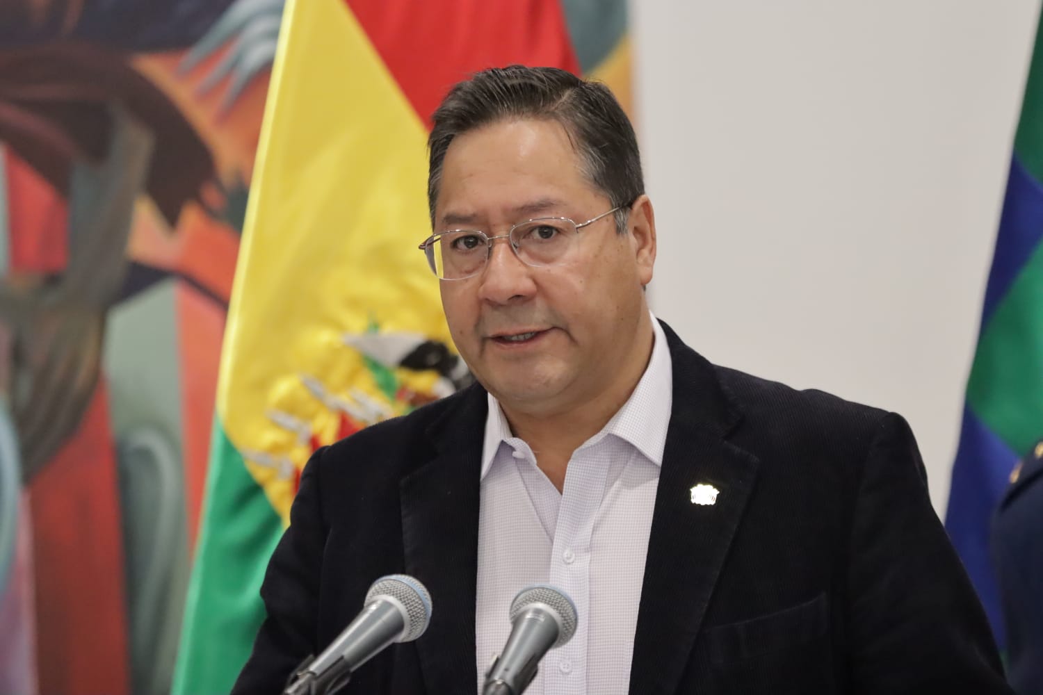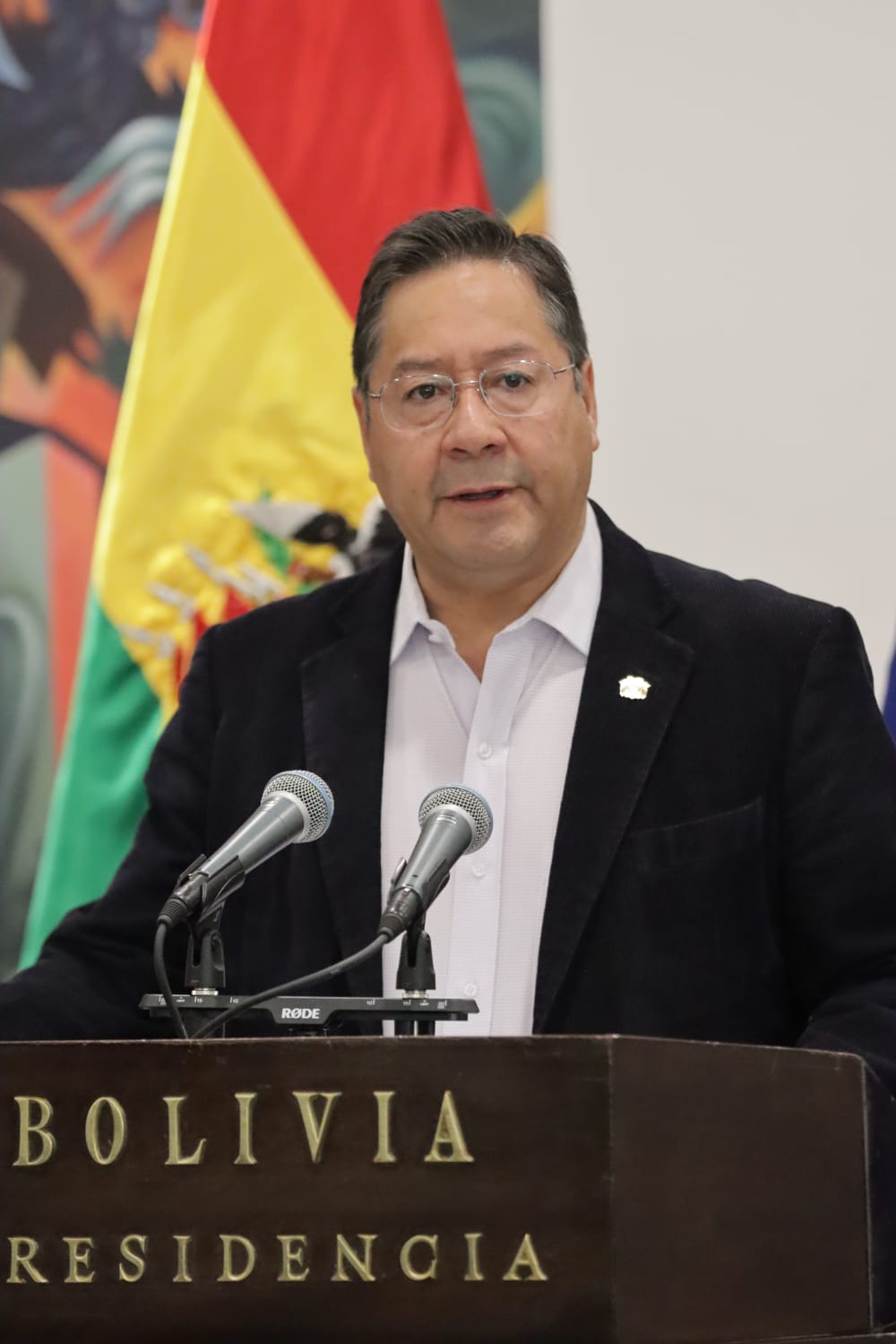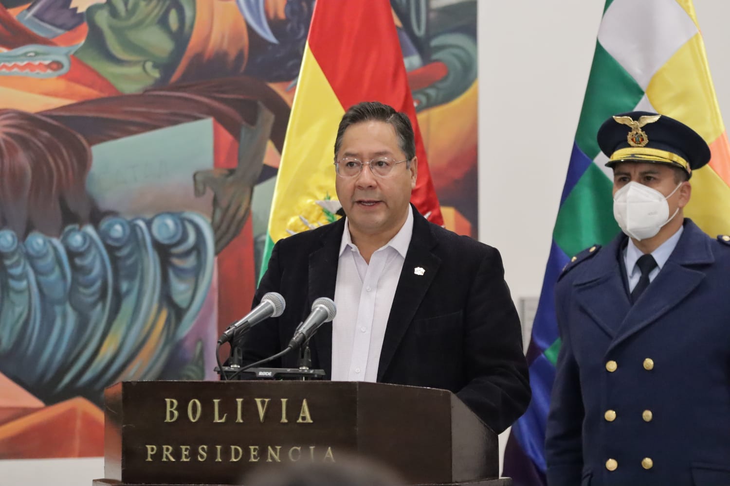 El presidente, Luis Alberto Arce Catacora, hace entrega del Bastón de Mando al presidente de la Cámara de Senadores, Andrónico Rodríguez, para viajar al 77 periodo de sesiones de las Naciones Unidas en EUA