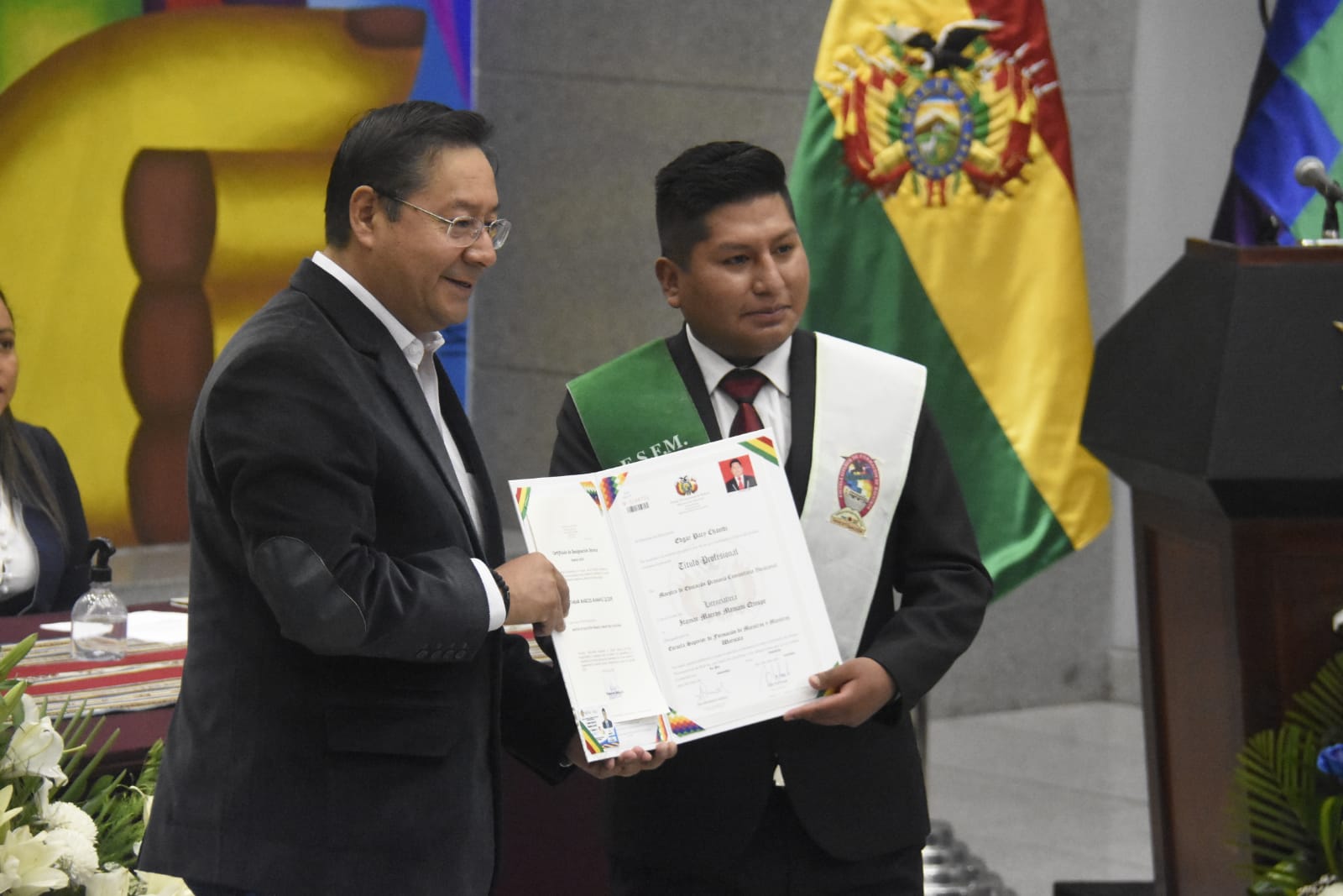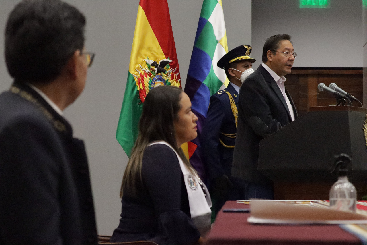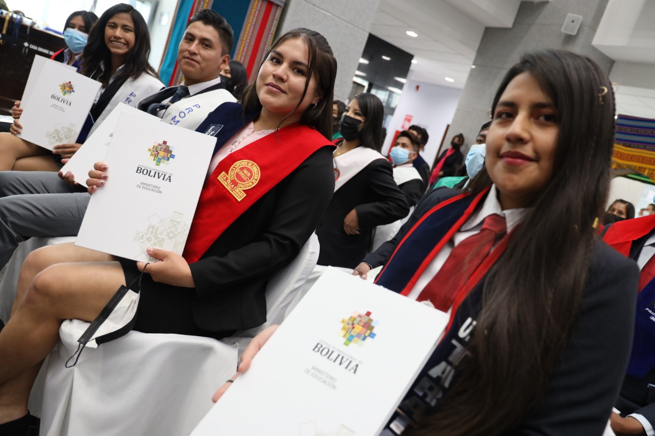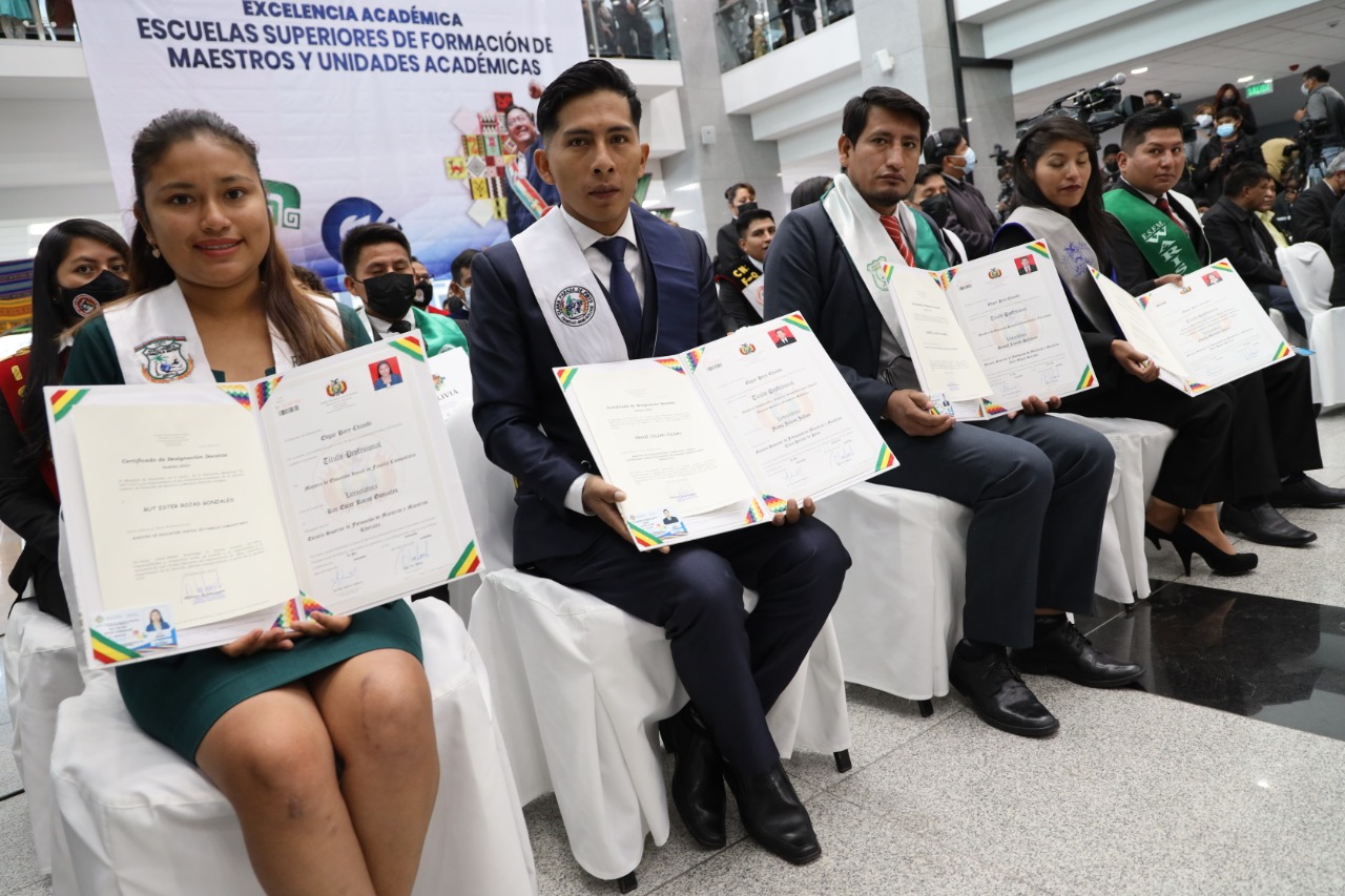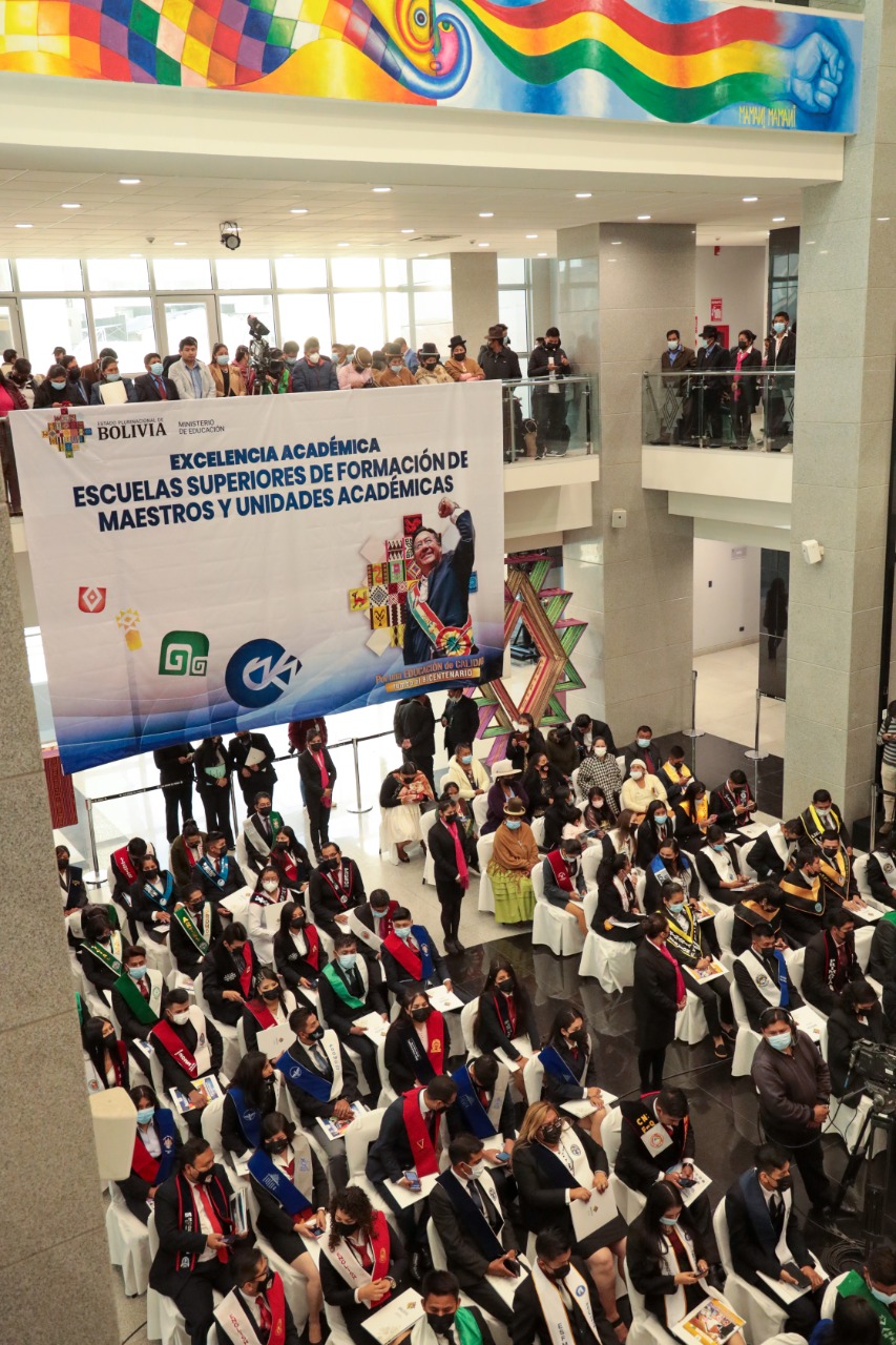 El Presidente Luis Arce realizó la entrega de certificados de excelencia a maestros y maestras de las institutos superiores de formaciones de maestros (1/2)