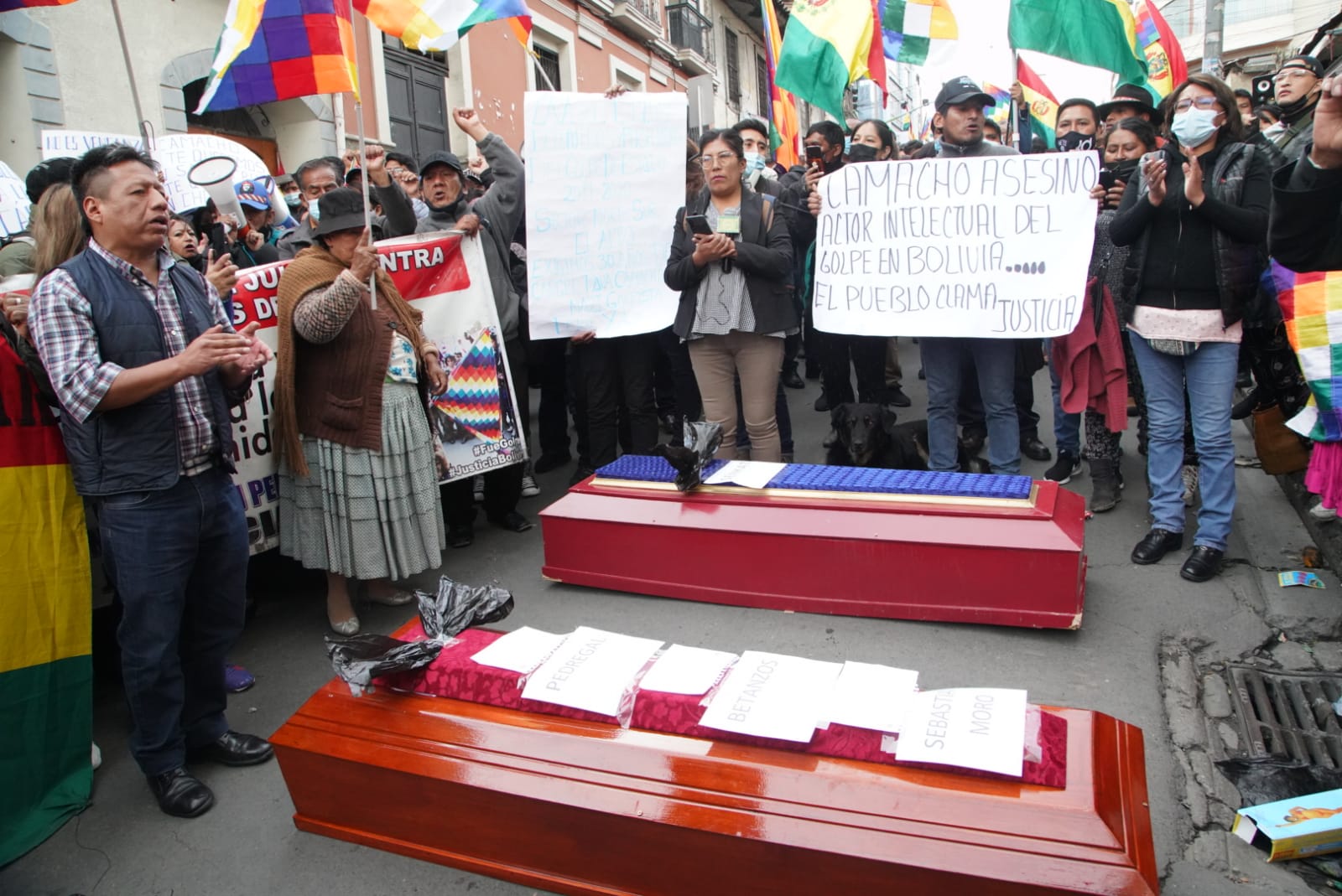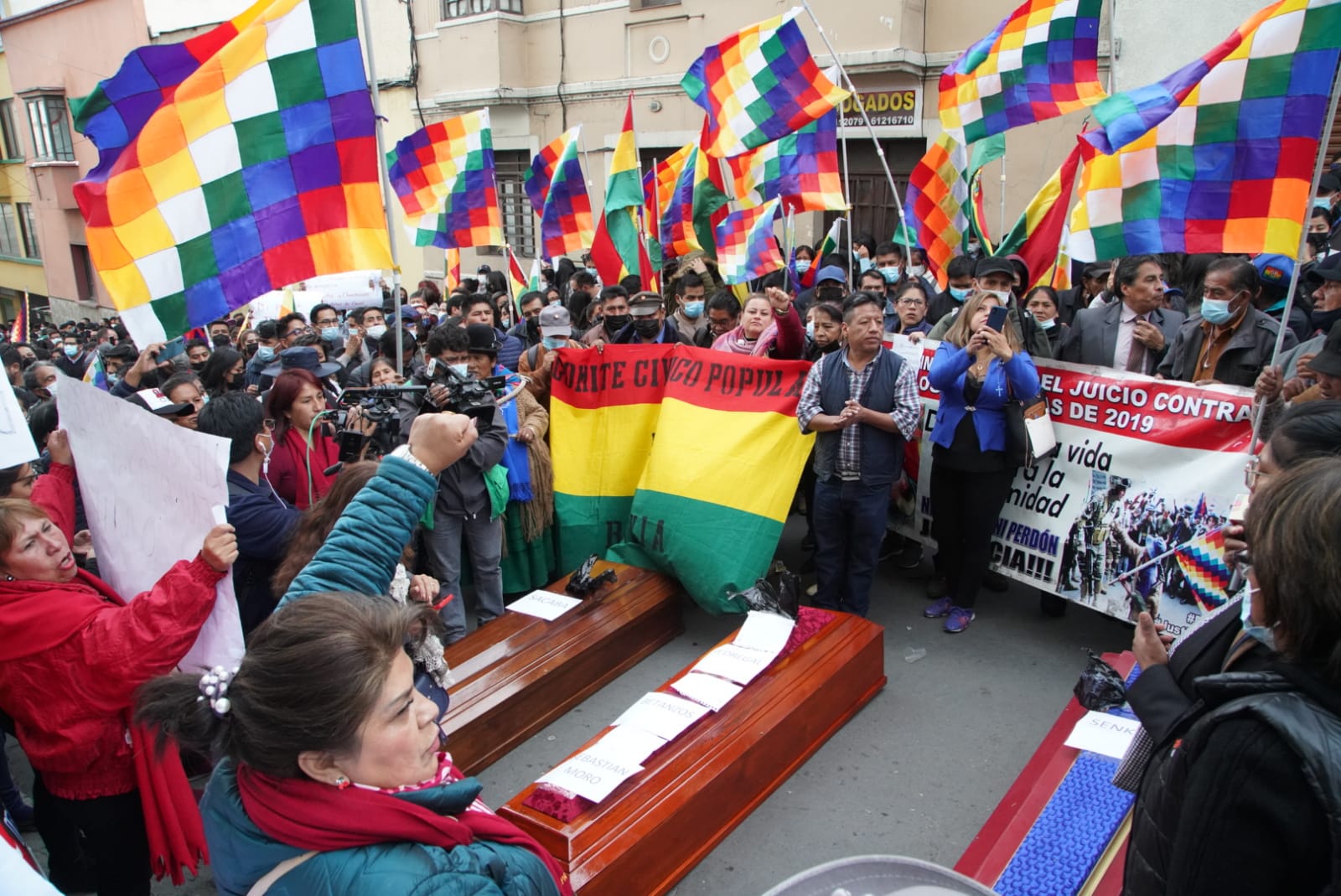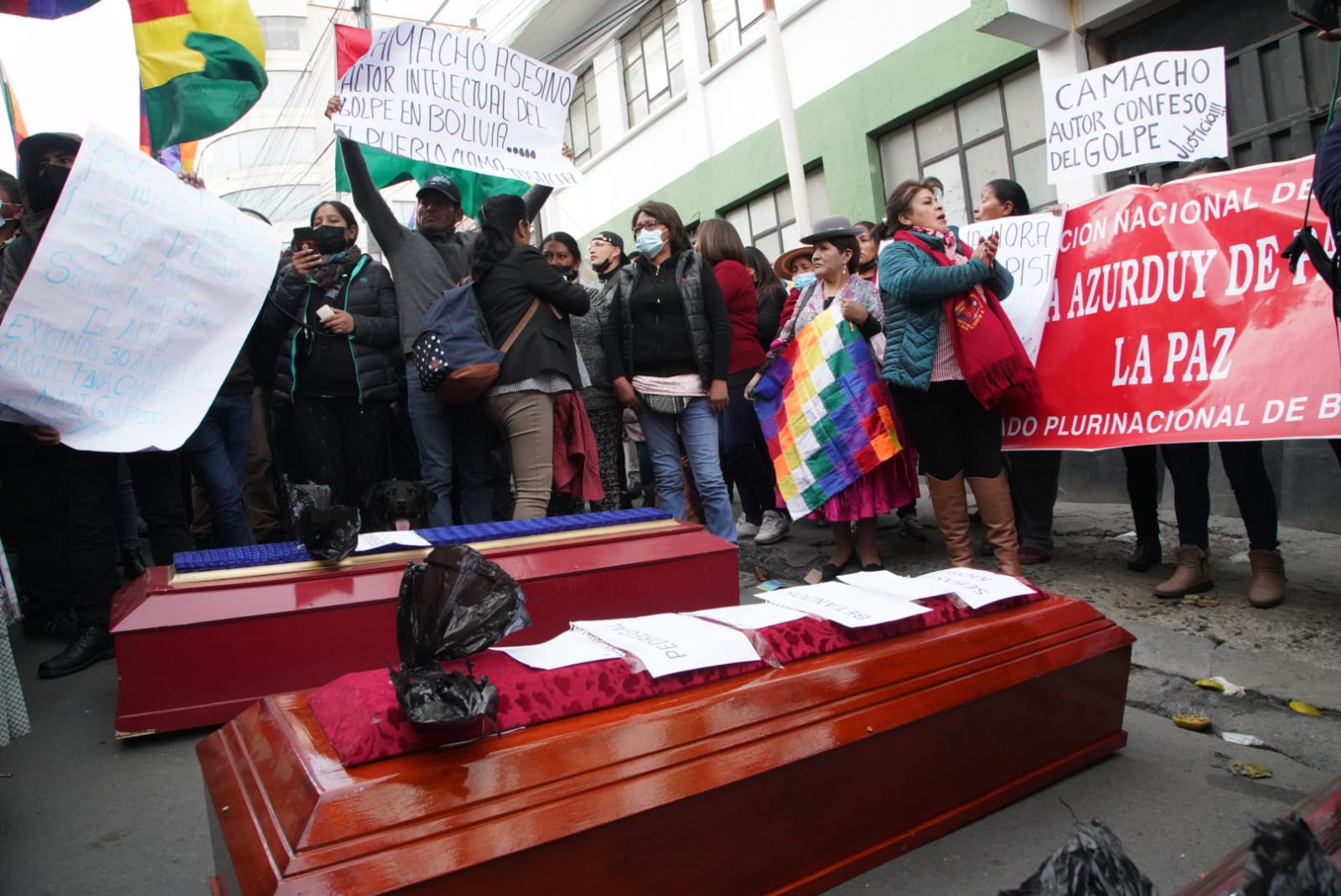 Familiares de las víctimas y heridos de las masacres de Senkata, Sacaba y Huallani instalan vigilia en puertas de la FELCC de La Paz y piden cárcel para Luis Fernando Camacho por el caso Golpe de Estado I