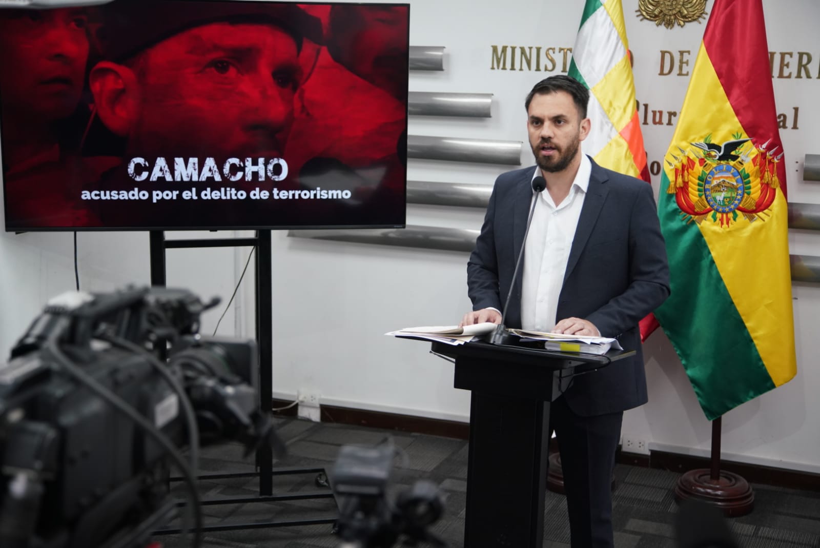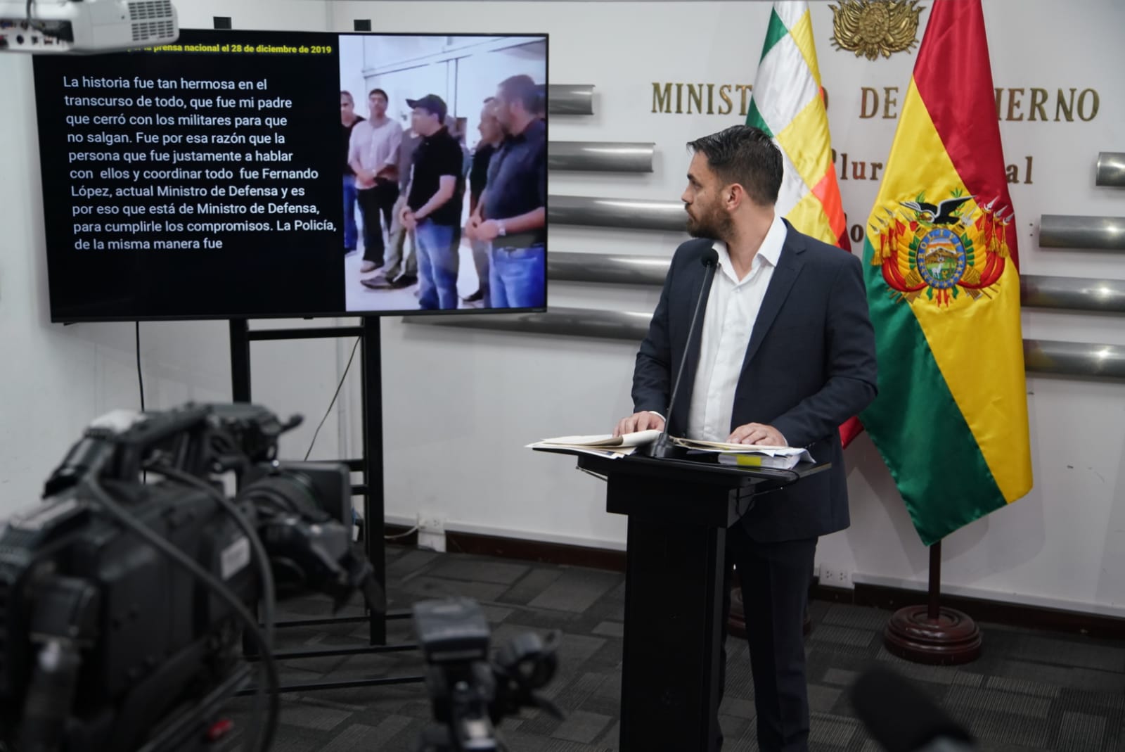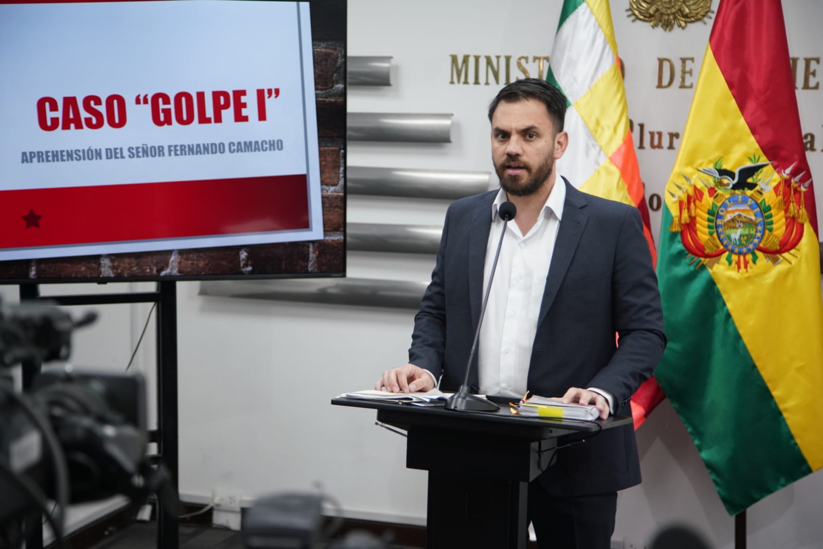 El ministro de Gobierno, Eduardo Del Castillo, brindo conferencia de prensa sobre la aprehensión de Luis Fernando Camacho por el Casó Golpe de Estado IUsuario ABIGalería Fotográfica 04 Enero 2023 Visto: 10581ShareTwittearshare with Whatsappshare with Telegram Fotos Jorge MamaniAnteriorSiguiente
