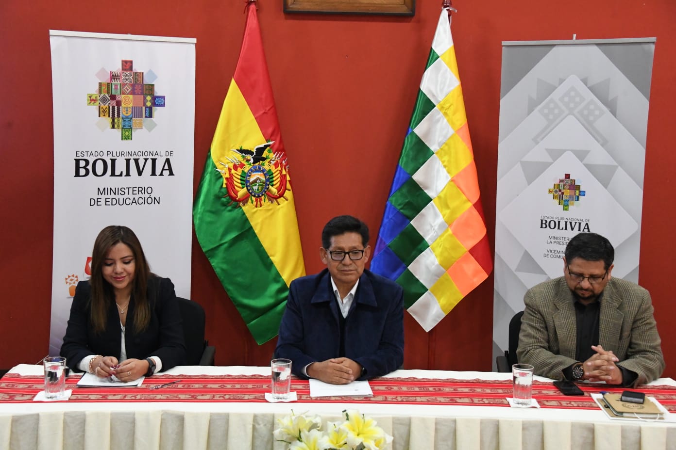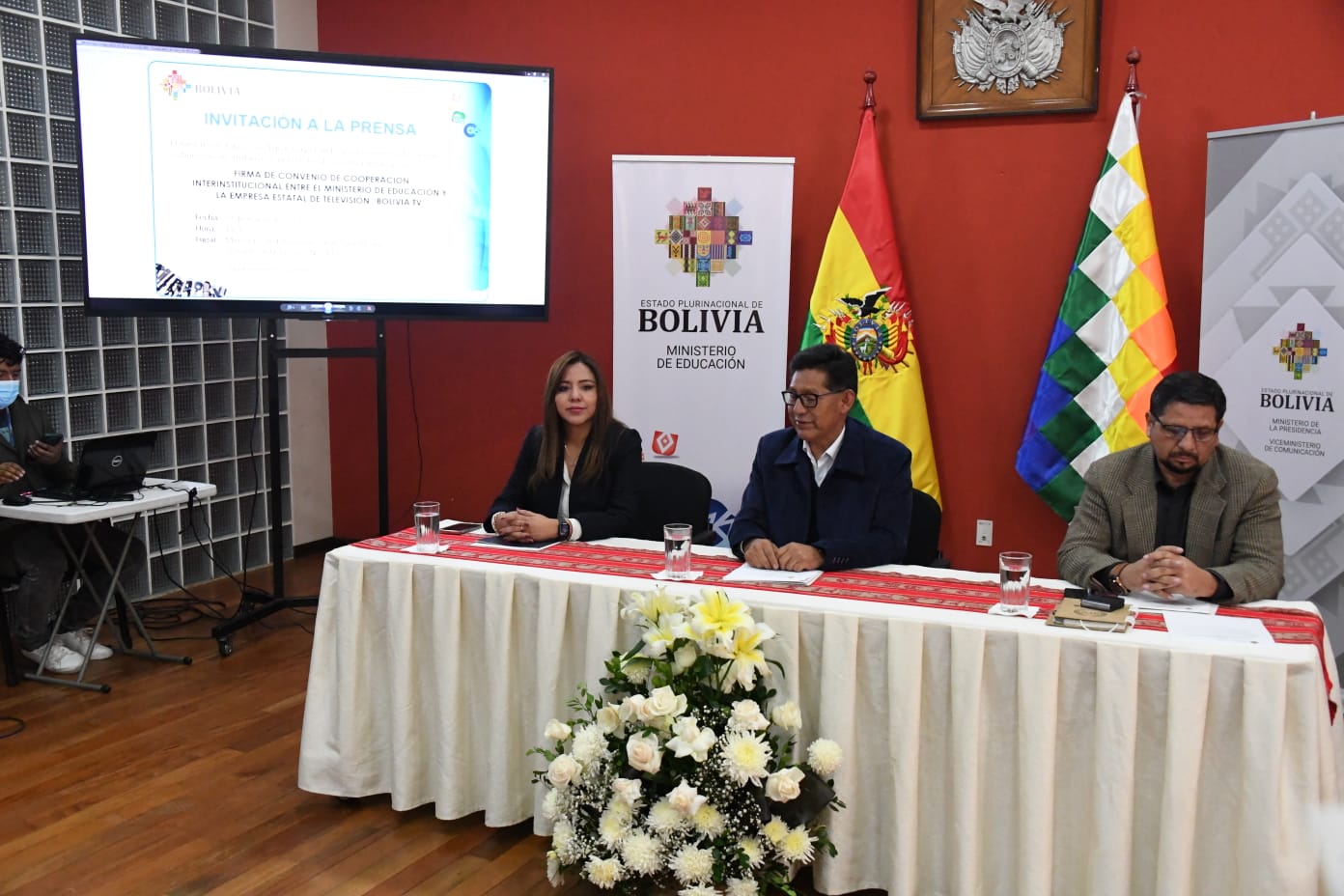 El ministro de Educación, Edgar Pary Chambi, y la viceministra de Comunicación, Gabriela Alcón firmaron el convenio de cooperación interinstitucional entre el ministerio de Educación y la empresa estatal de televisión Bolivia TV