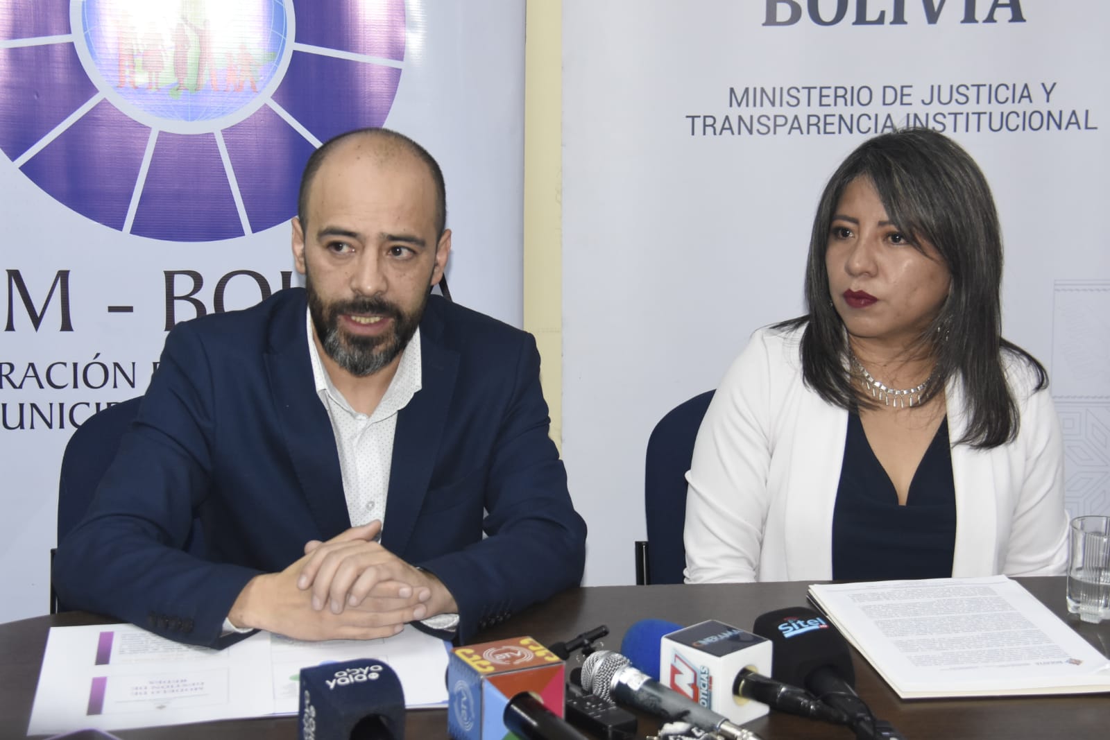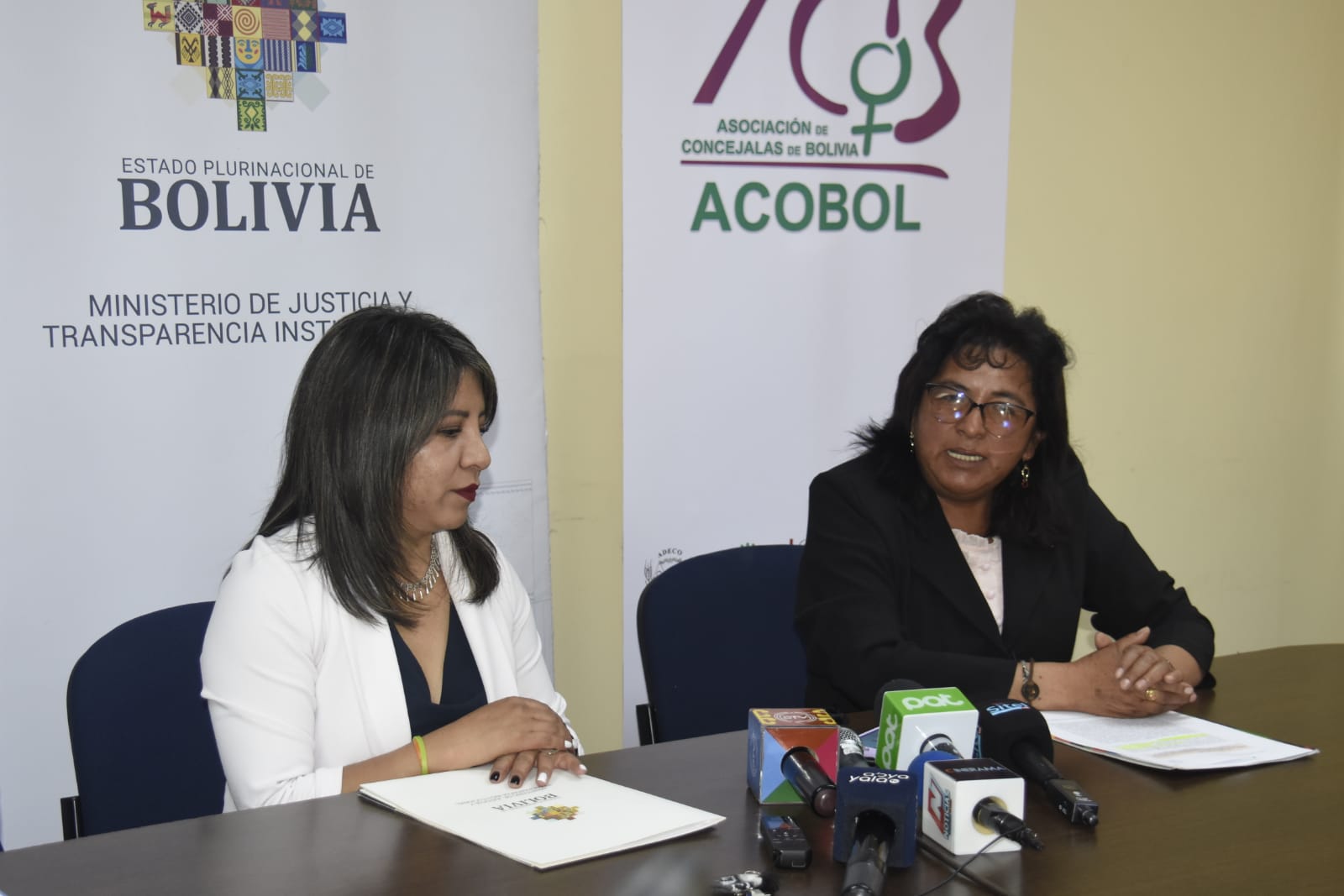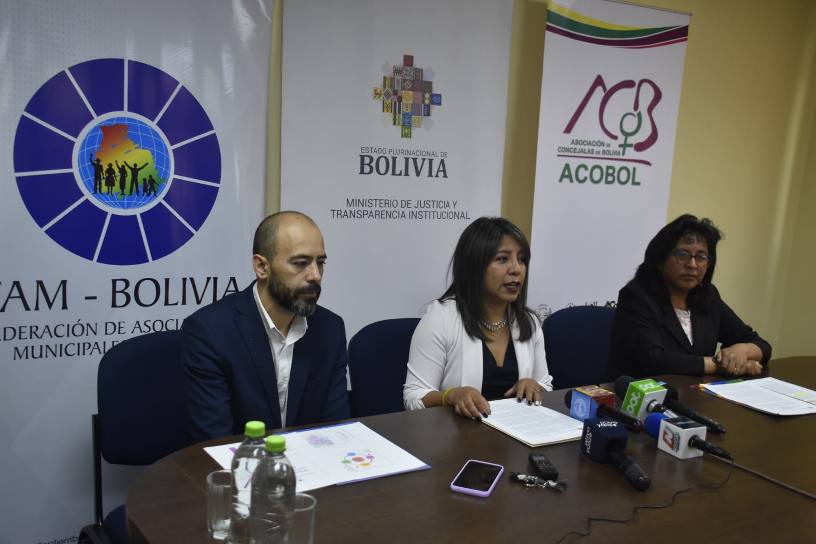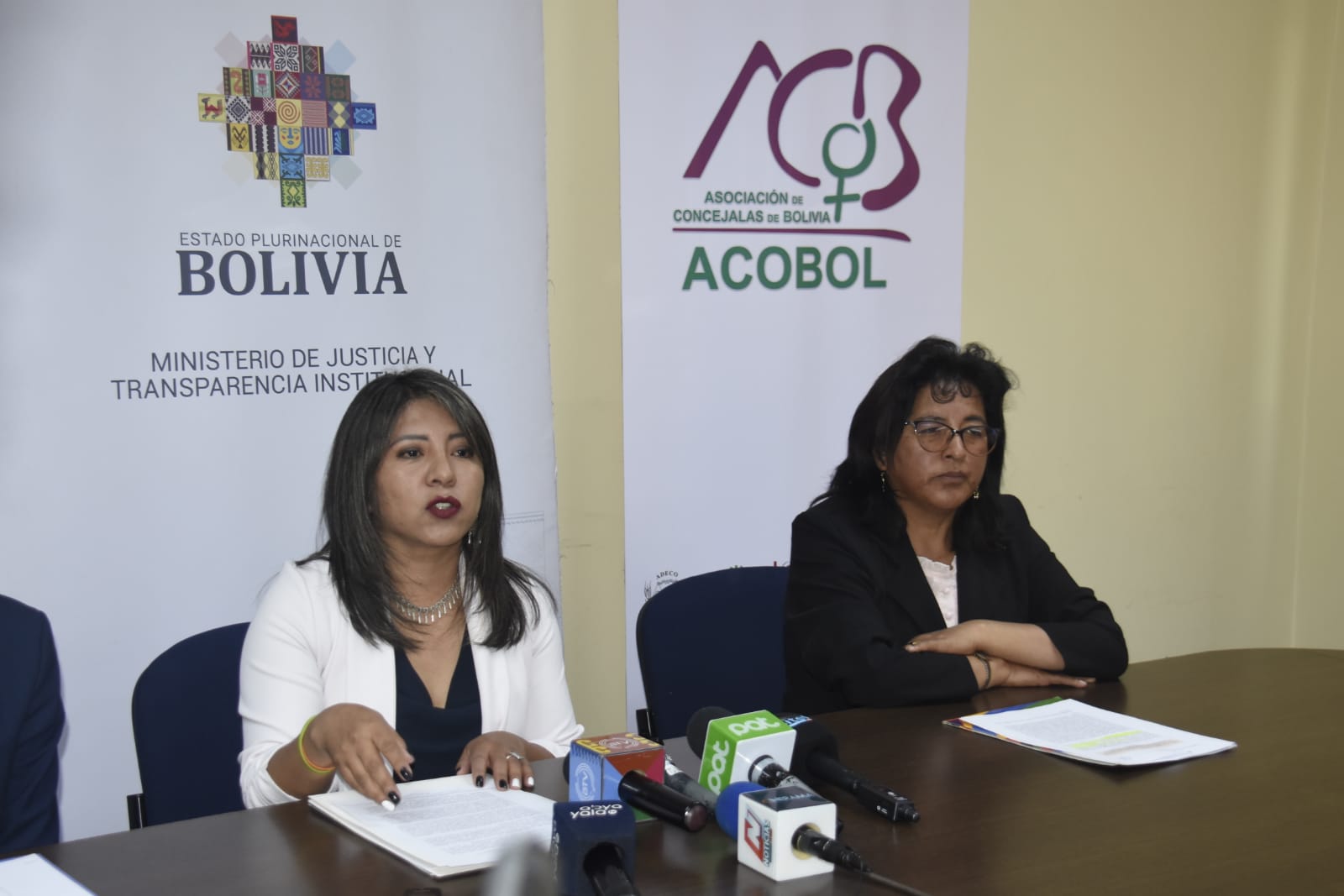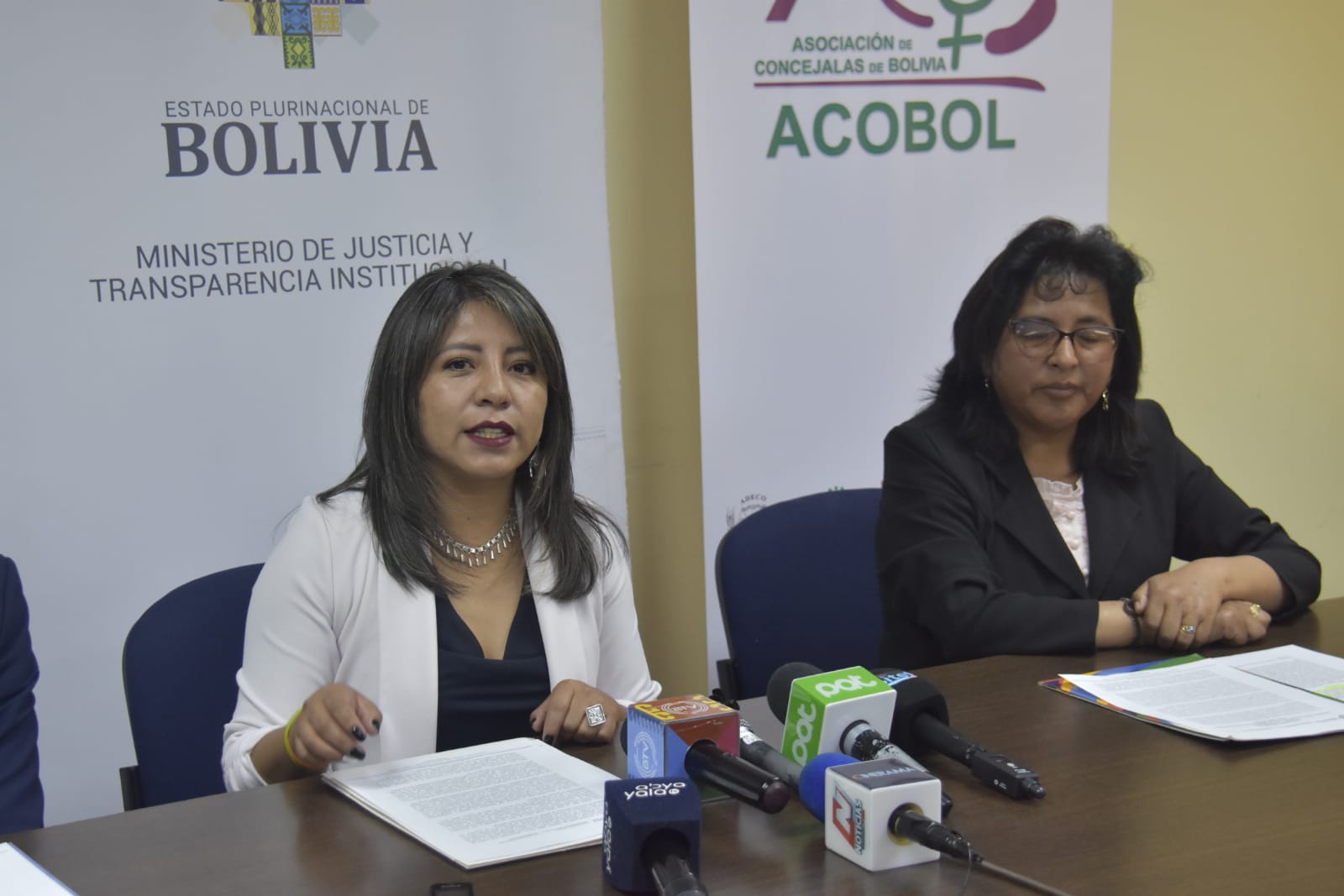 Viceministra de igualdad de oportunidades, Nadia Cruz en conferencia de prensa junto a representantes de la ACOBOL y FAM