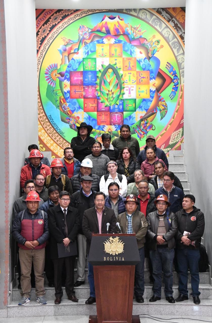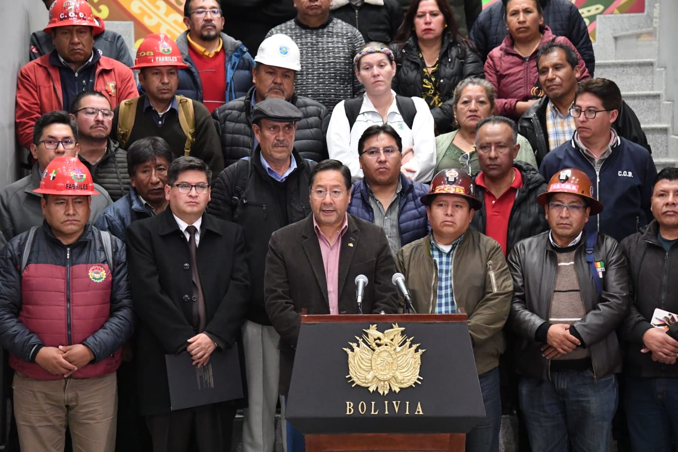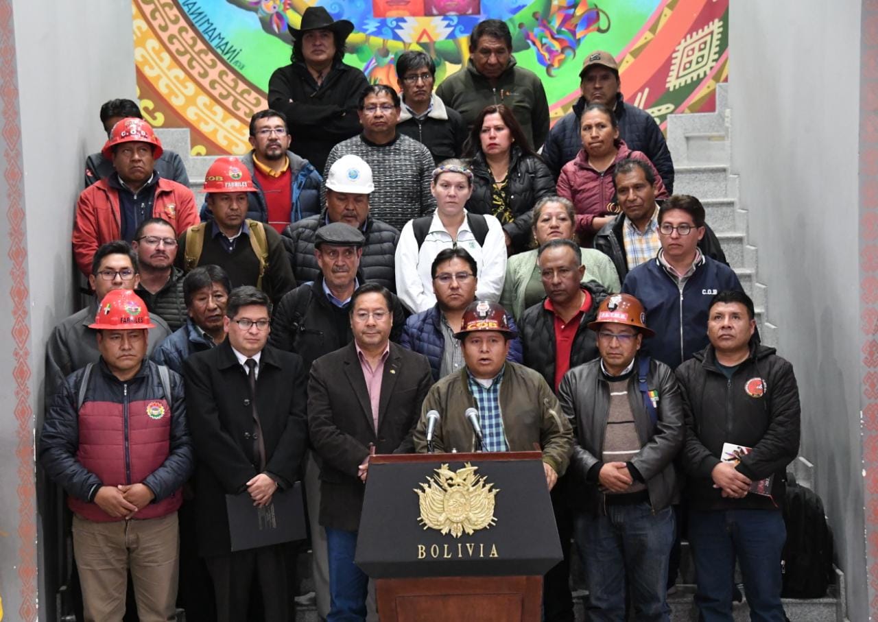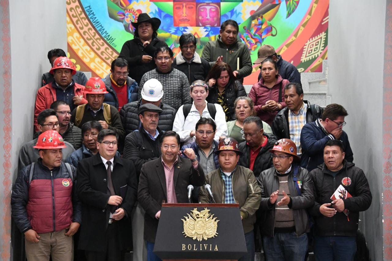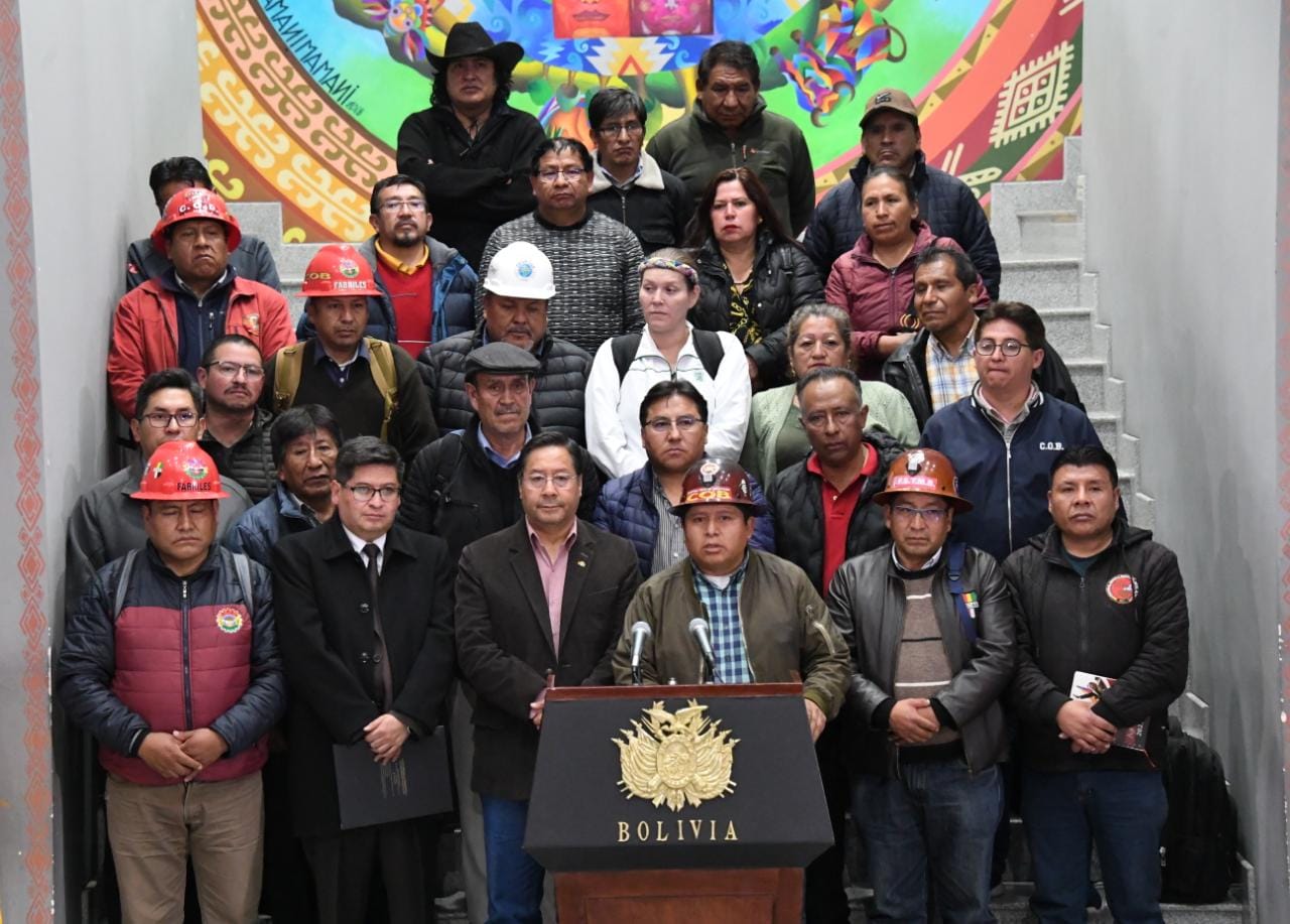 Gobierno y la Central Obrera Boliviana (COB) acuerdan incremento del 3% al haber Básico y 5% al Salario Mínimo Nacional. El presidente Luis Arce junto a los dirigentes de la COB en conferencia de prensa. Foto: Viceministerio de Comunicación