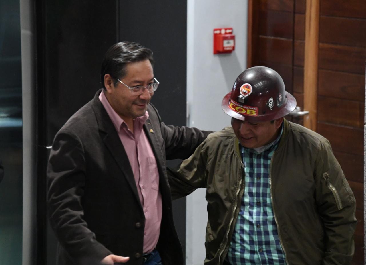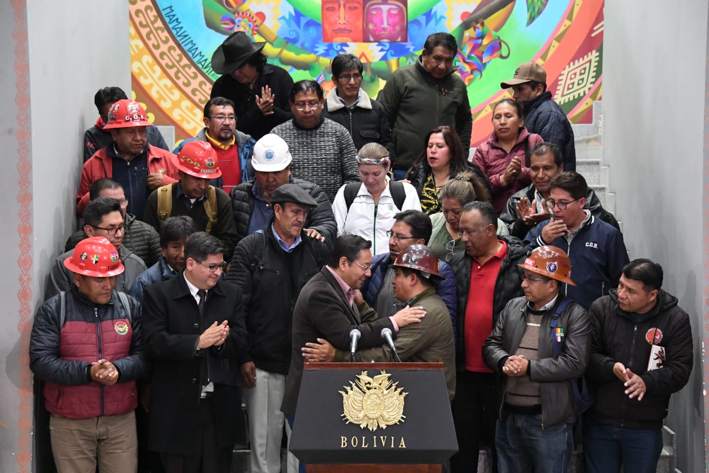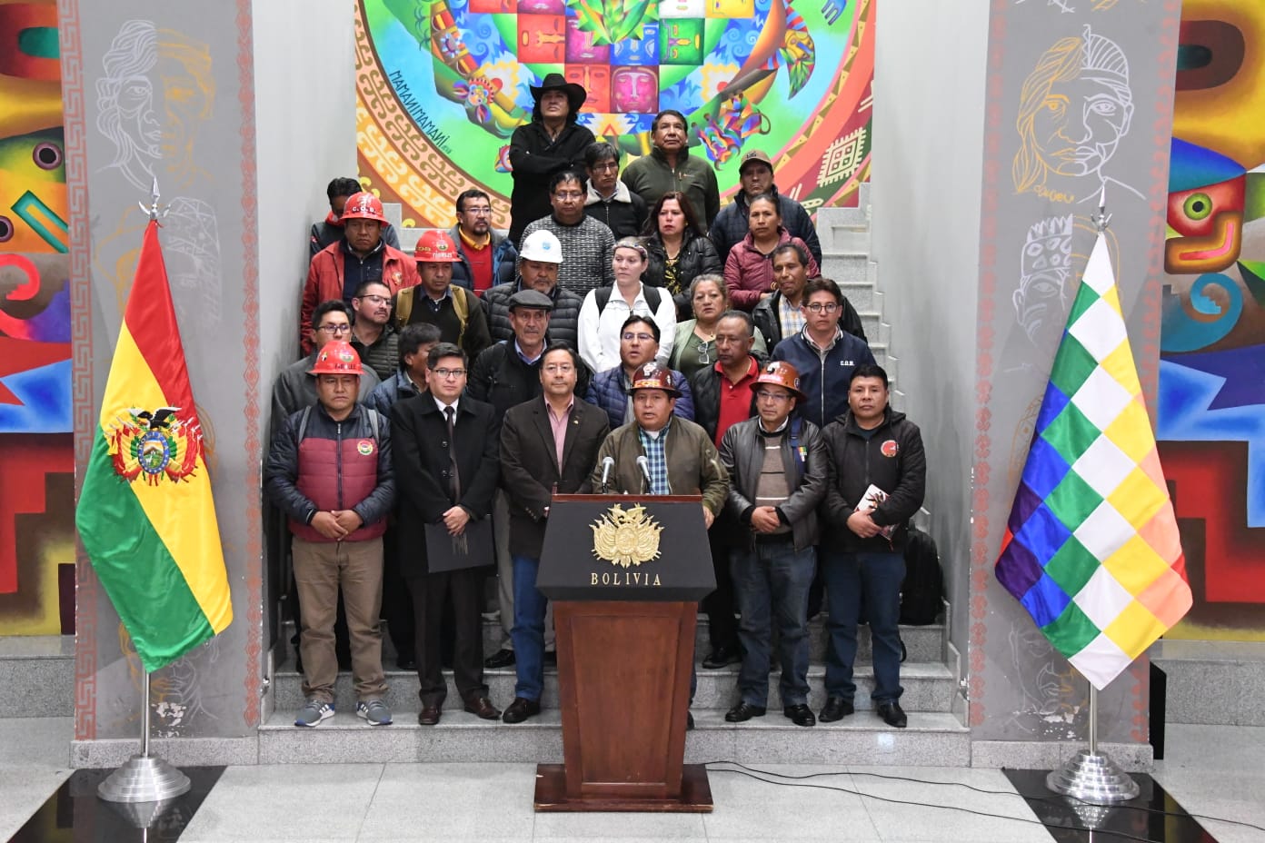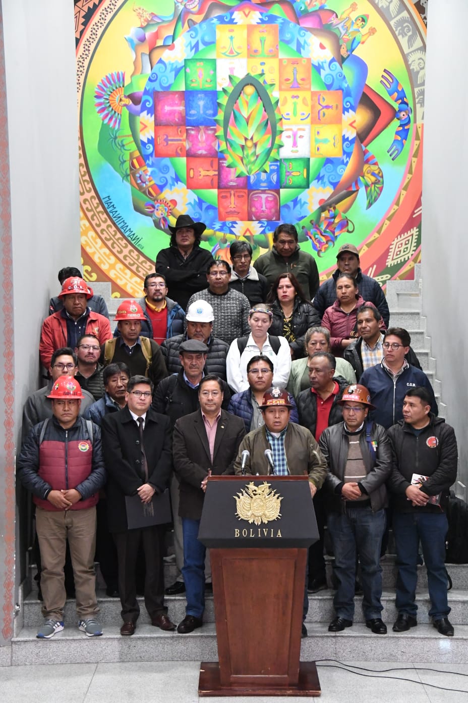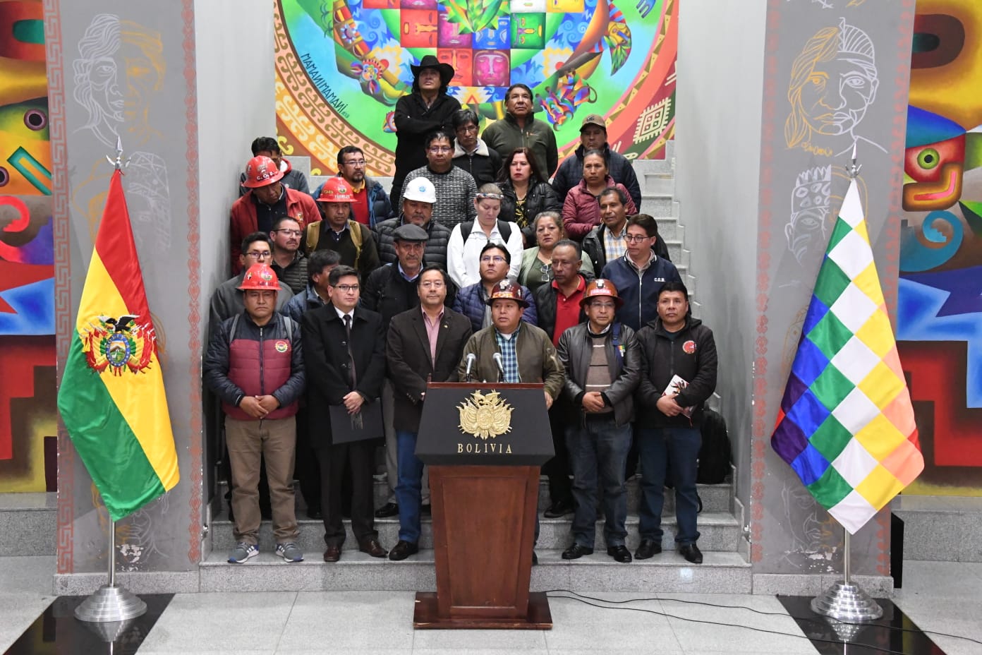 Gobierno y la Central Obrera Boliviana (COB) acuerdan incremento del 3% al haber Básico y 5% al Salario Mínimo Nacional. El presidente Luis Arce junto a los dirigentes de la COB en conferencia de prensa. Foto: Viceministerio de Comunicación