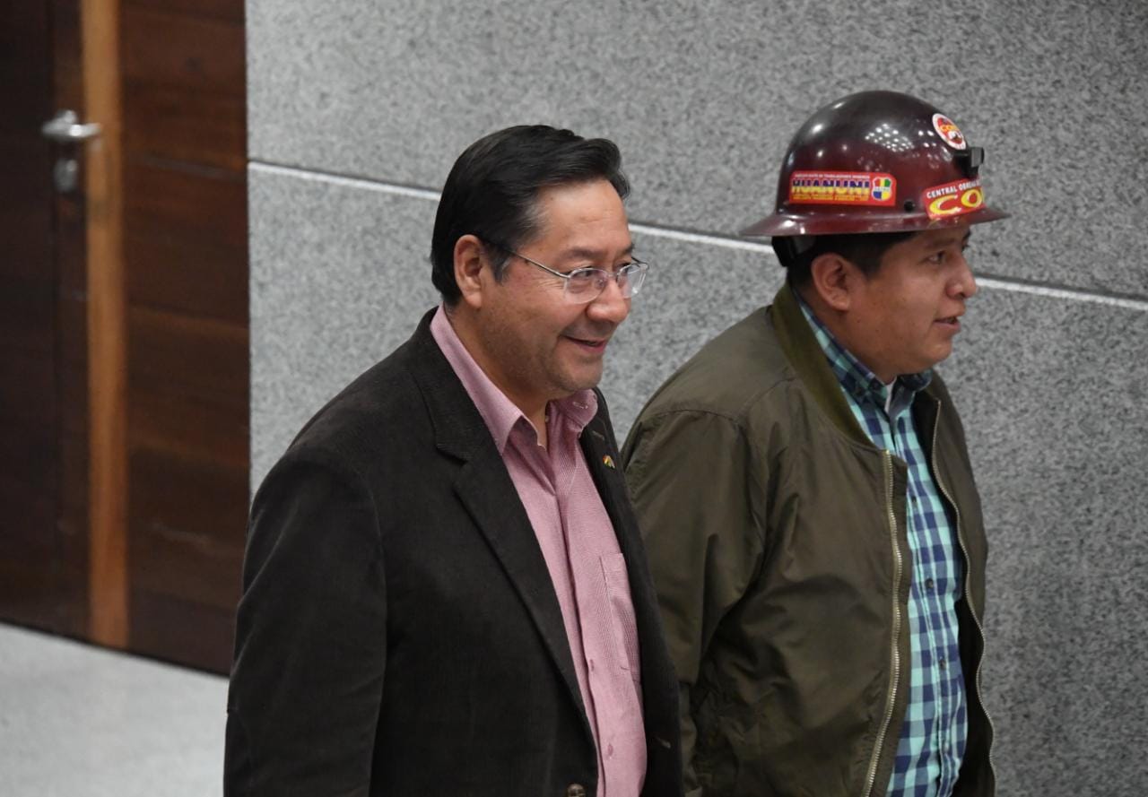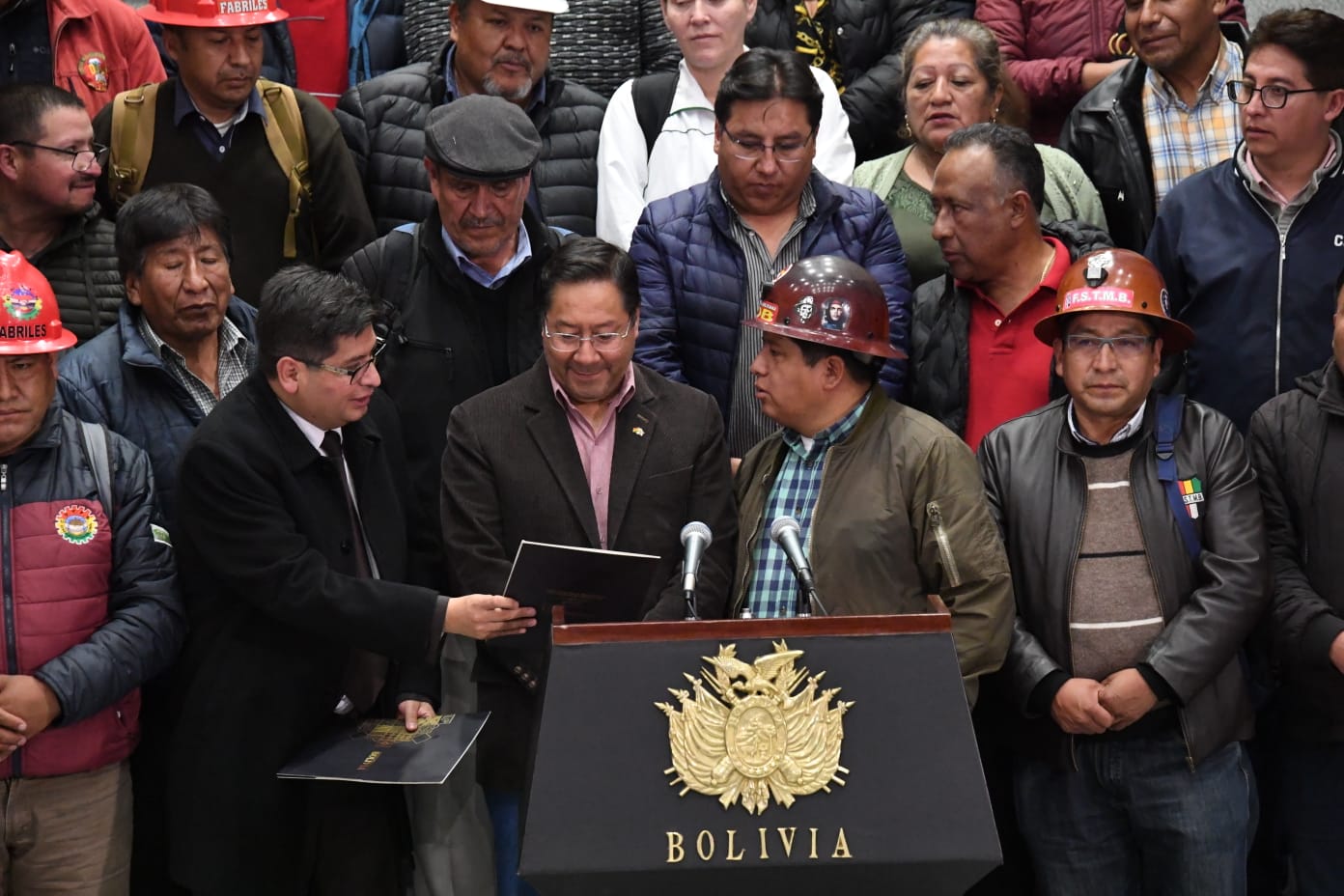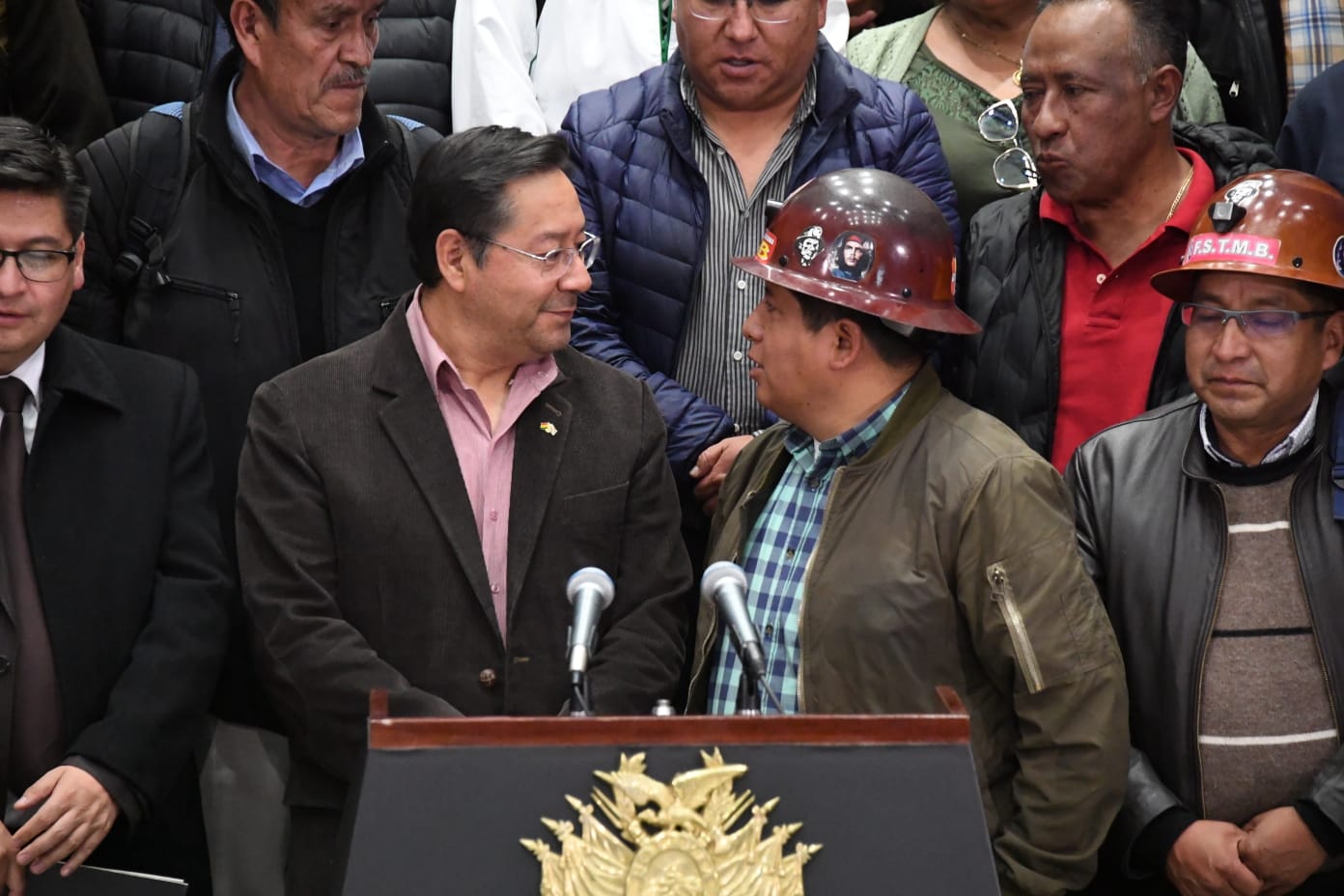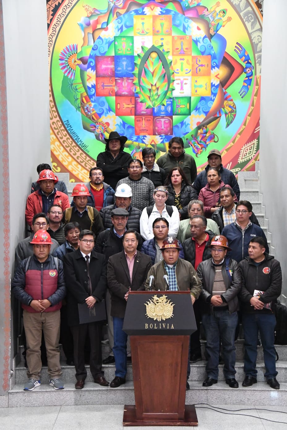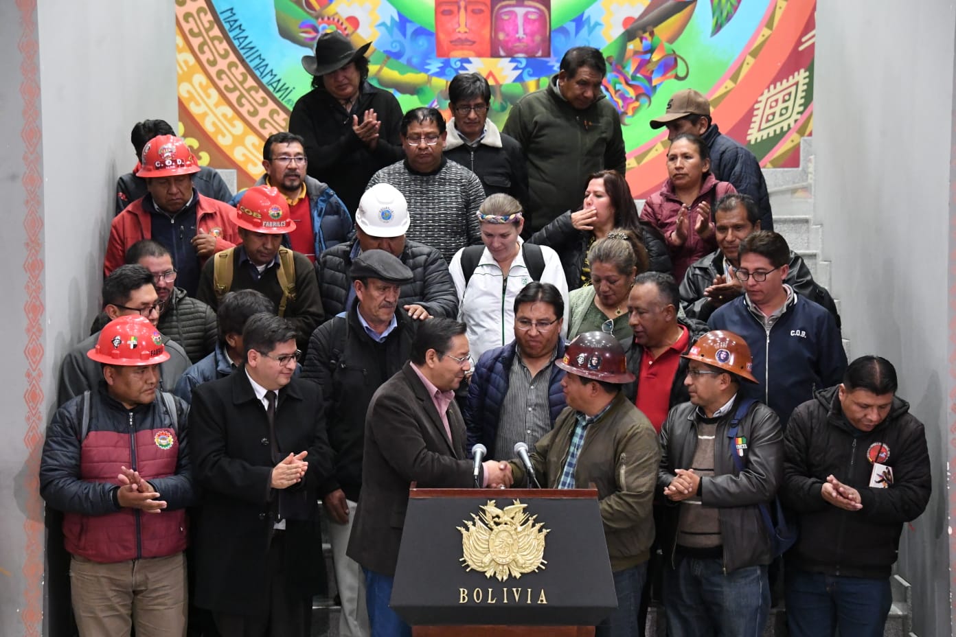 Gobierno y la Central Obrera Boliviana (COB) acuerdan incremento del 3% al haber Básico y 5% al Salario Mínimo Nacional. El presidente Luis Arce junto a los dirigentes de la COB en conferencia de prensa. Foto: Viceministerio de Comunicación