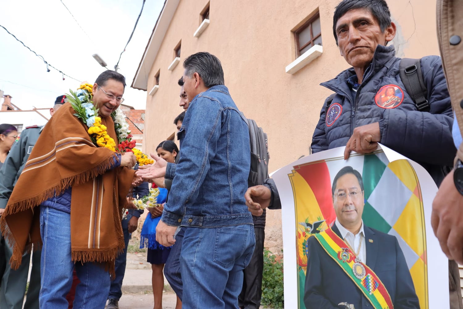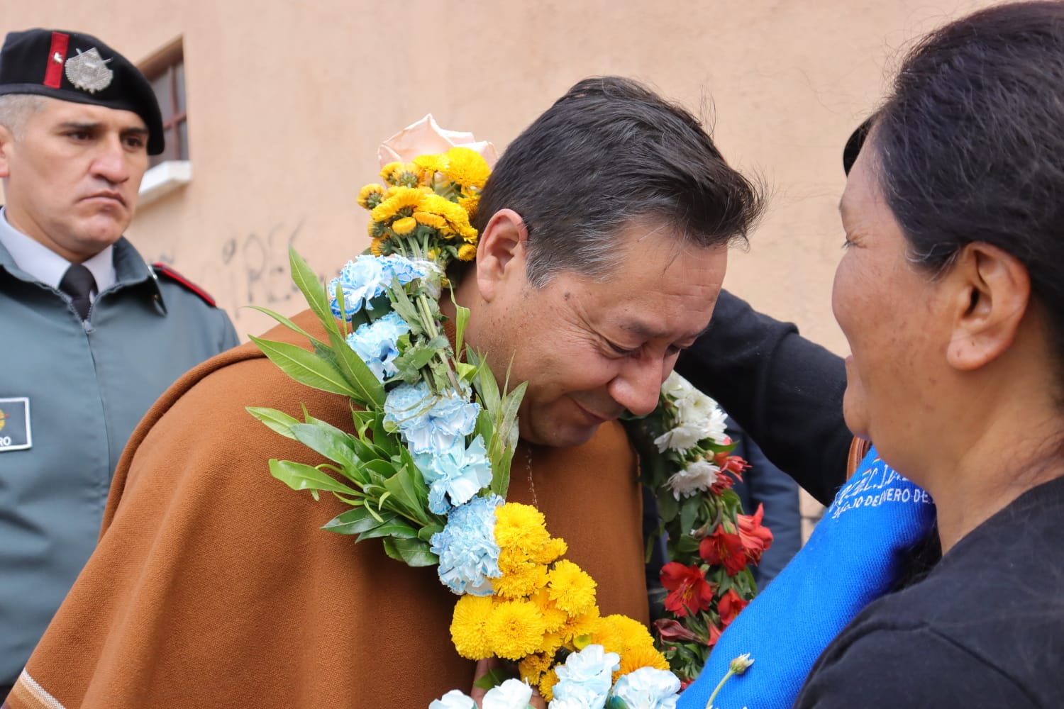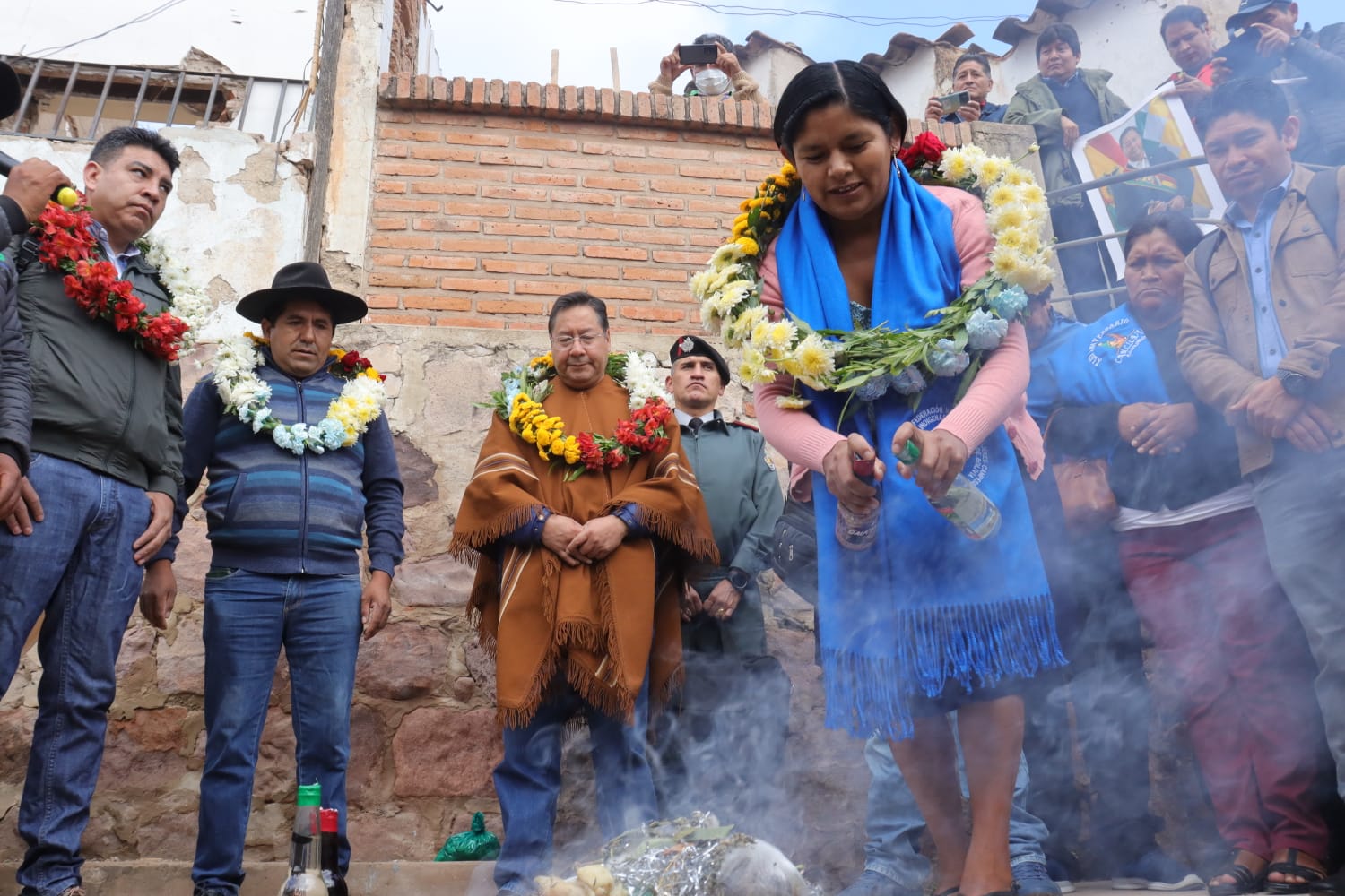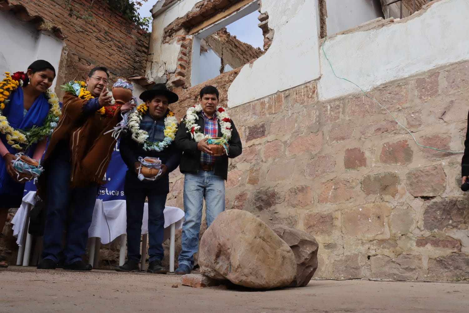 El Presidente del Estado Luis Arce coloca la piedra fundamental para la construcción de la Casa de Acogida "Kampu-Wawqimanta", en Sucre. Fuente: Comunicación Presidencial