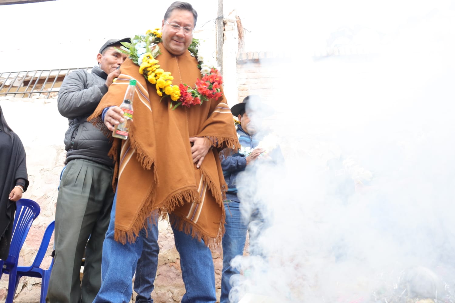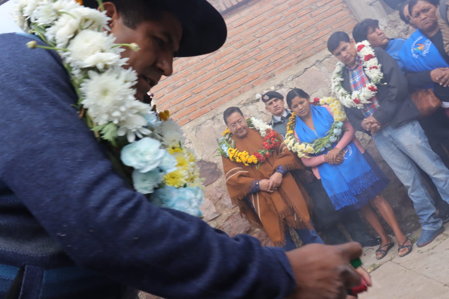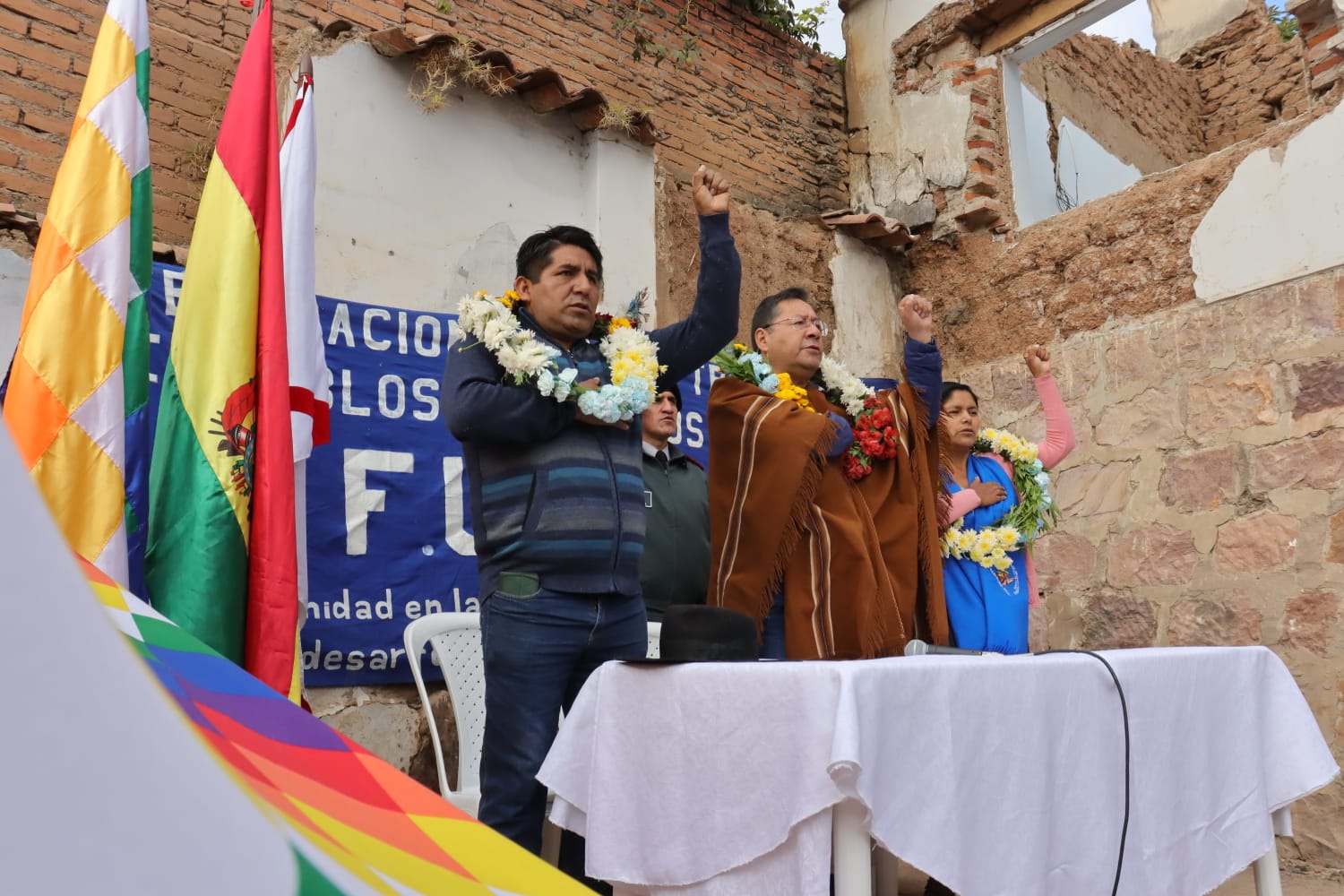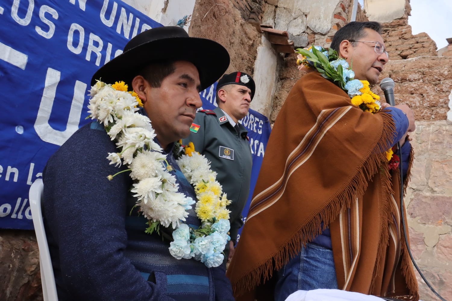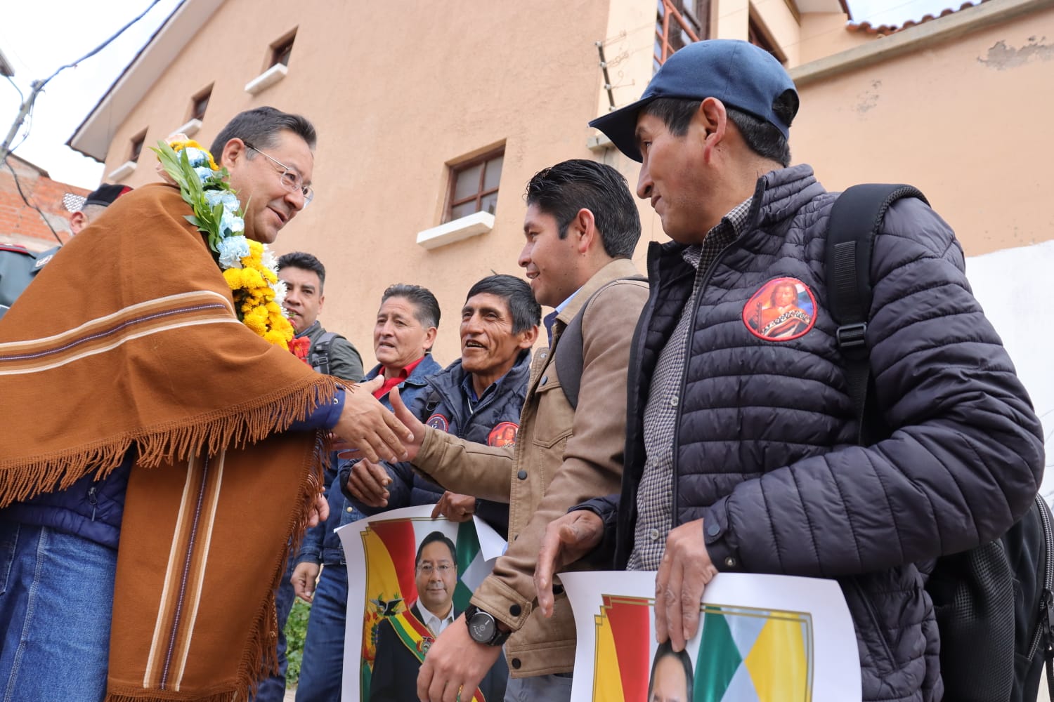 El Presidente del Estado Luis Arce coloca la piedra fundamental para la construcción de la Casa de Acogida "Kampu-Wawqimanta", en Sucre. Fuente: Comunicación Presidencial