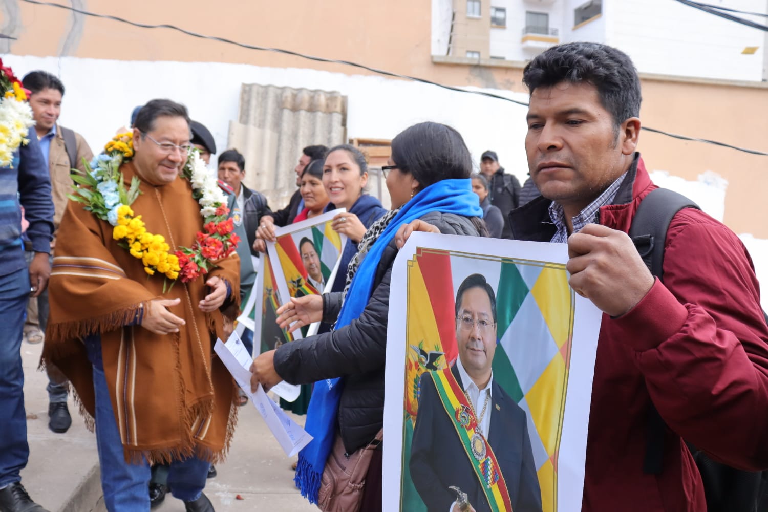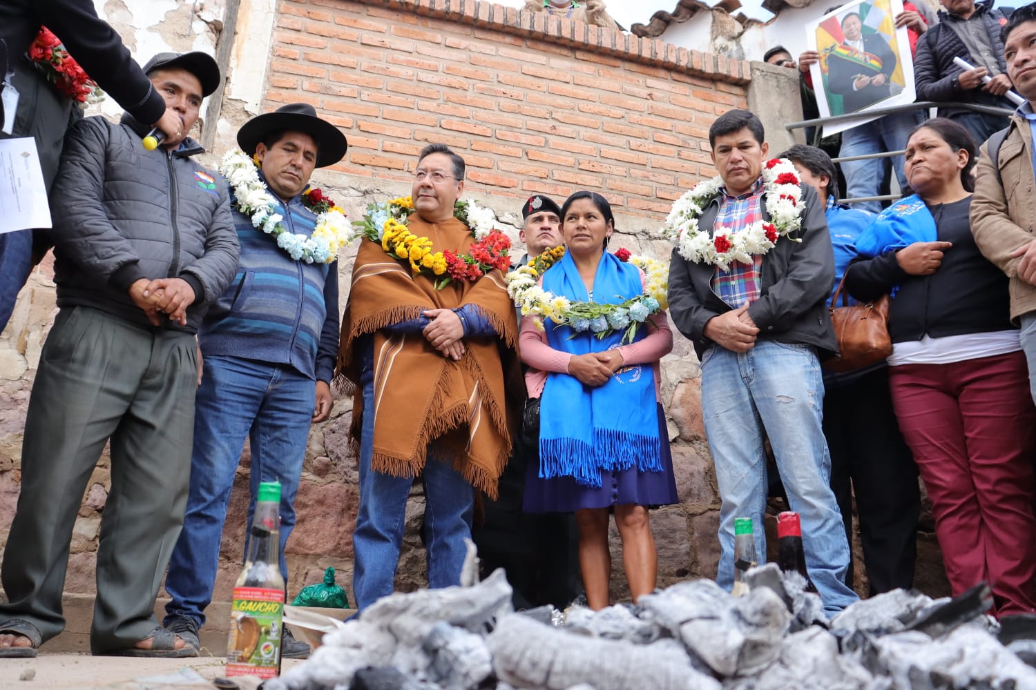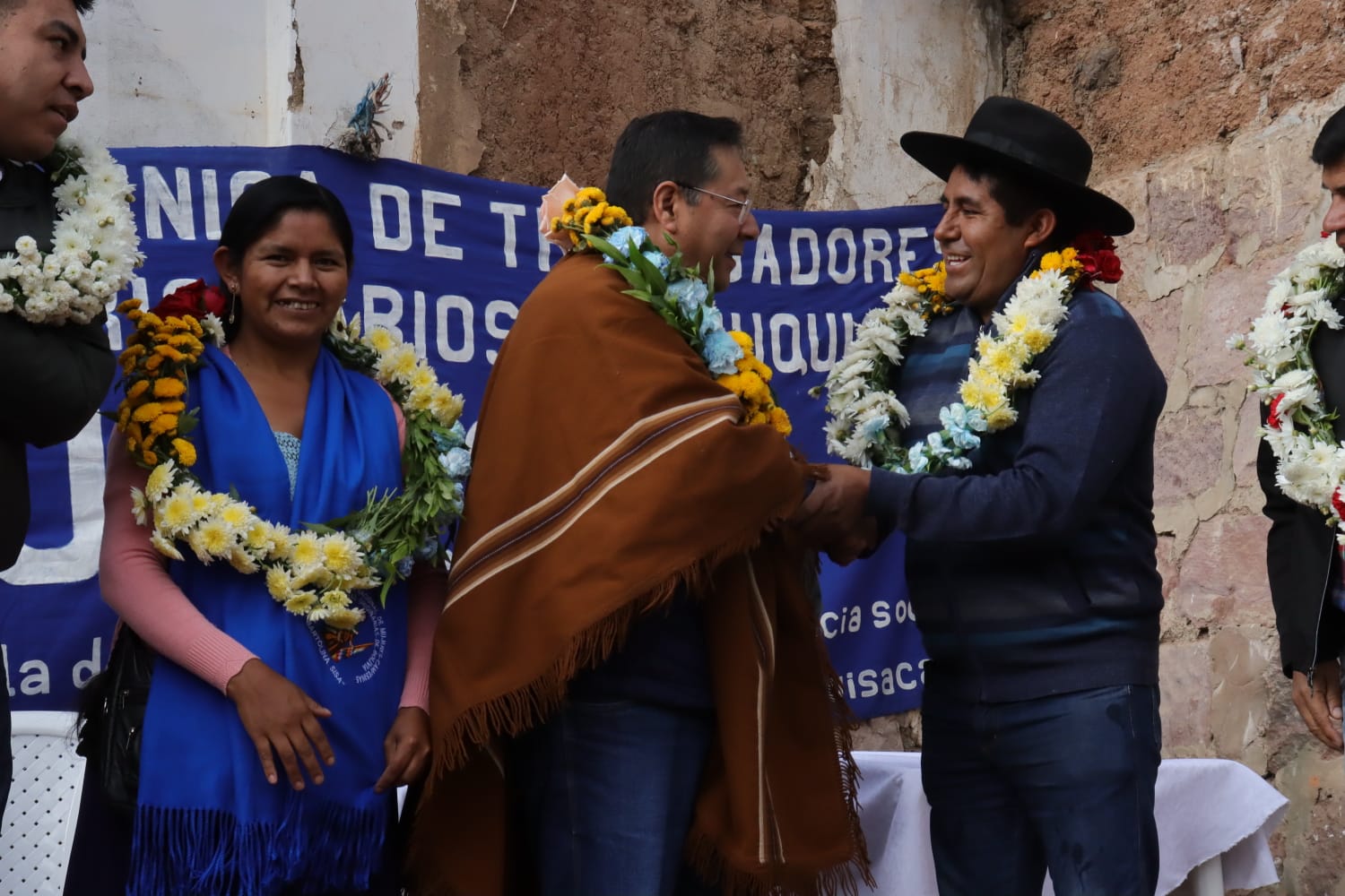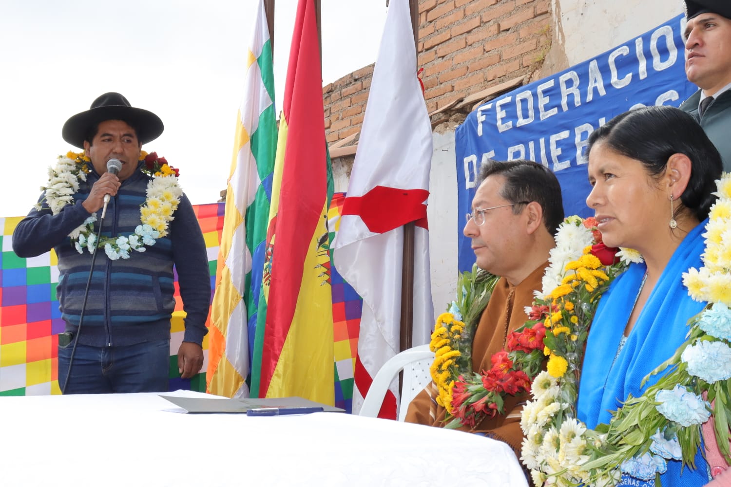 El Presidente del Estado Luis Arce coloca la piedra fundamental para la construcción de la Casa de Acogida "Kampu-Wawqimanta", en Sucre. Fuente: Comunicación Presidencial