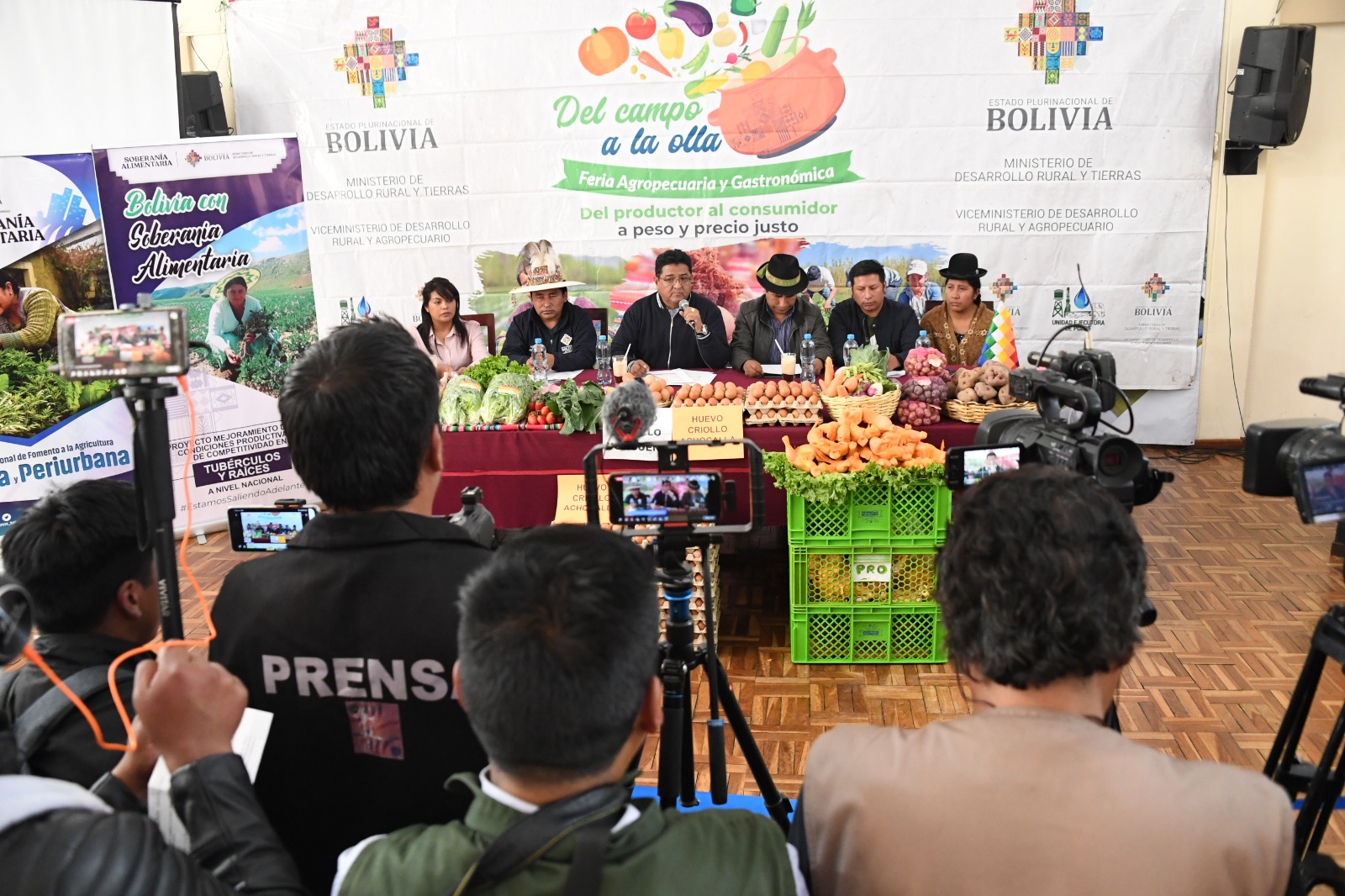 El Ministerio de Desarrollo Rural y Tierras realiza el lanzamiento de la "Feria del Huevo, Carne y Verduras a precio justo" que se realizará este martes 16 mayo. Fotos: Viceministerio de comunicación