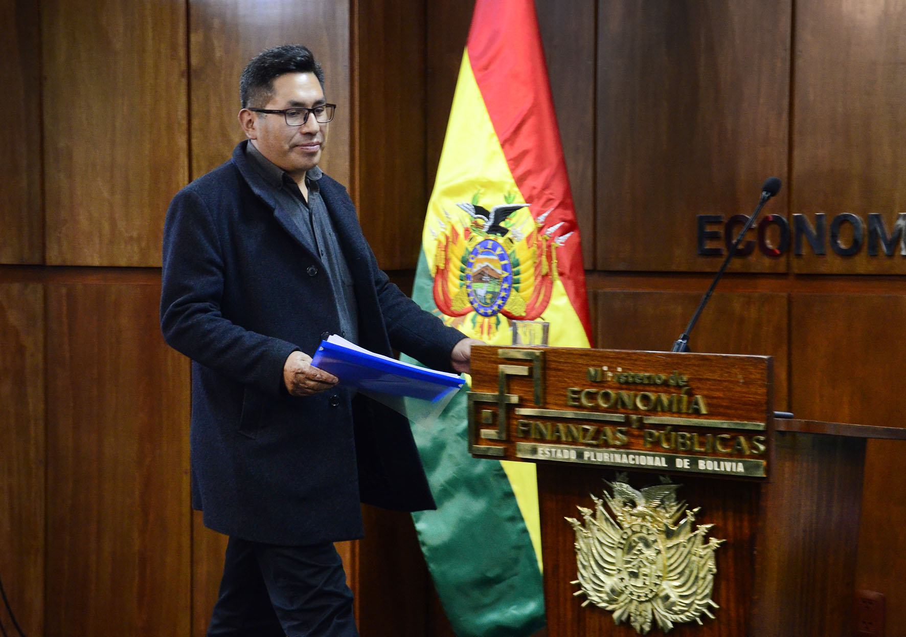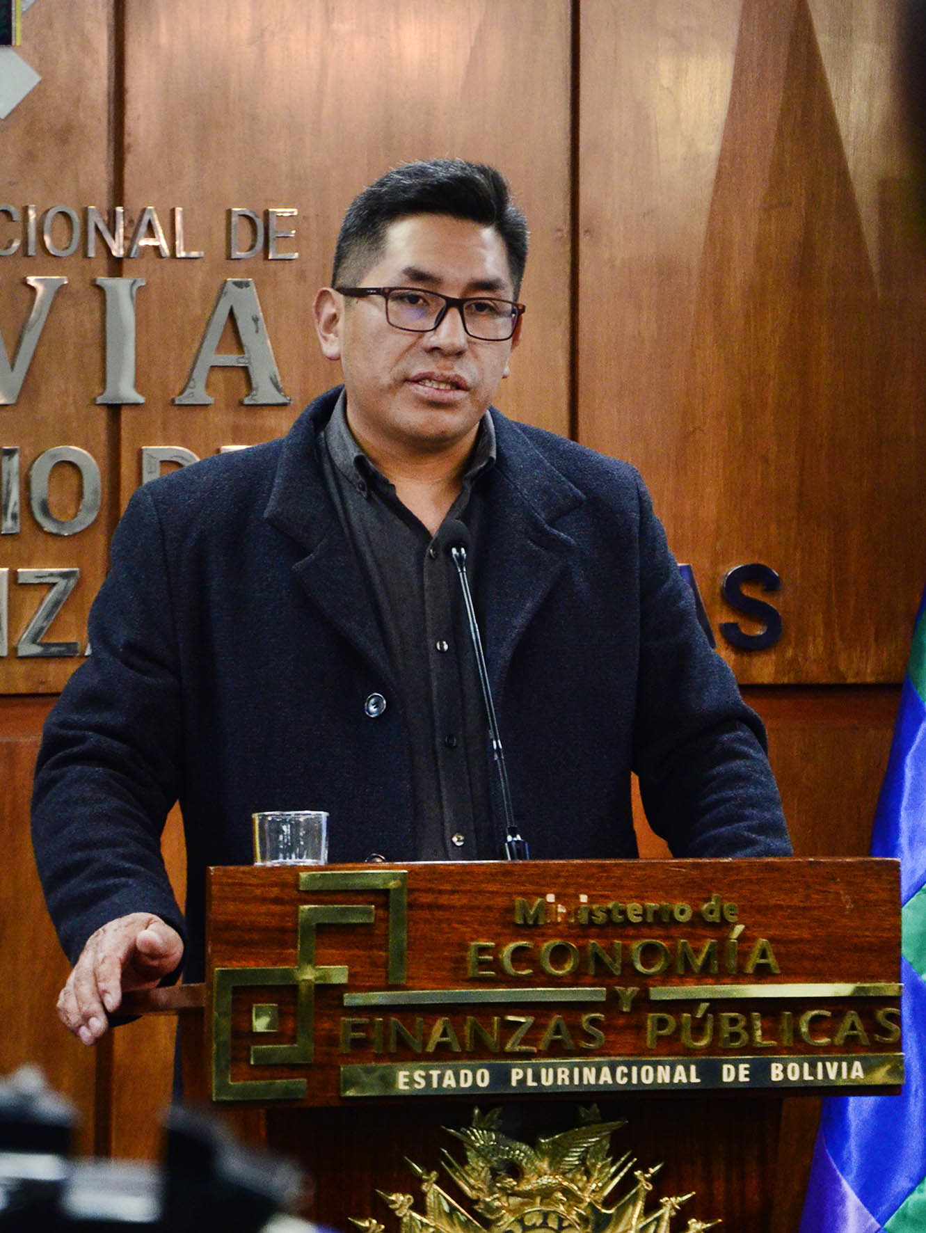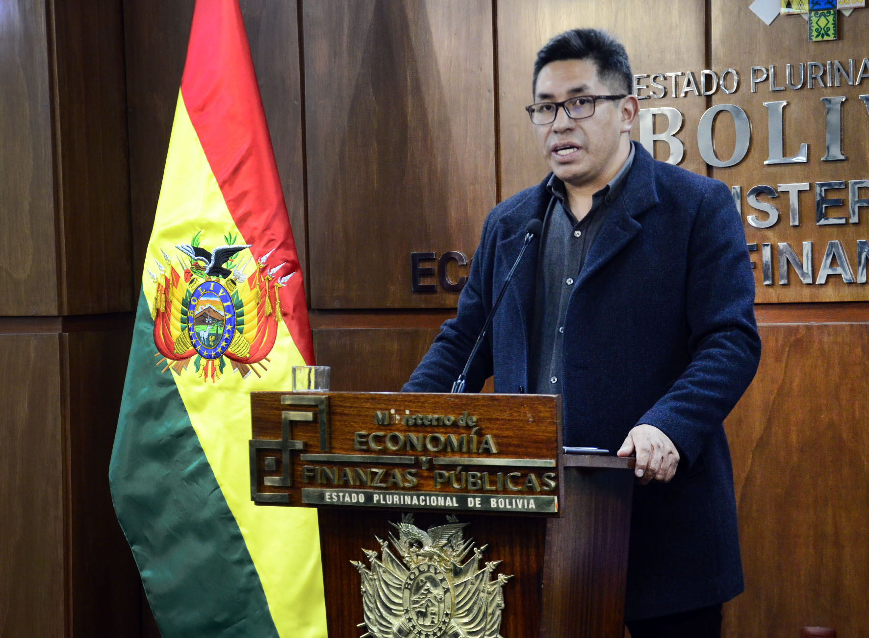El Viceministro de Presupuesto y Contabilidad Fiscal, Zenón Mamani en conferencia de prensa informa sobre los resultados de la Subasta Electrónica en el Ministerio de Economía y Finanzas Públicas. Foto: Freddy Barragán