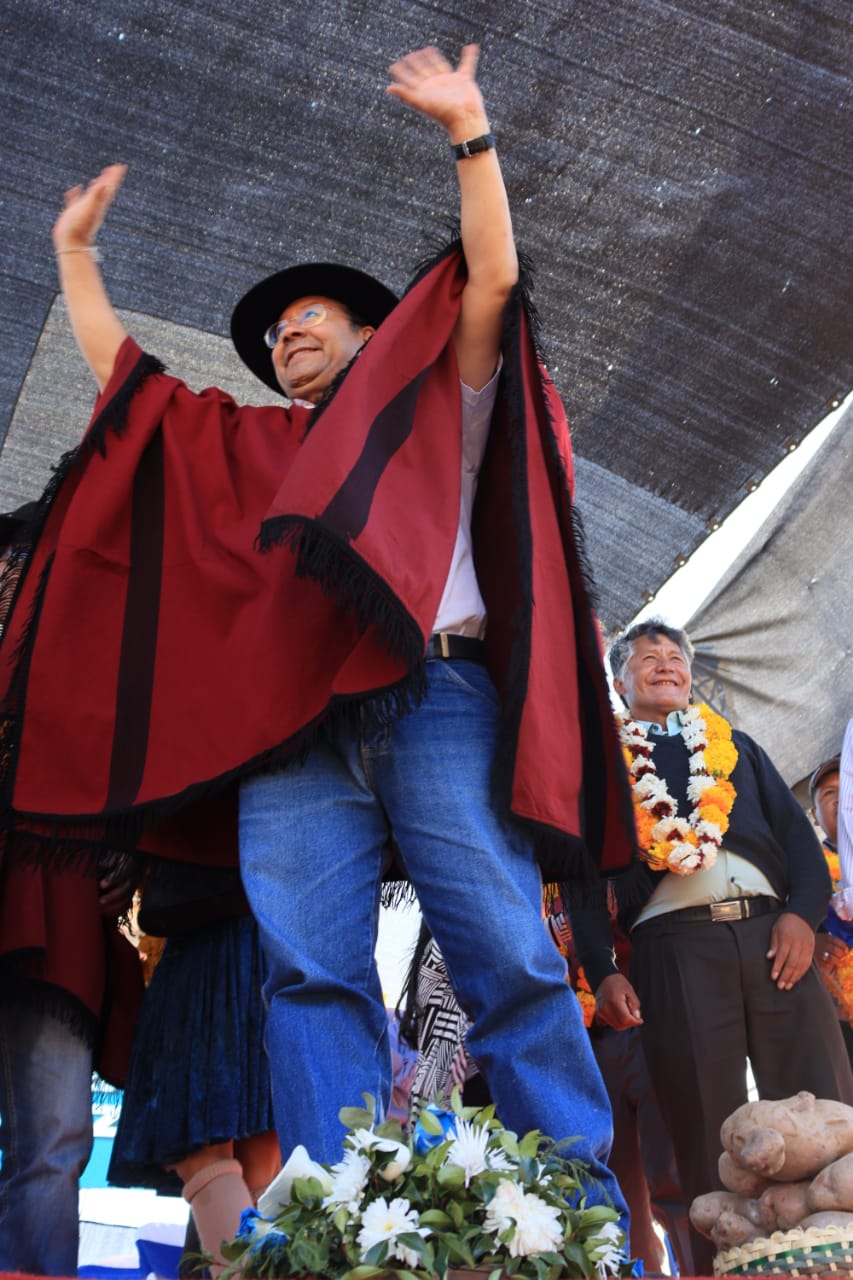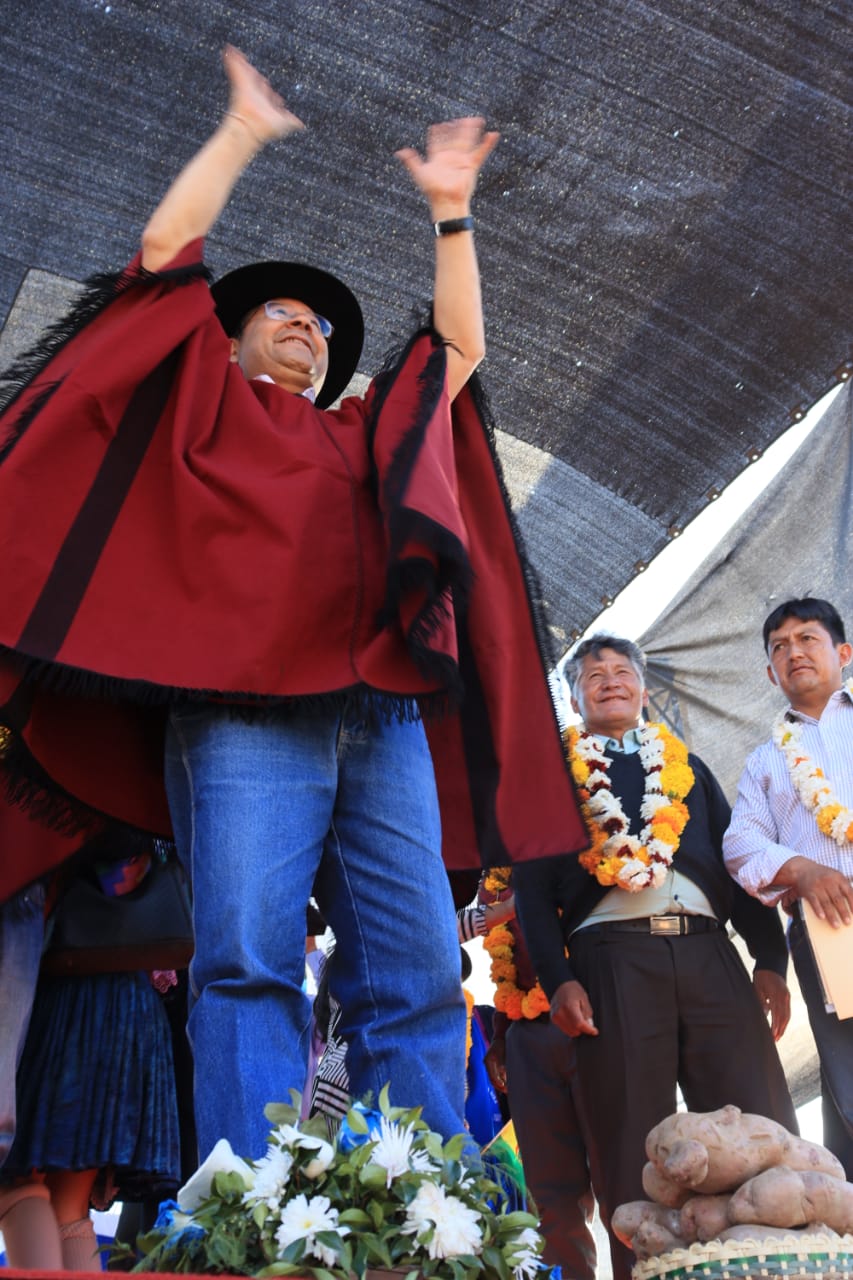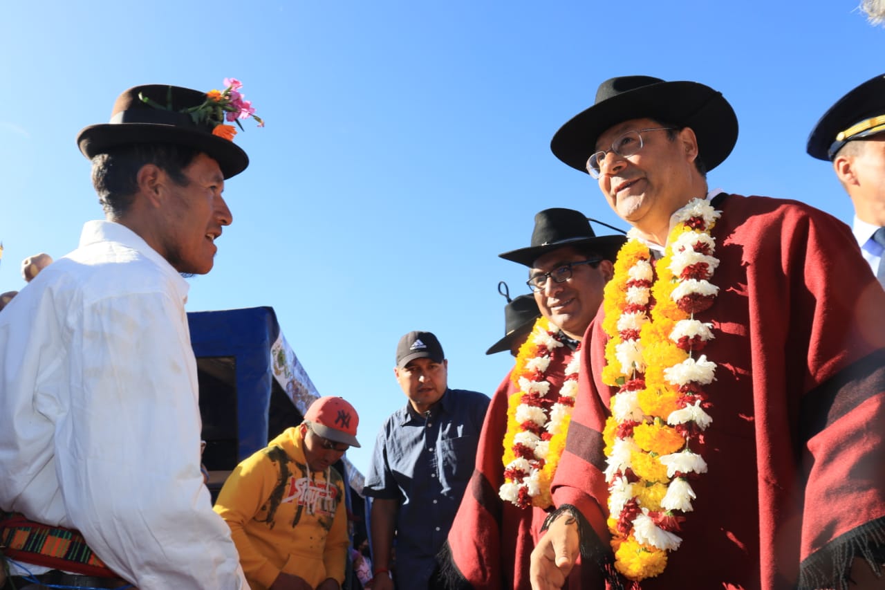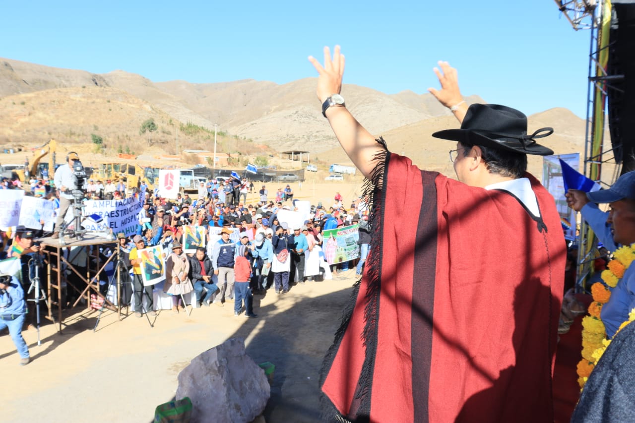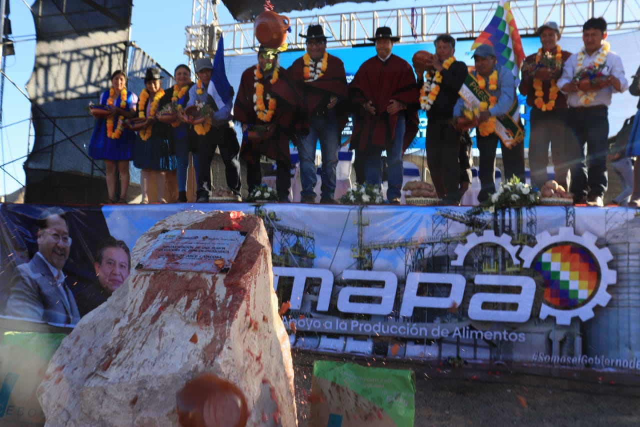 Presidente del Estado Luis Arce coloca en Incahuasi la piedra fundamental para iniciar la construcción de una Planta Industrial de Procesamiento de Papa. Fuente: Comunicación Presidencial