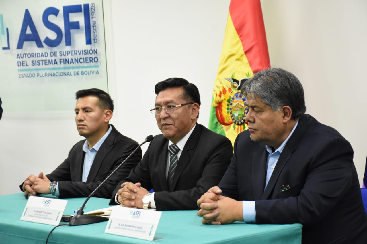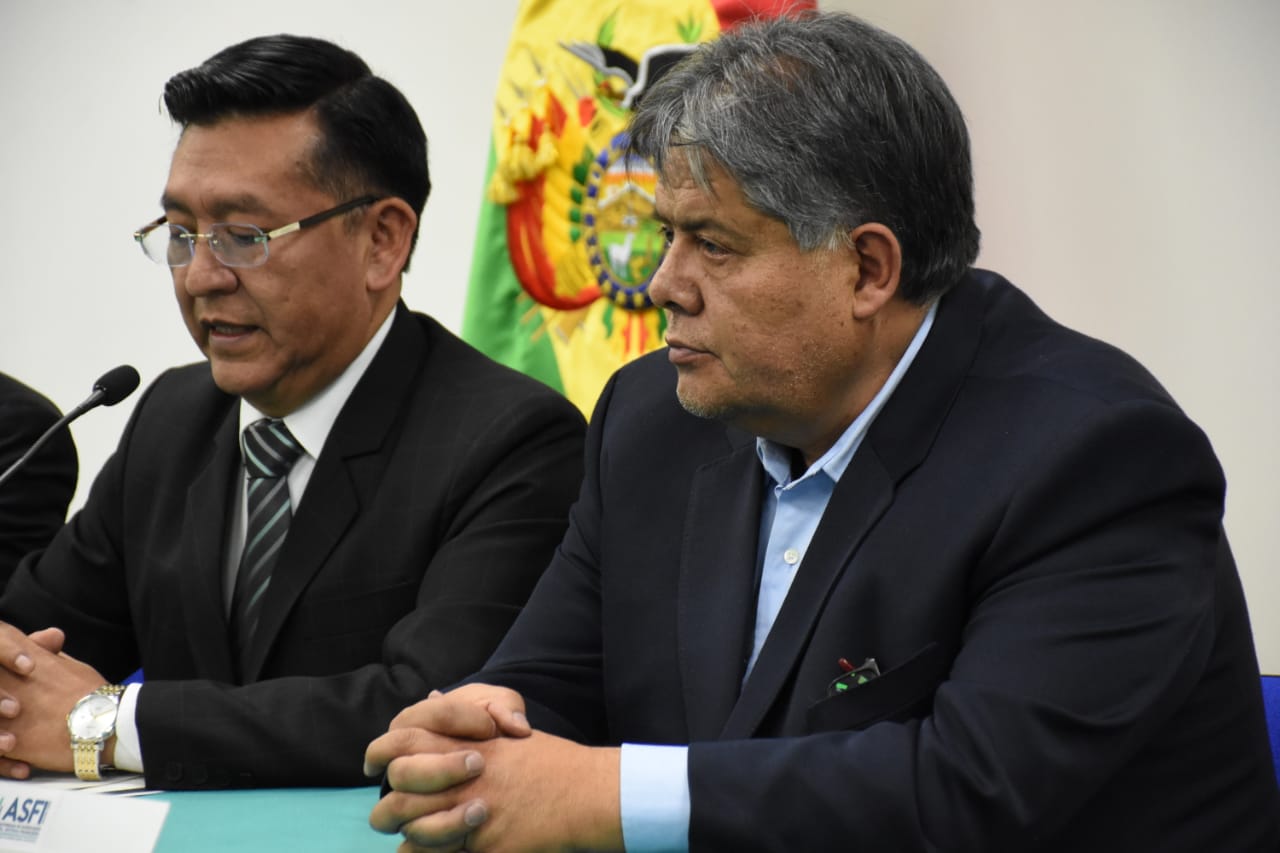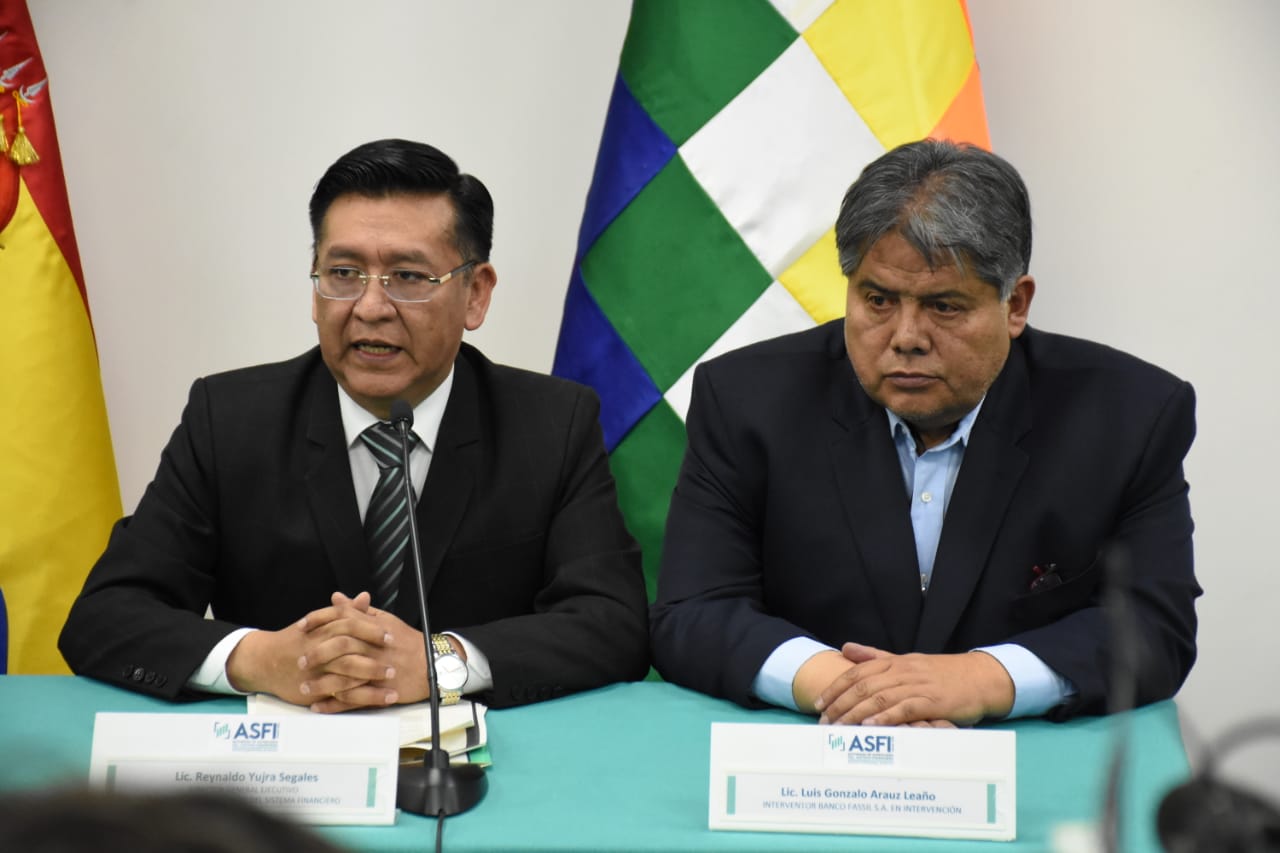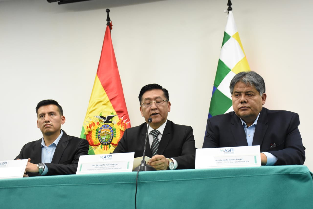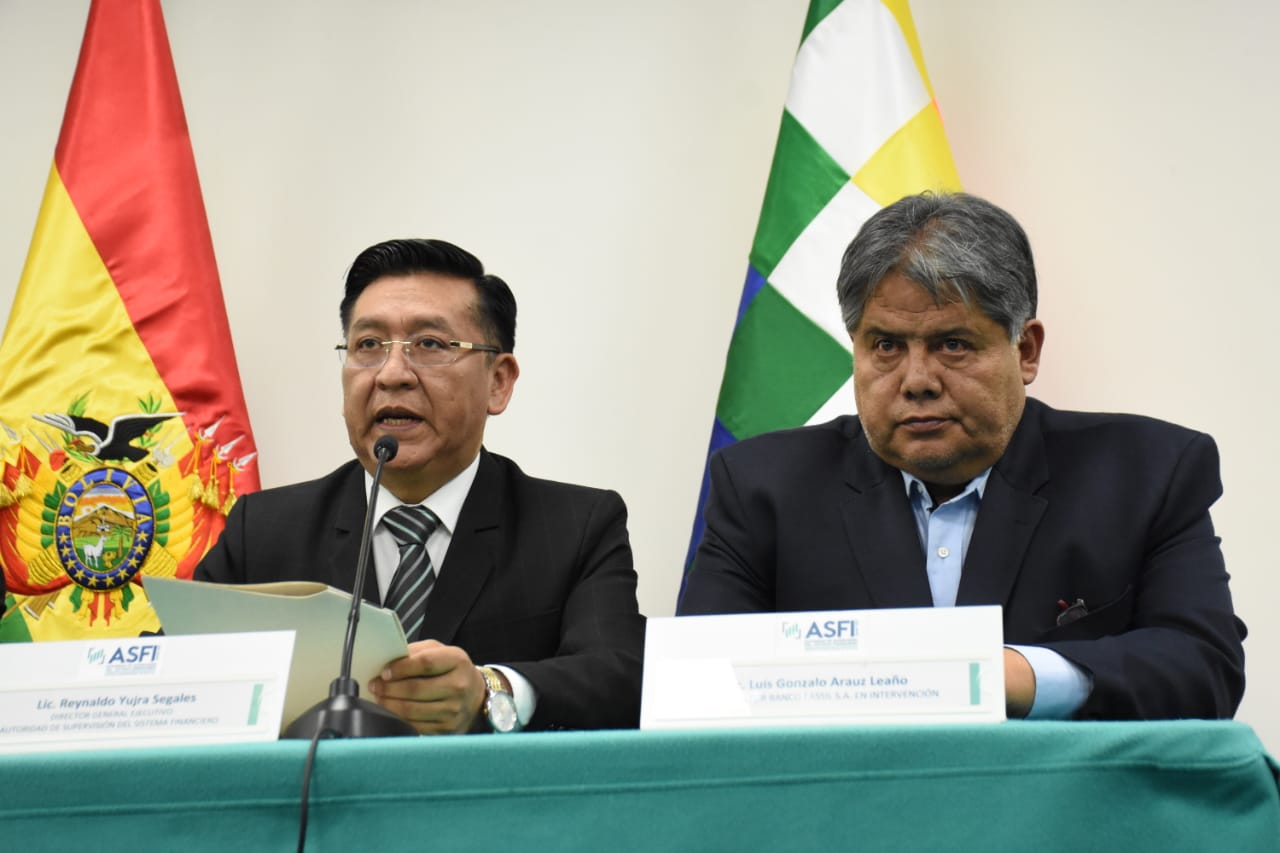 Director de la Autoridad de Supervisión del Sistema Financiero (ASFI), Reynaldo Yujra, presenta al nuevo interventor del Banco Fassil, Luis Gonzalo Araoz Leaño