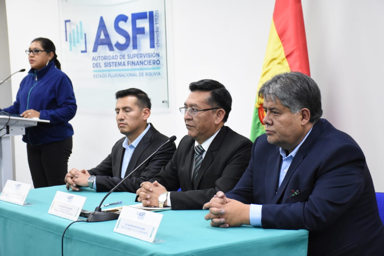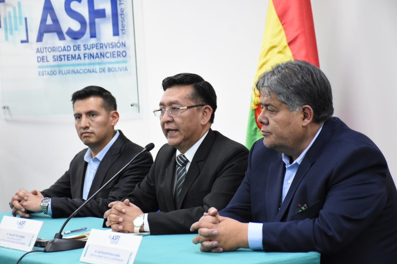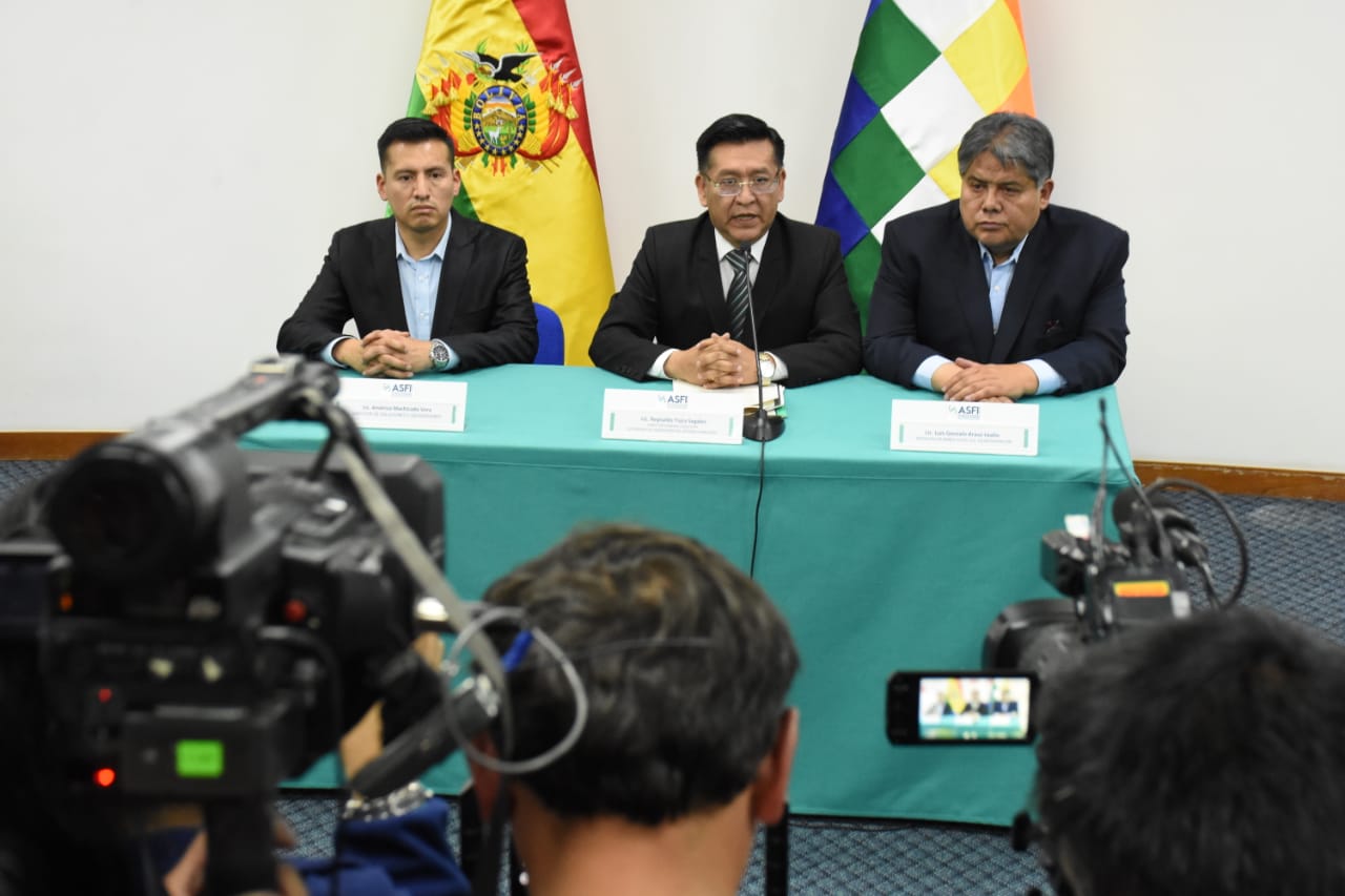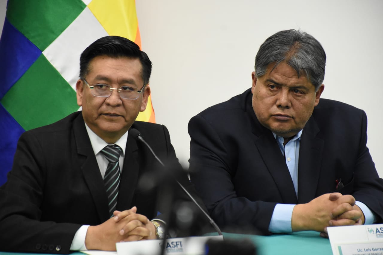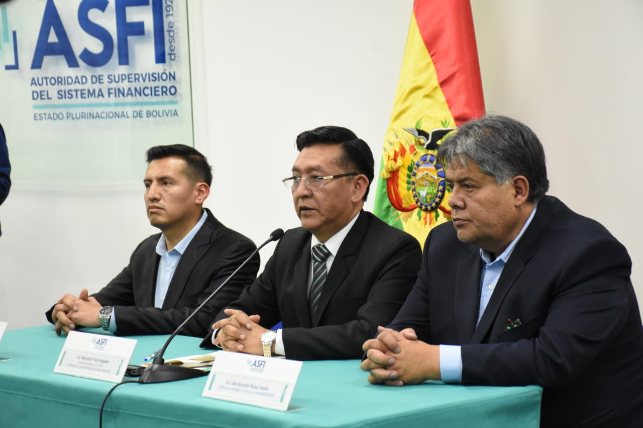 Director de la Autoridad de Supervisión del Sistema Financiero (ASFI), Reynaldo Yujra, presenta al nuevo interventor del Banco Fassil, Luis Gonzalo Araoz Leaño
