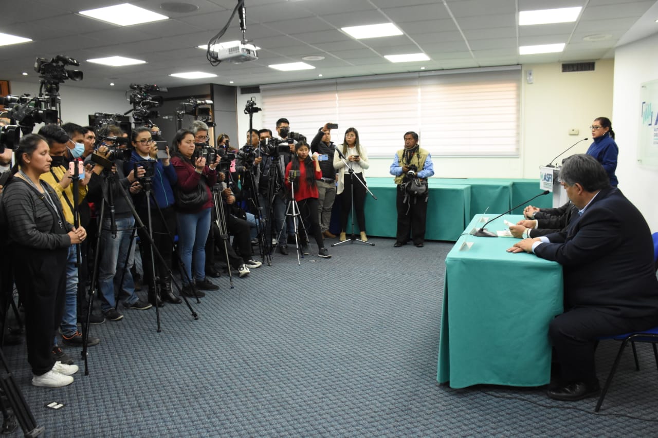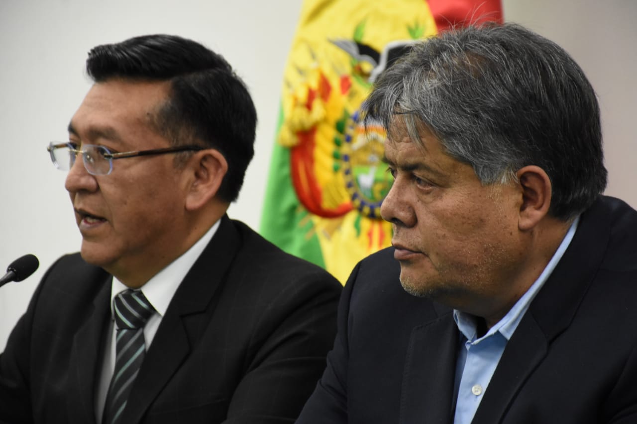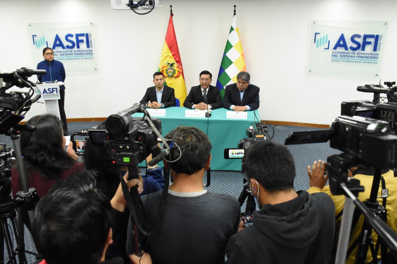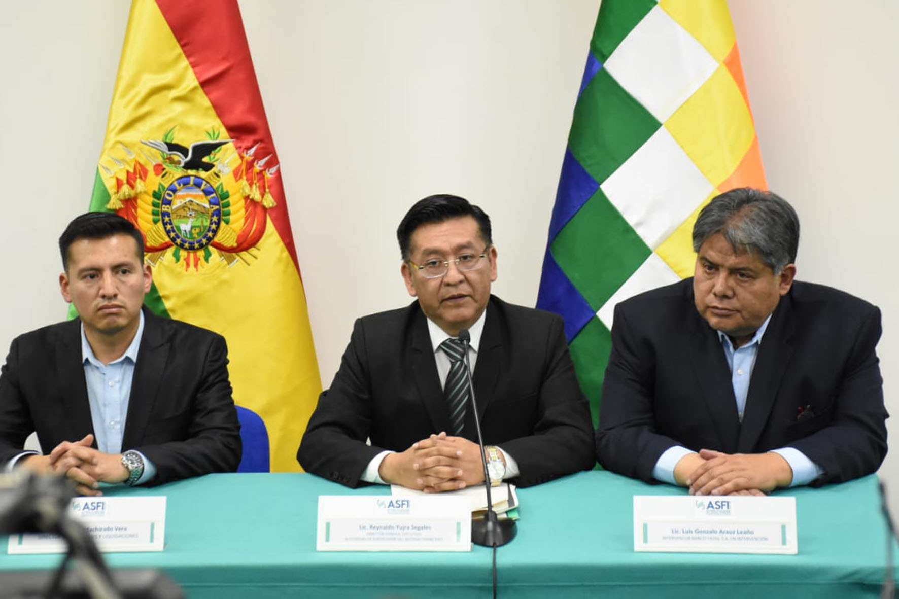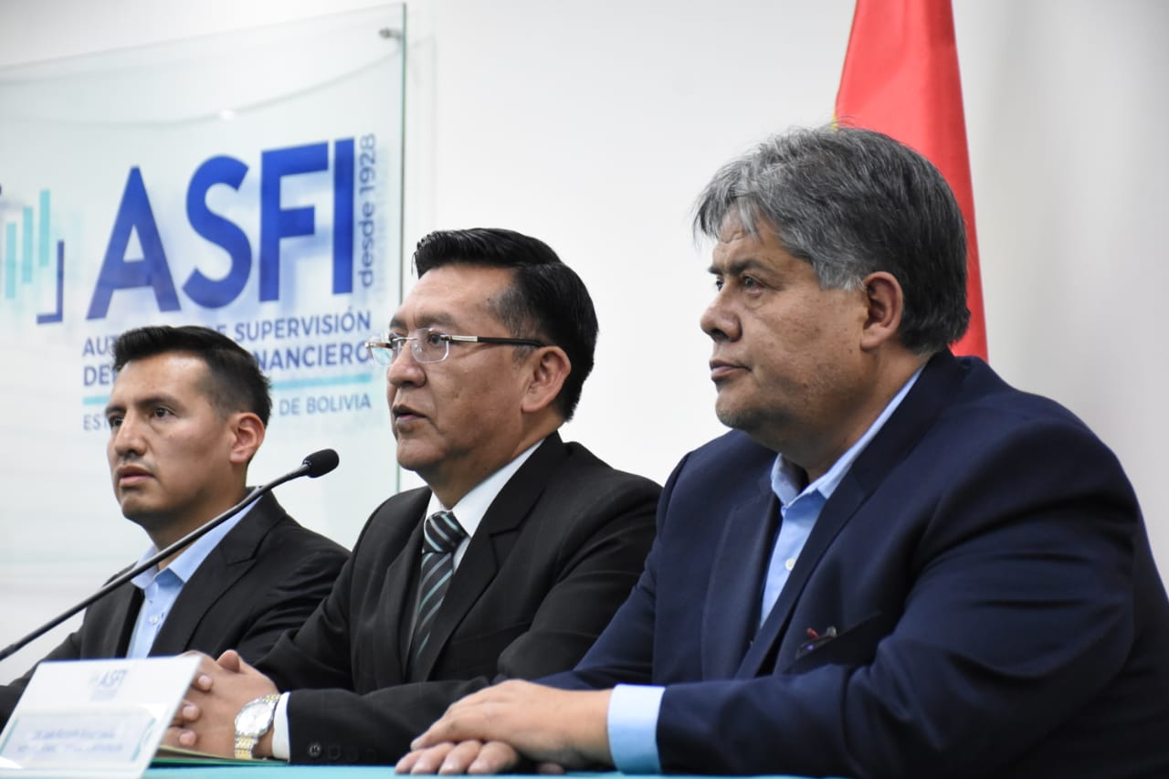 Director de la Autoridad de Supervisión del Sistema Financiero (ASFI), Reynaldo Yujra, presenta al nuevo interventor del Banco Fassil, Luis Gonzalo Araoz Leaño