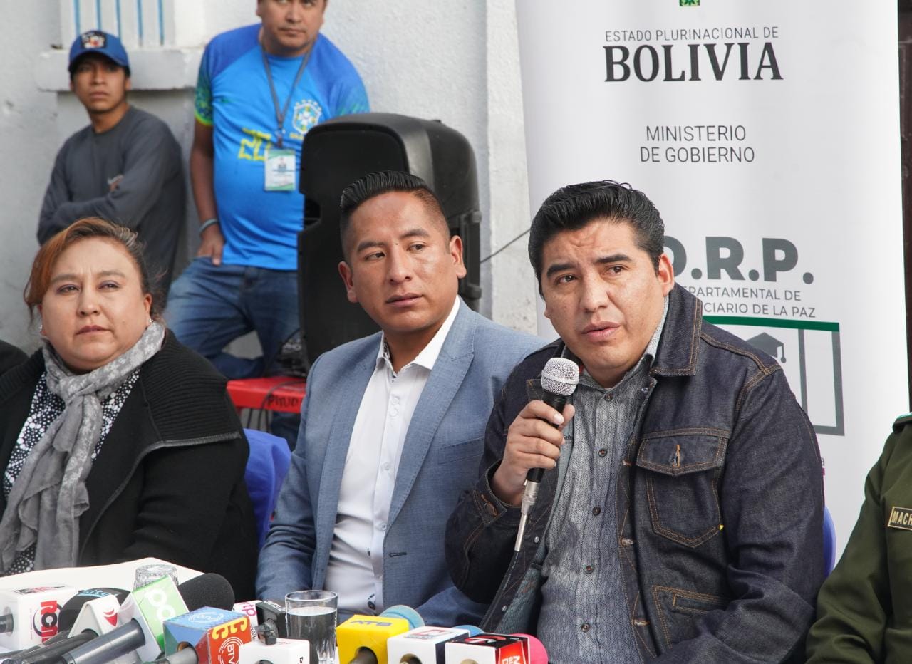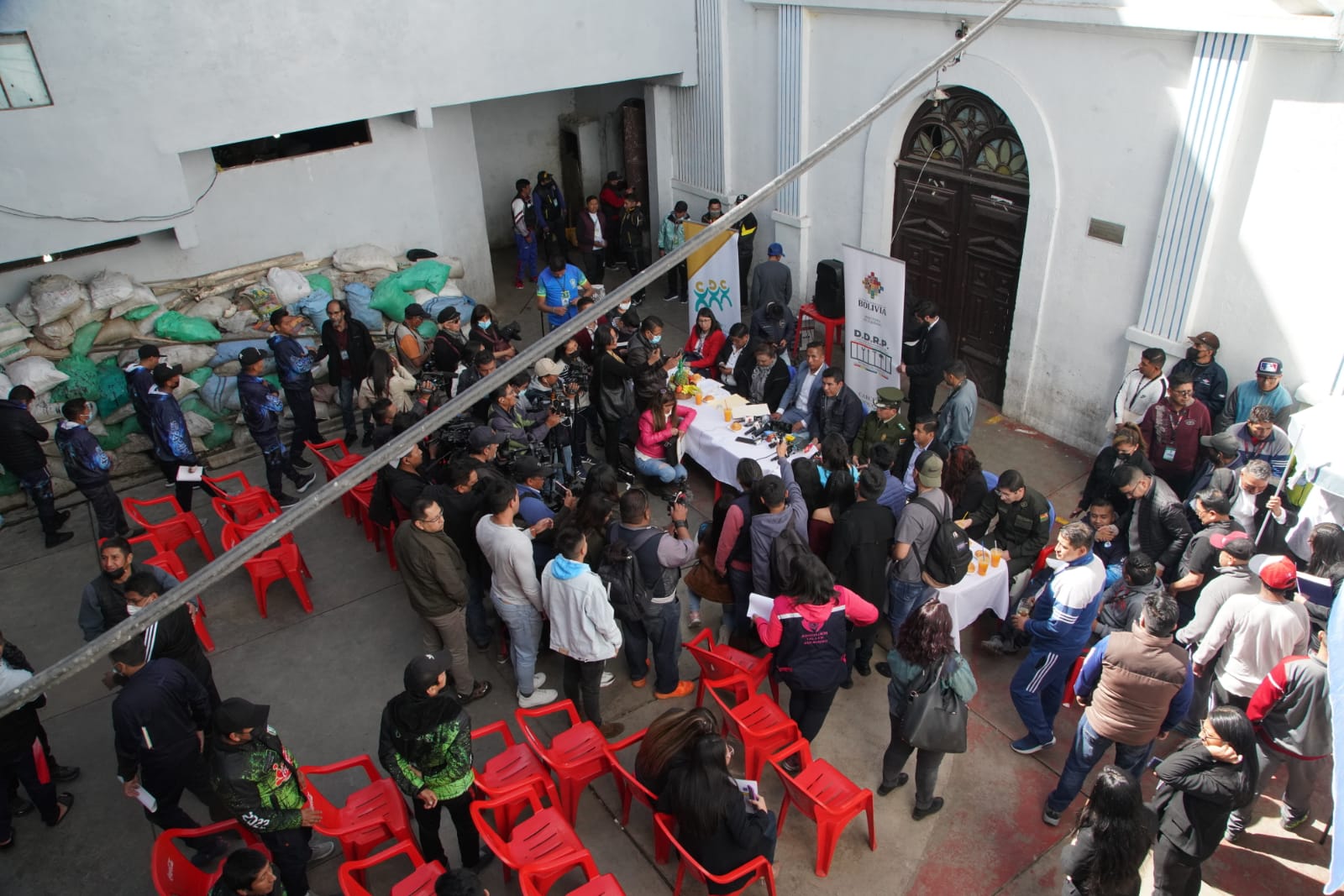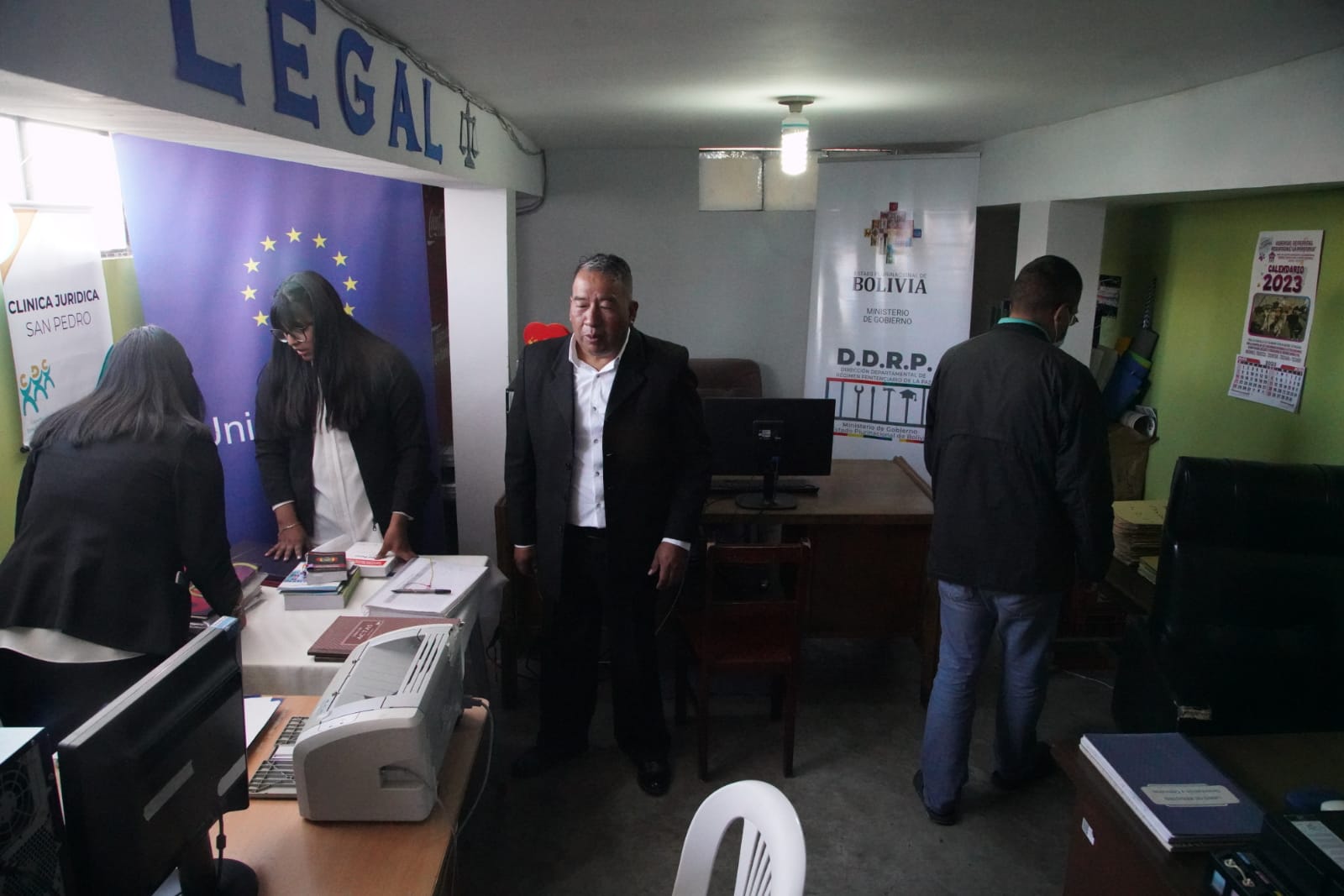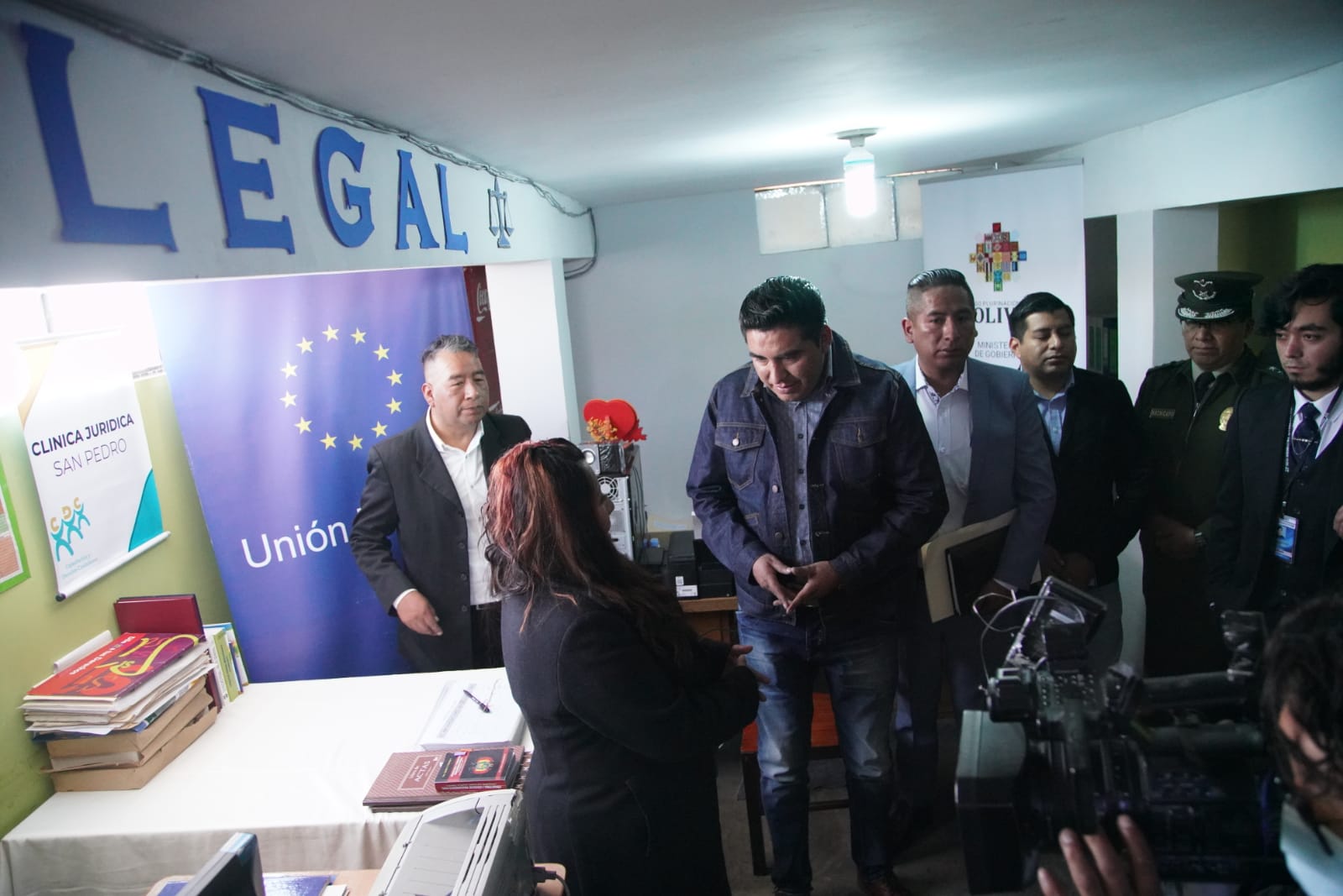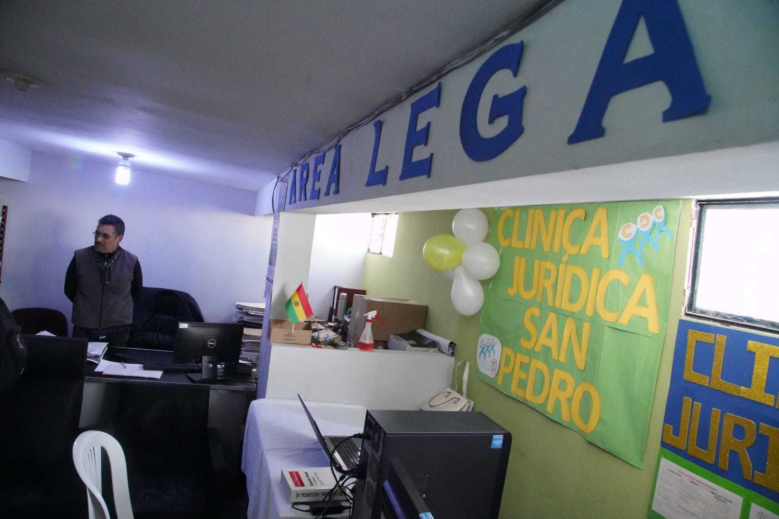 El Director General de Régimen Penitenciario Juan Carlos Limpias, y el Cnl. Rodolfo Machicado, Director Nacional de Seguridad Penitenciaria, participan del acto de inauguración y relanzamiento de la clínica Jurídica para la asistencia legal de los privados de libertad en el penal de San Pedro. Fotos: Jorge Mamani