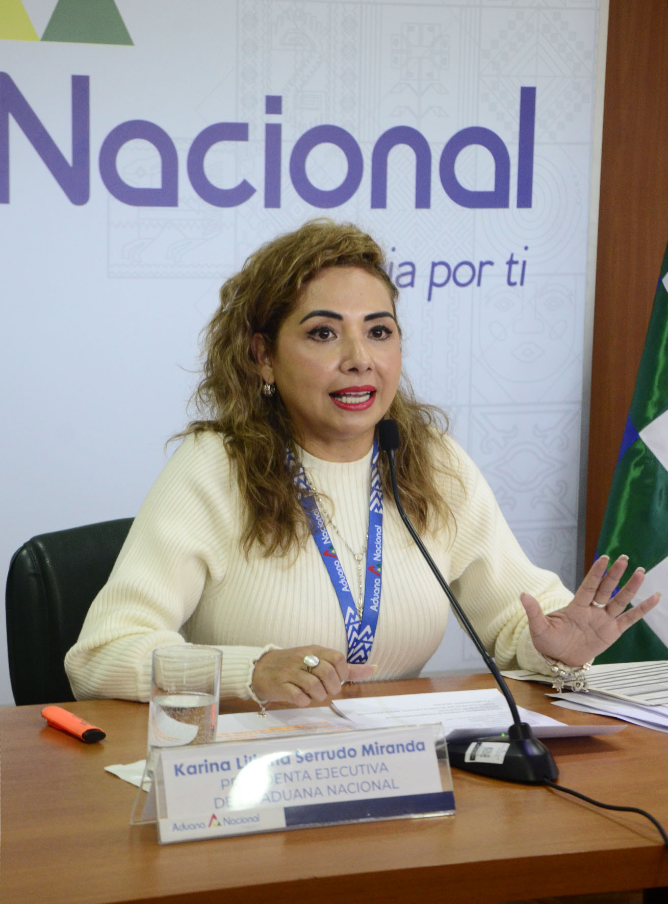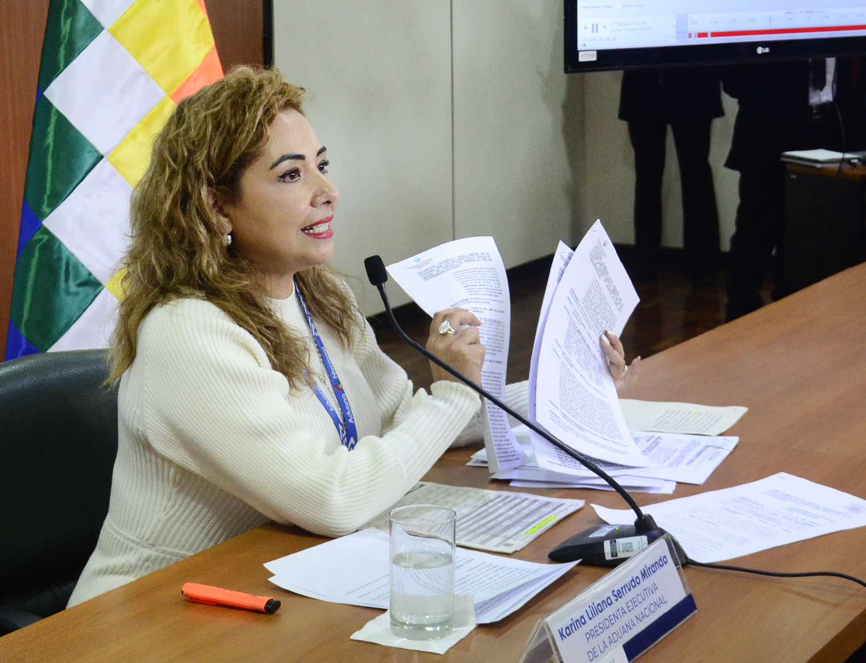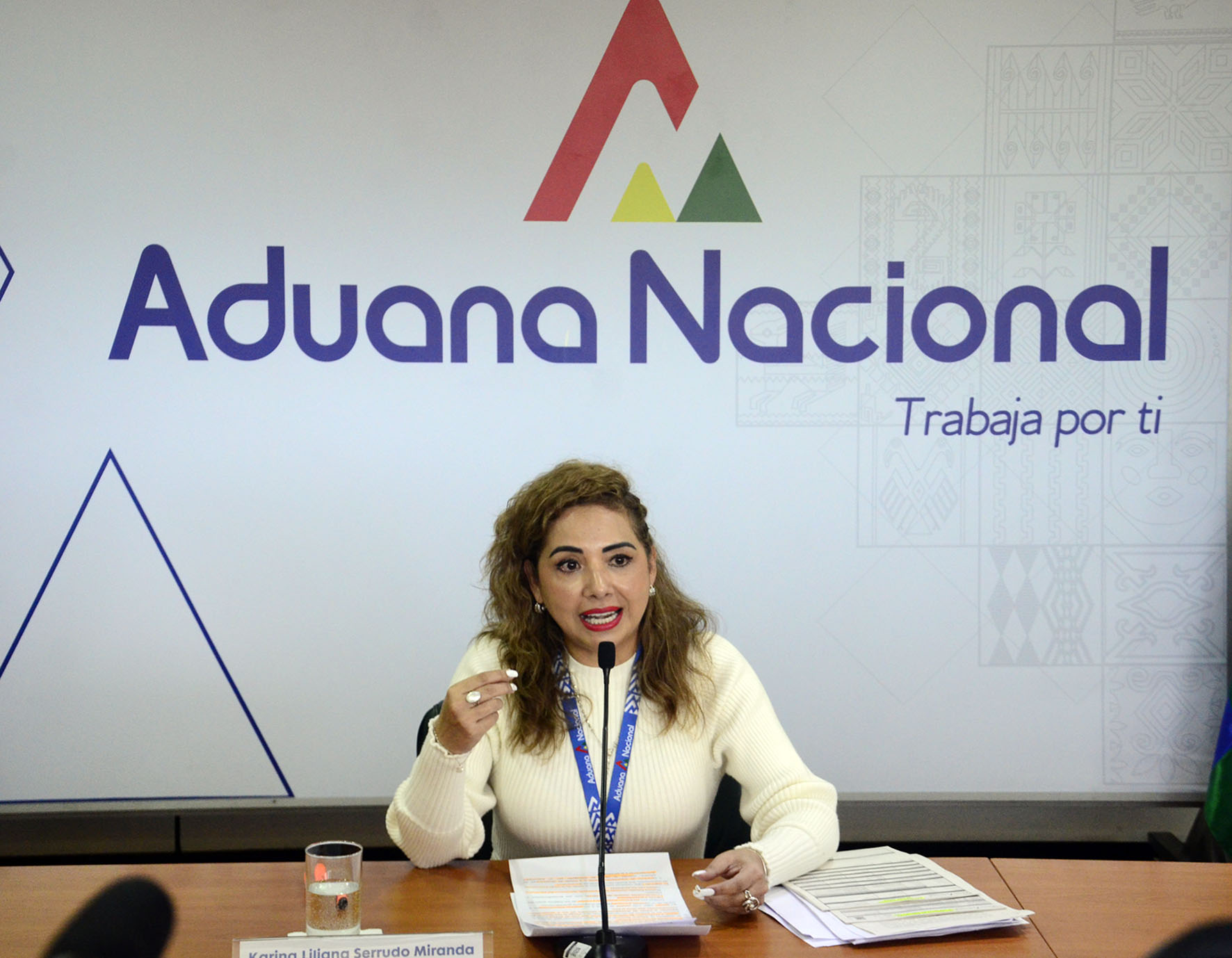 Presidenta Ejecutiva de la Aduana Nacional, Karina Serrudo, en conferencia de prensa informa sobre las Funciones en Aeropuerto Viru Viru