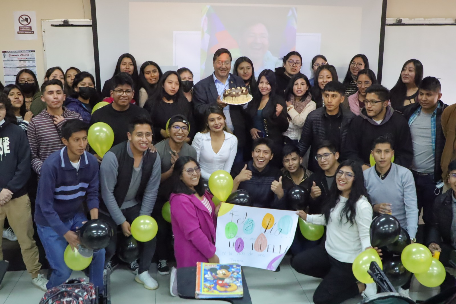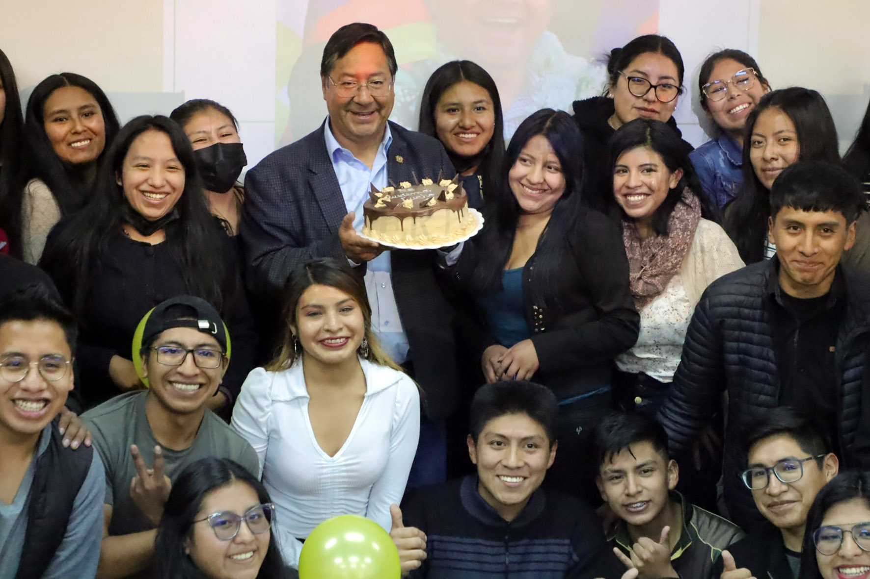 Estudiantes de la Carrera de Economía de la UMSA festejan al presidente Luis Arce, por el Día del Maestro. Fuente: Comunicación Presidencial