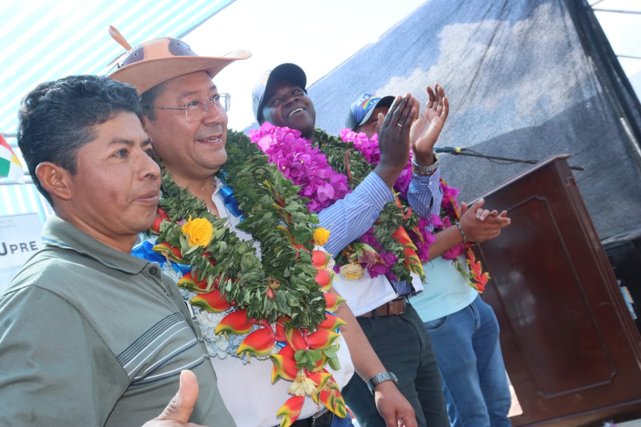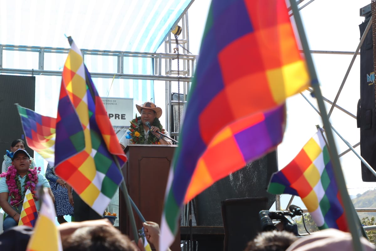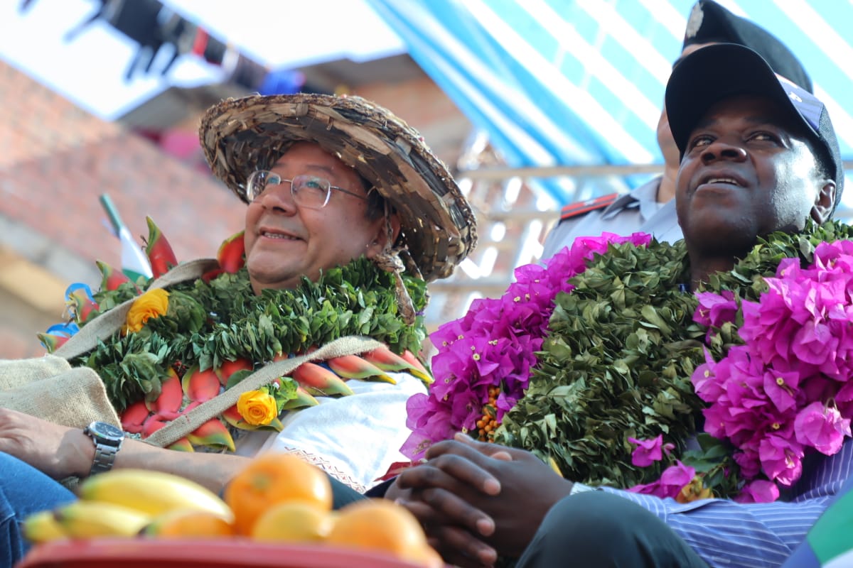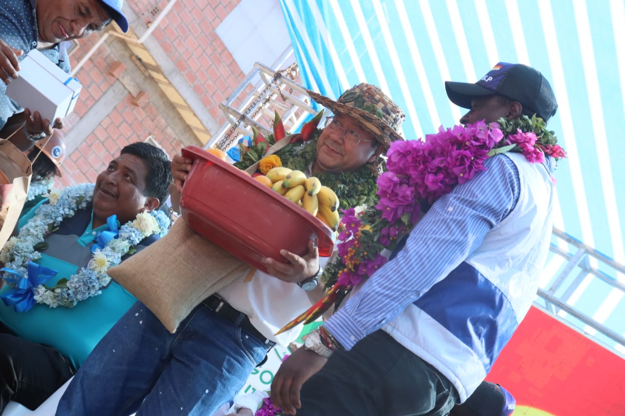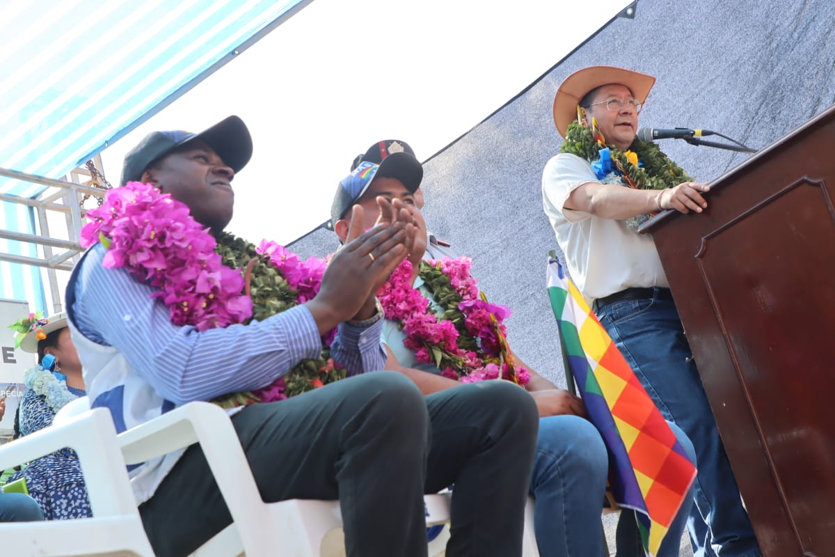 Presidente del Estado Luis Arce coloca piedra fundamental para dar inicio a la construcción del Centro Integral de Desarrollo Productivo Yapuchaña y de la Unidad Educativa Eduardo Abaroa, en Coripata. Fuente: Comunicación Presidencial