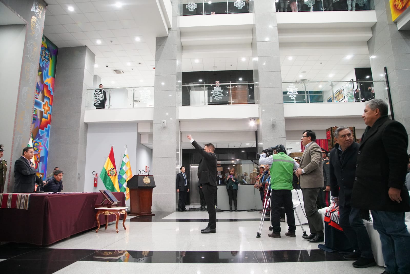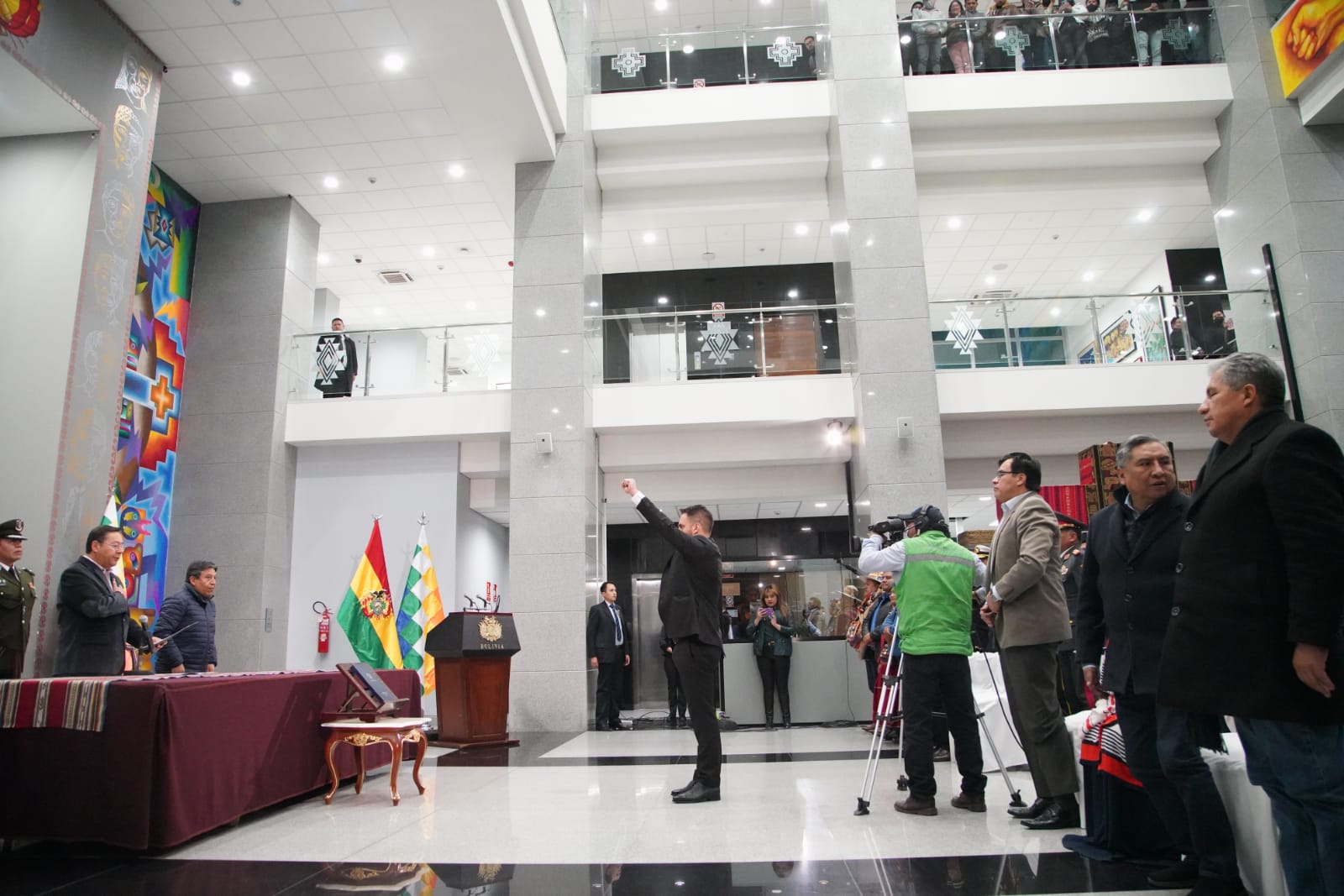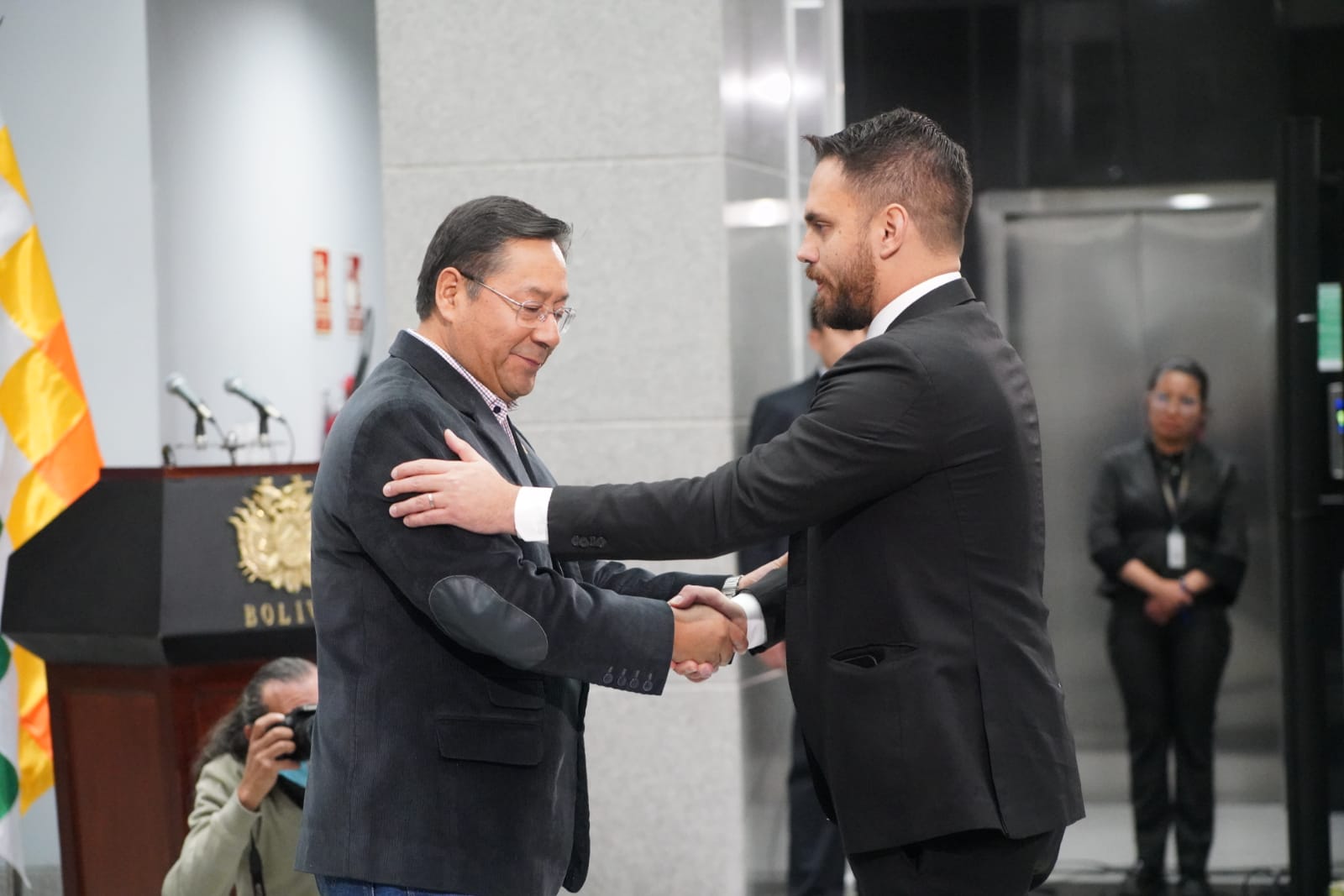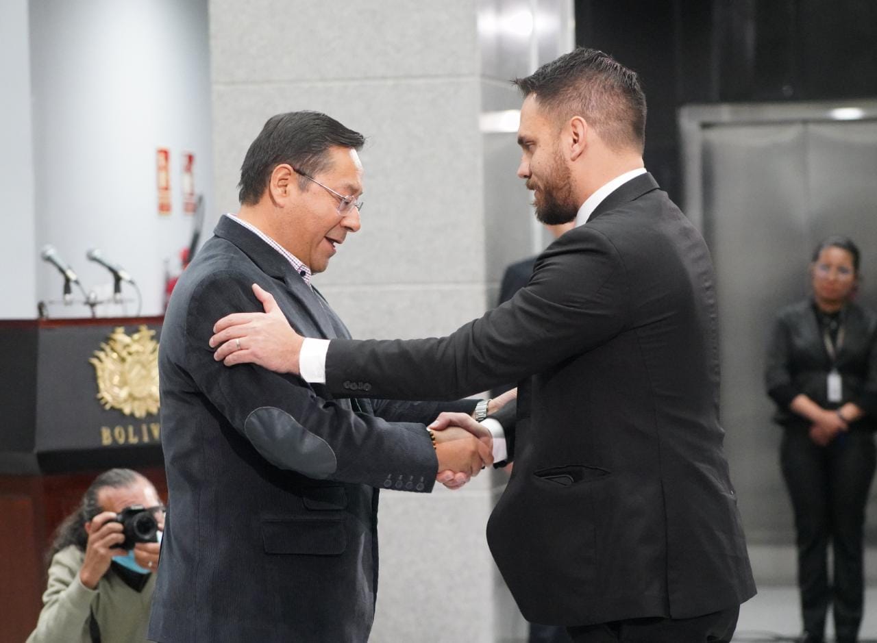 El presidente constitucional del estado Luis Alberto Arce Catacora, ratifica a Eduardo del Castillo como Ministro de Gobierno, en el Hall de la Casa Grande del Pueblo. Fotos: Jorge Mamani y Josué Cortéz