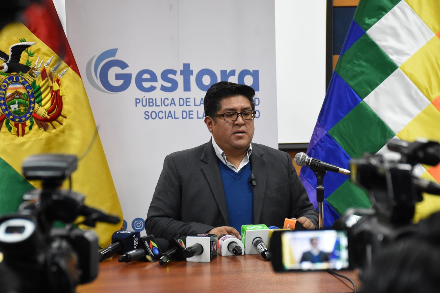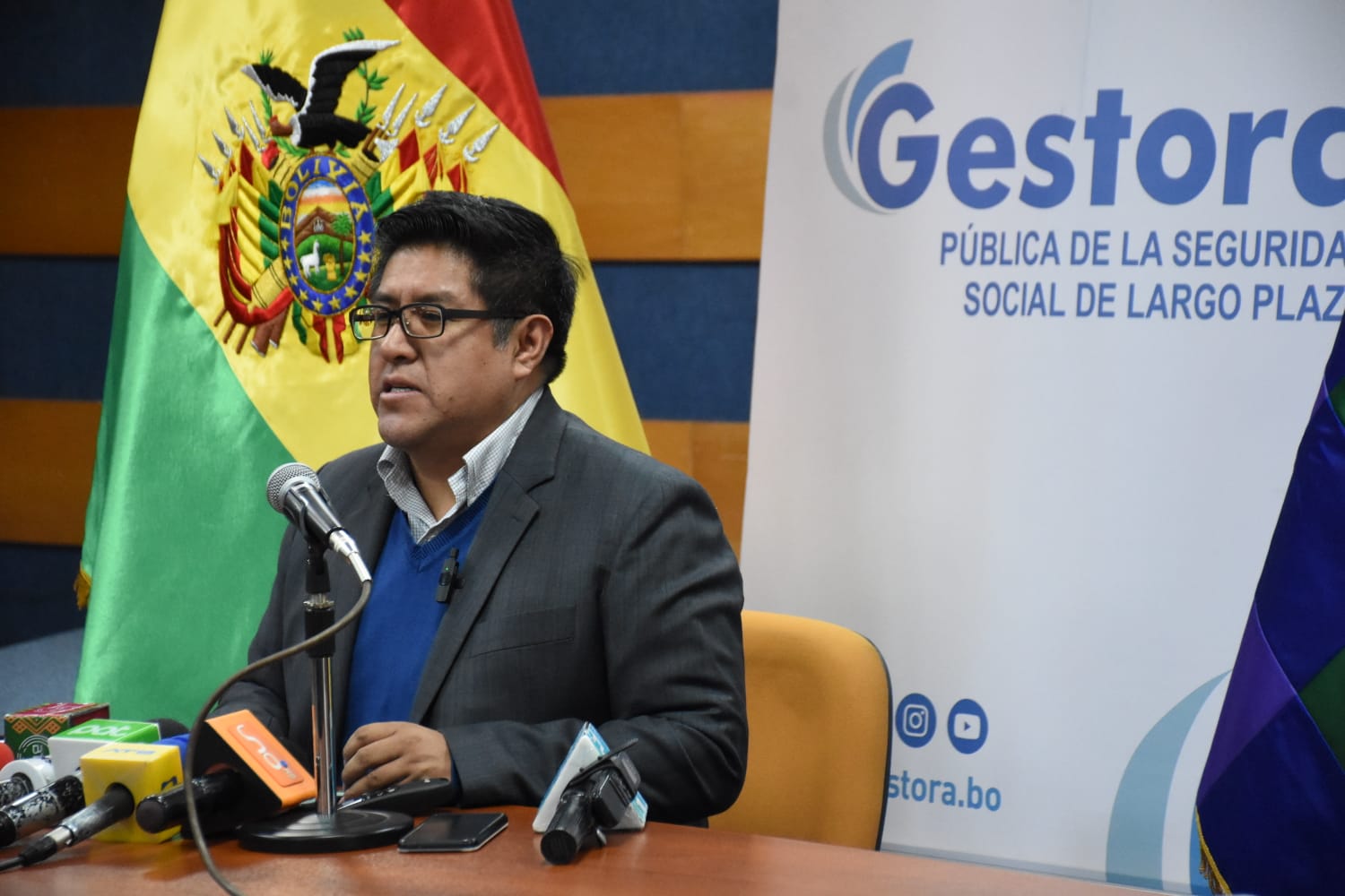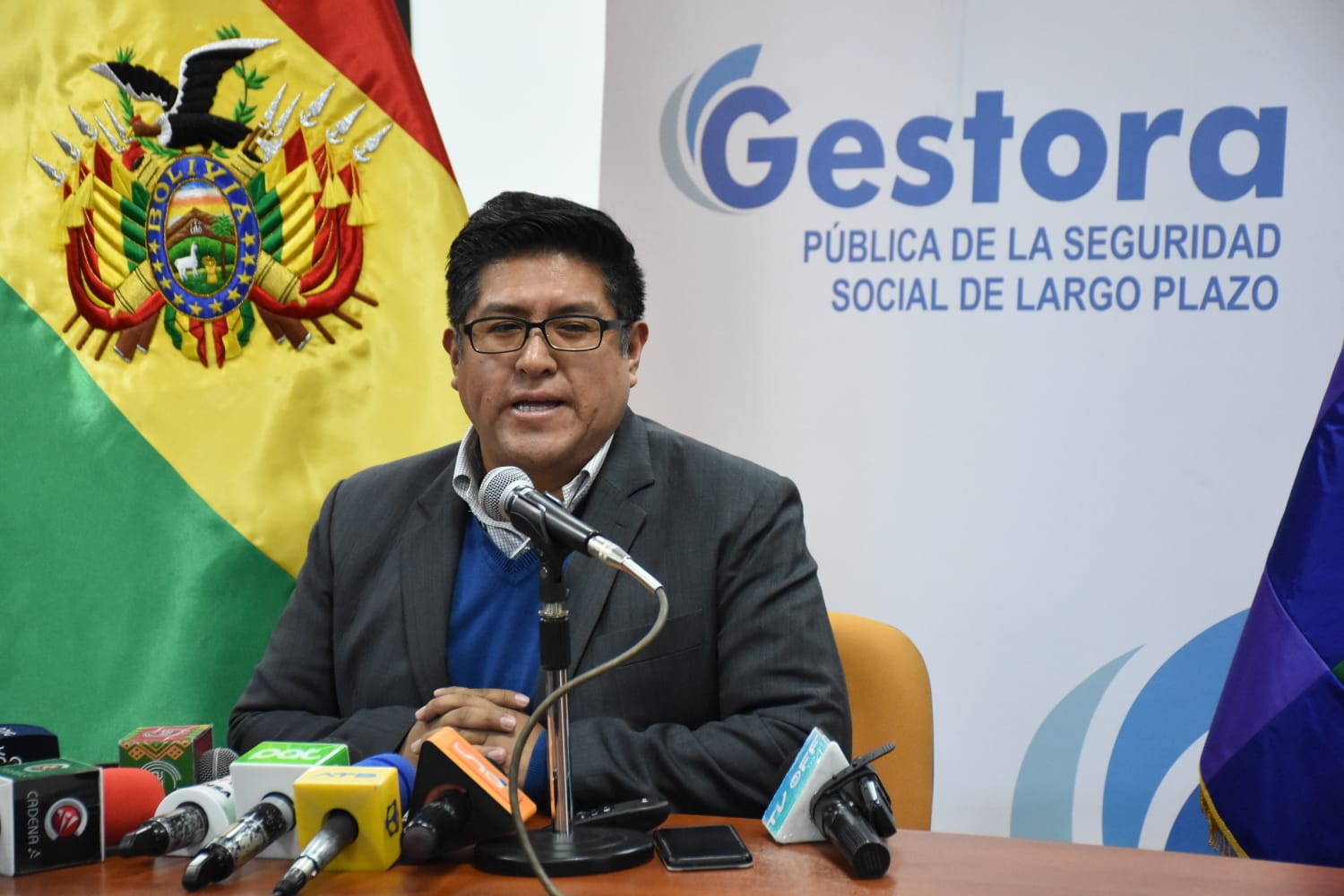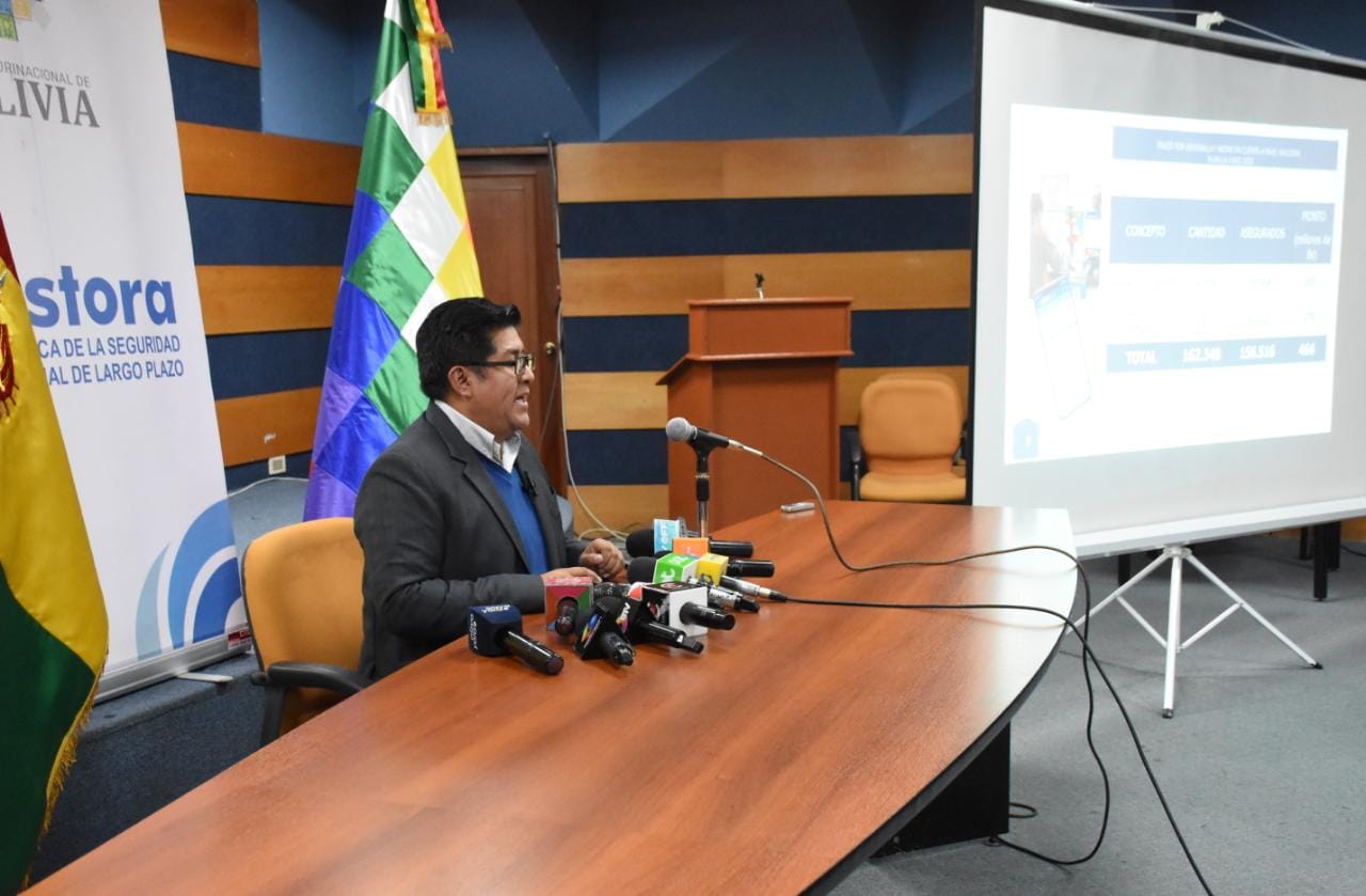 El Gerente General de la Gestora Pública, Jaime Durán Chuquimia, brinda conferencia de Prensa sobre el tema de evaluación del segundo mes de pago de pensiones a cargo de la Gestora. Fotos: Jorge Mamani