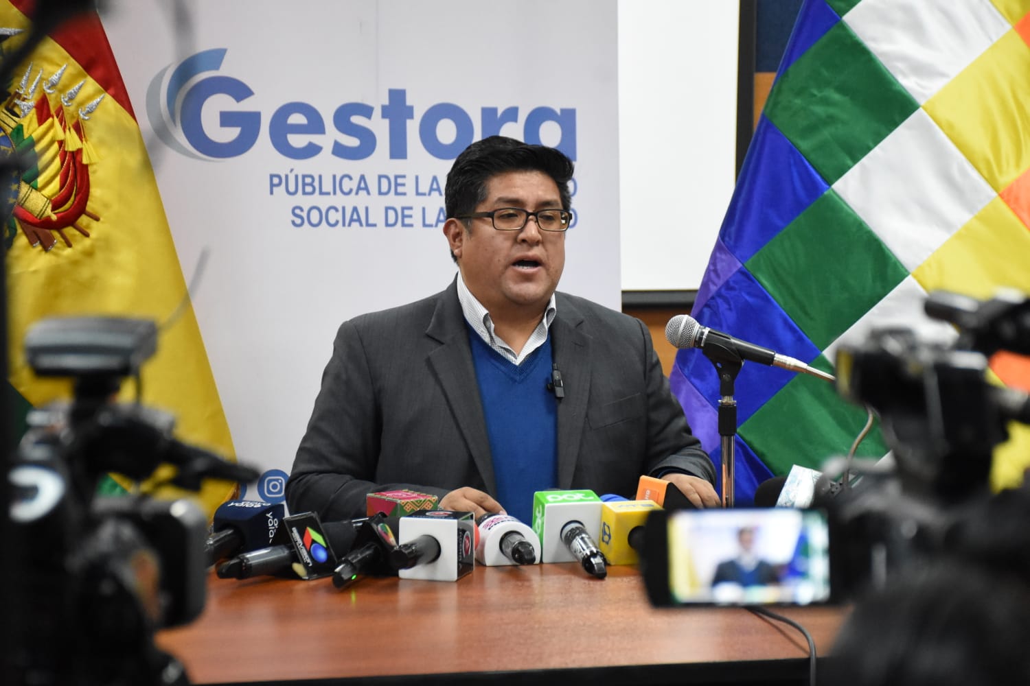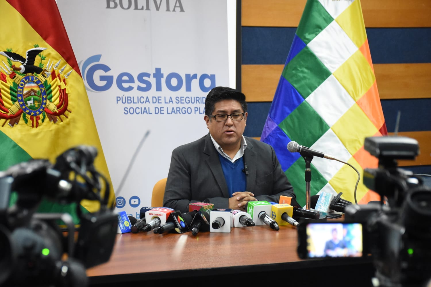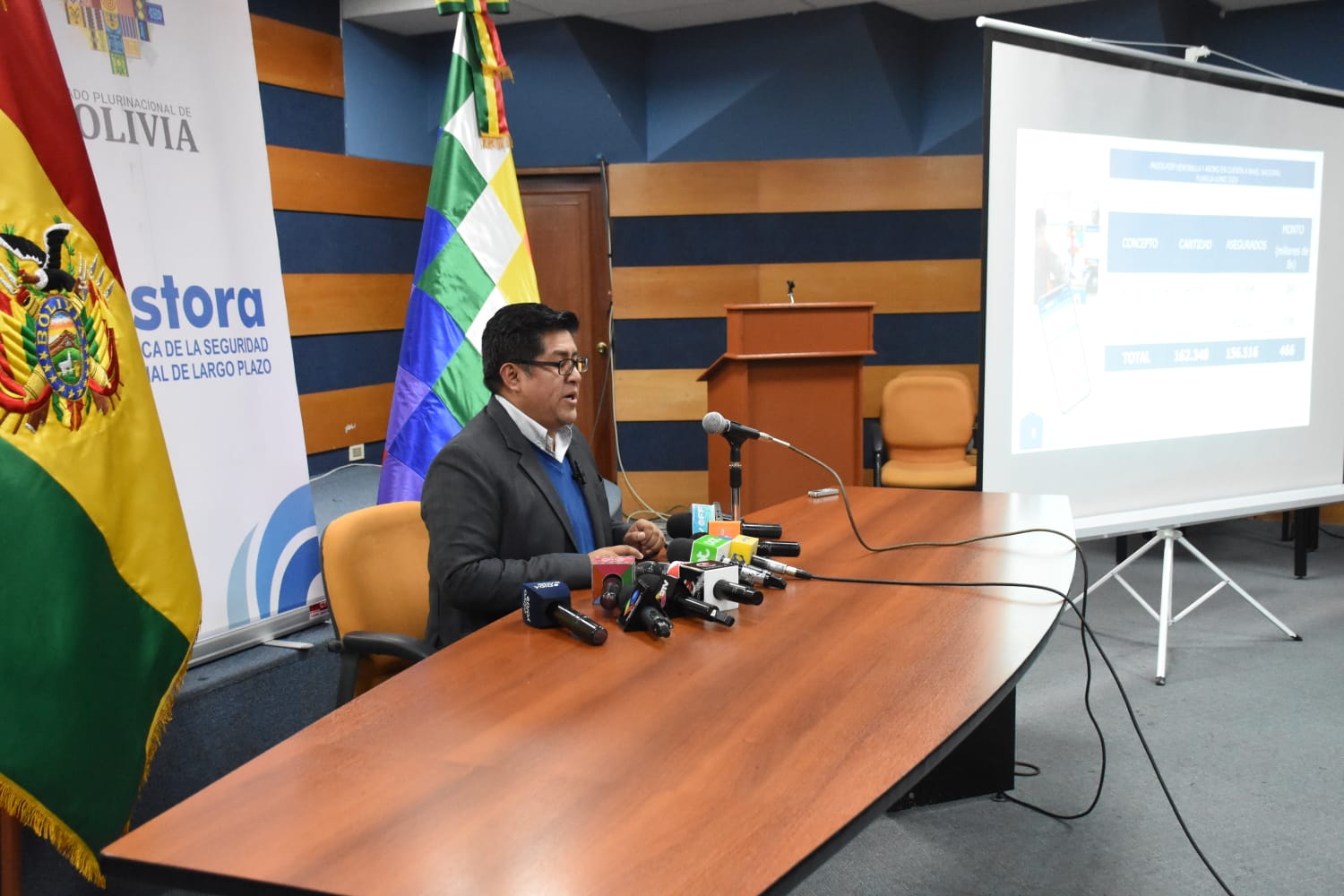 El Gerente General de la Gestora Pública, Jaime Durán Chuquimia, brinda conferencia de Prensa sobre el tema de evaluación del segundo mes de pago de pensiones a cargo de la Gestora. Fotos: Jorge Mamani