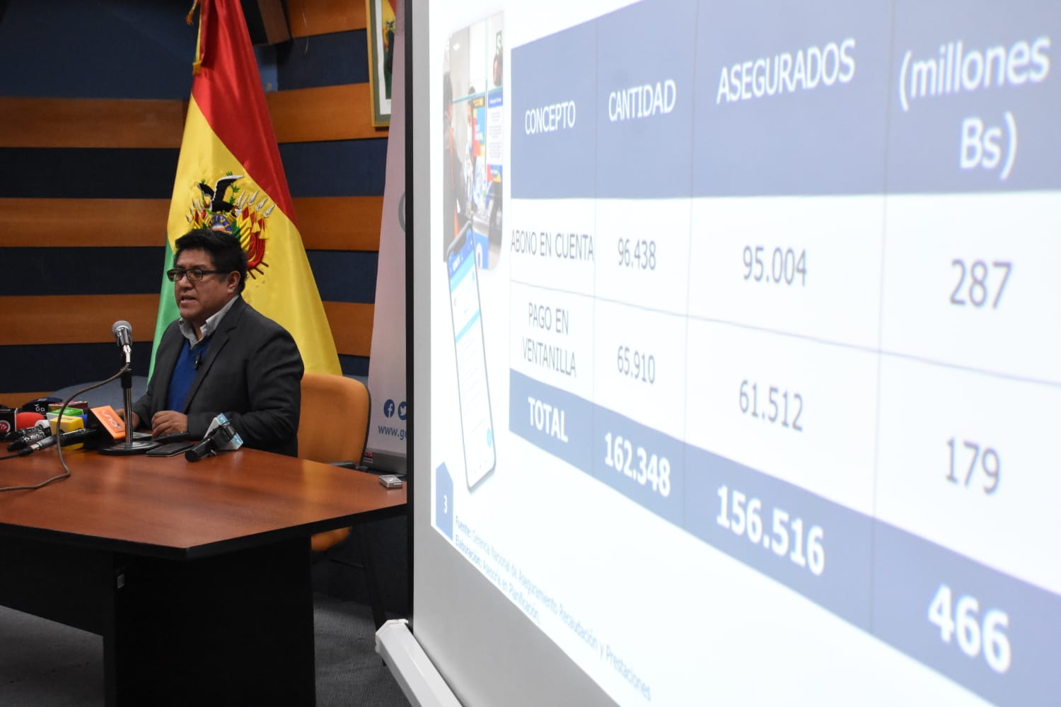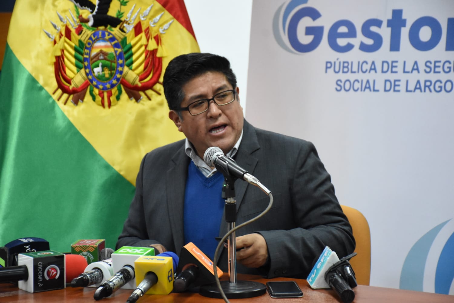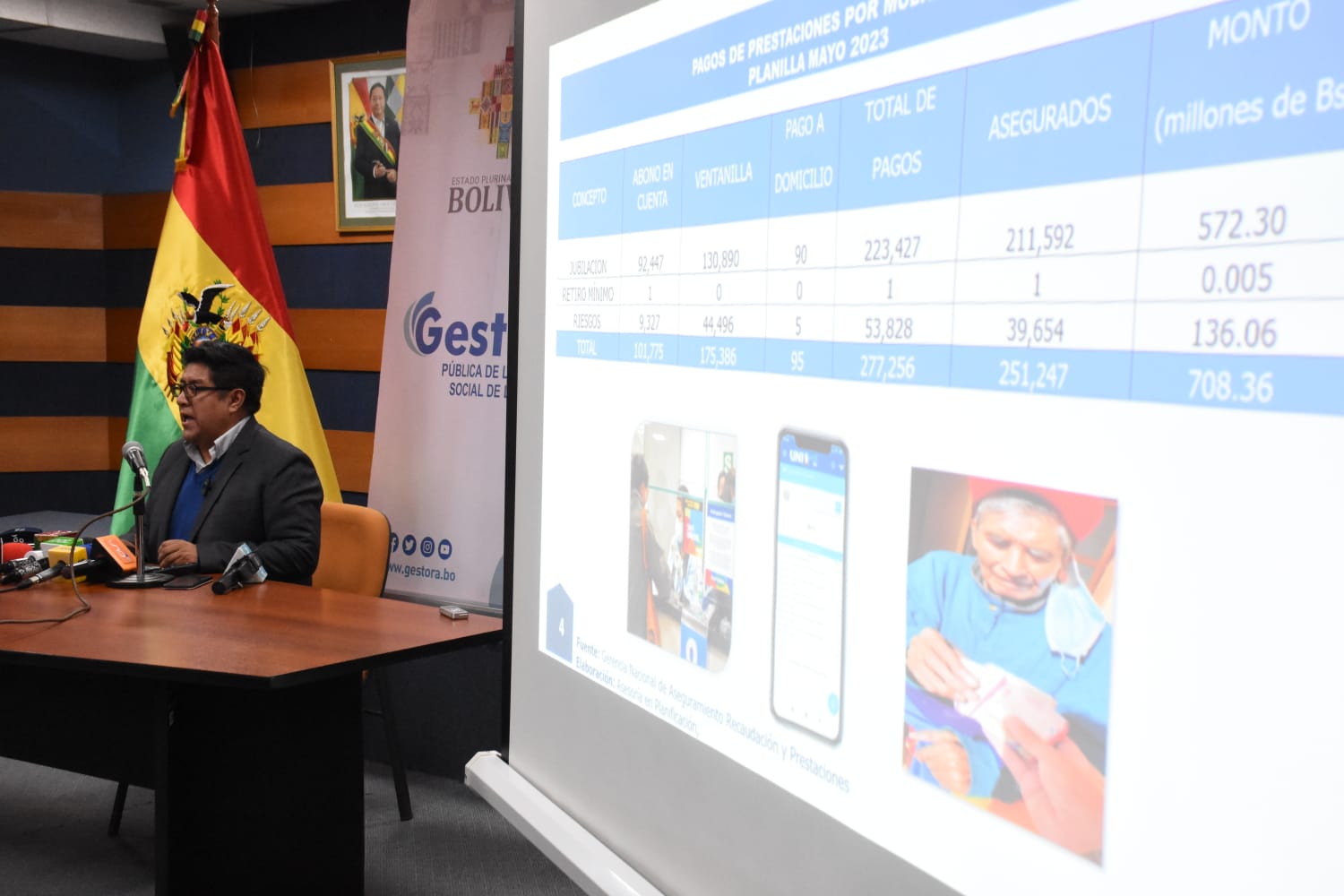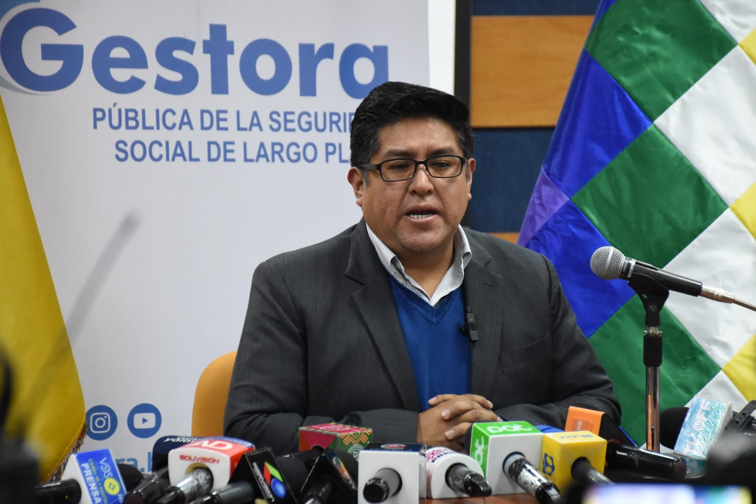 El Gerente General de la Gestora Pública, Jaime Durán Chuquimia, brinda conferencia de Prensa sobre el tema de evaluación del segundo mes de pago de pensiones a cargo de la Gestora. Fotos: Jorge Mamani