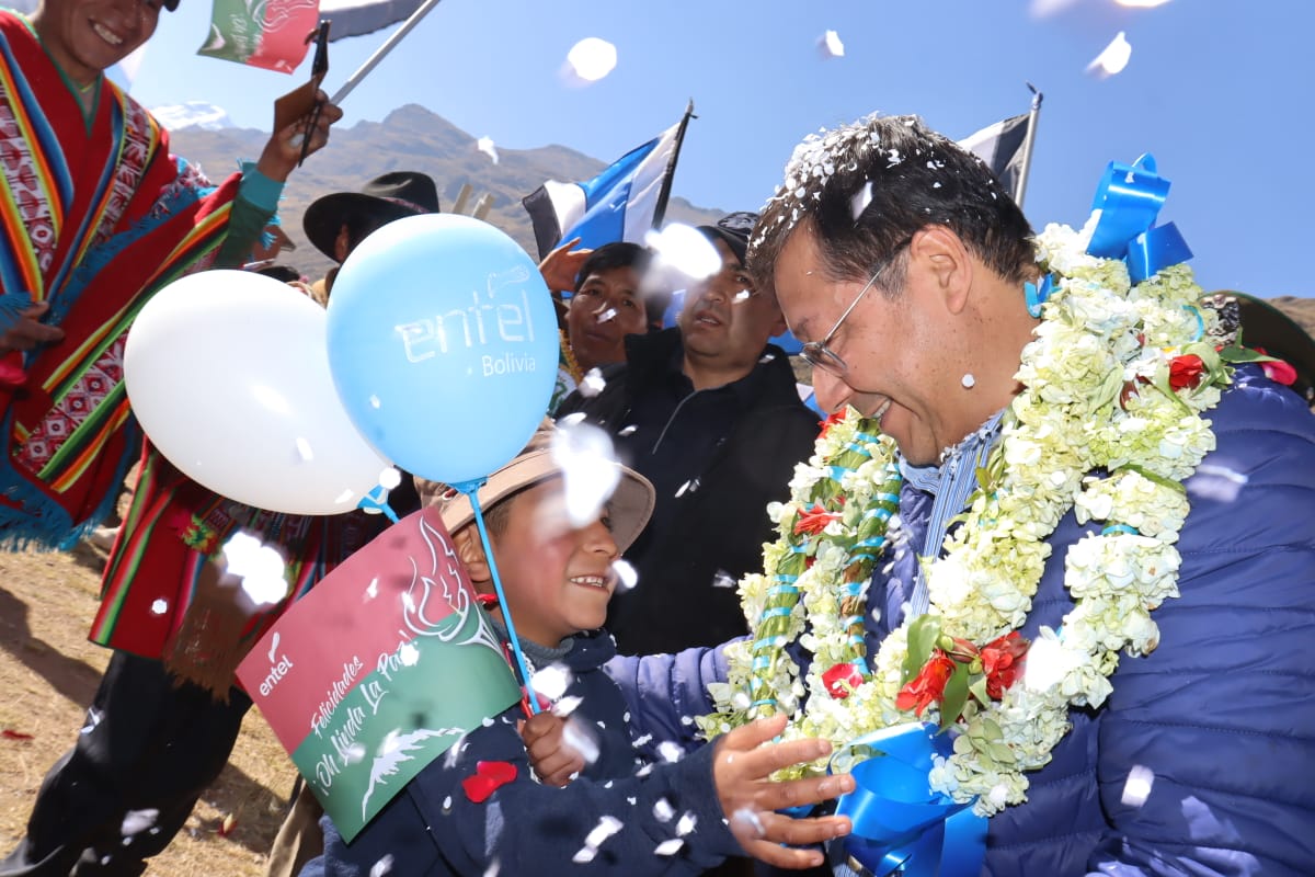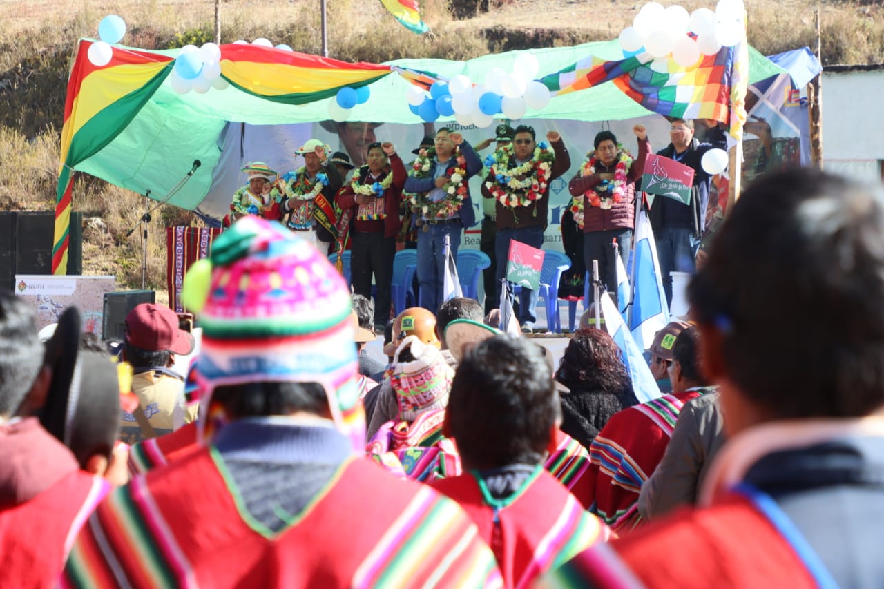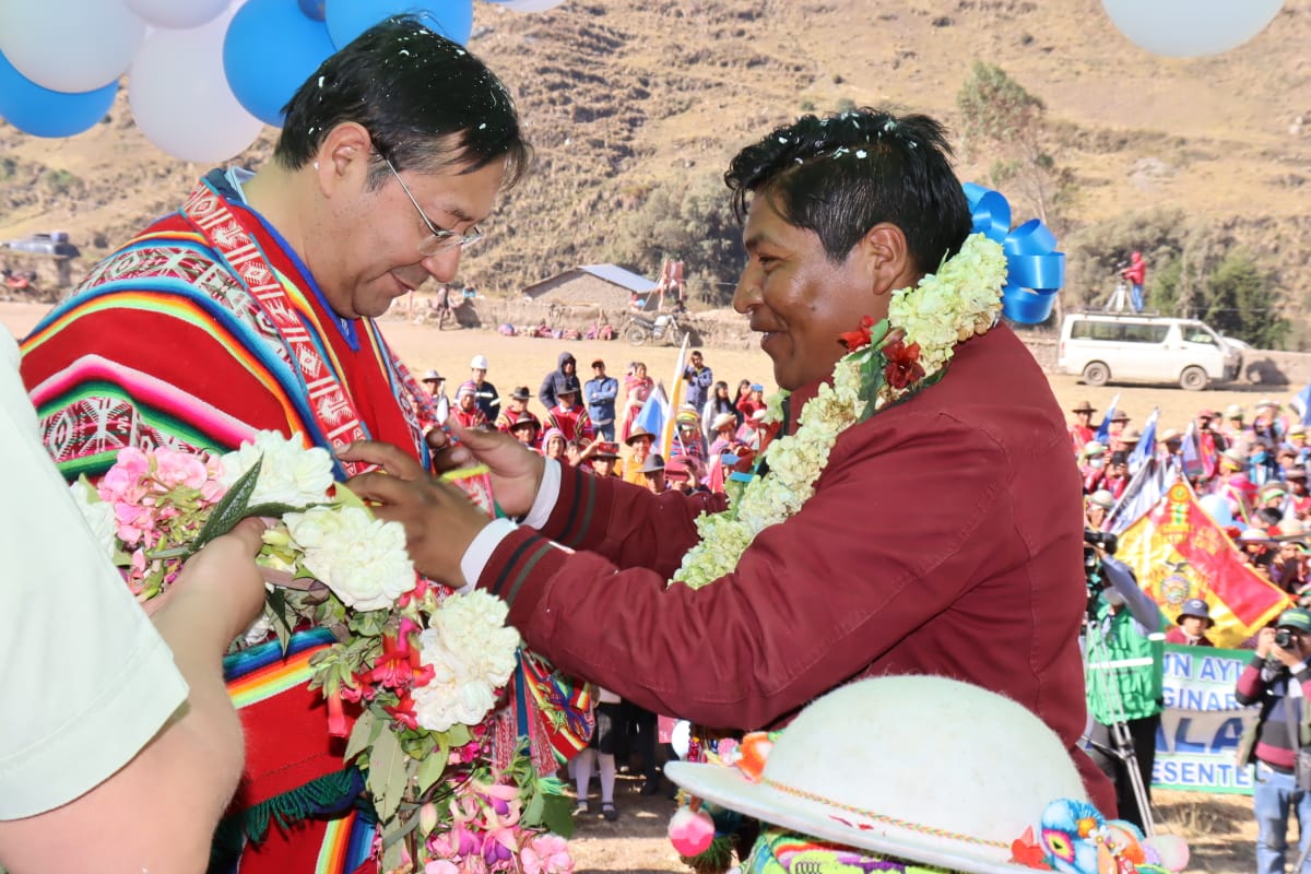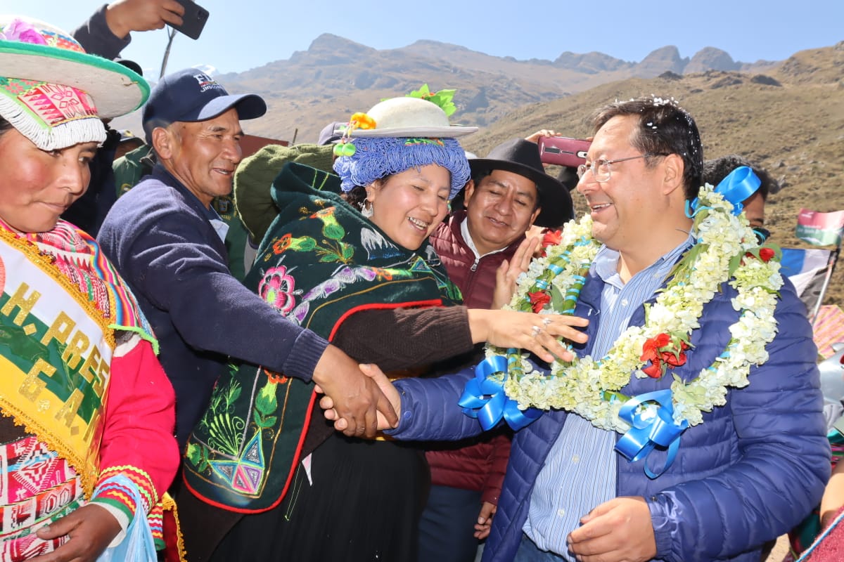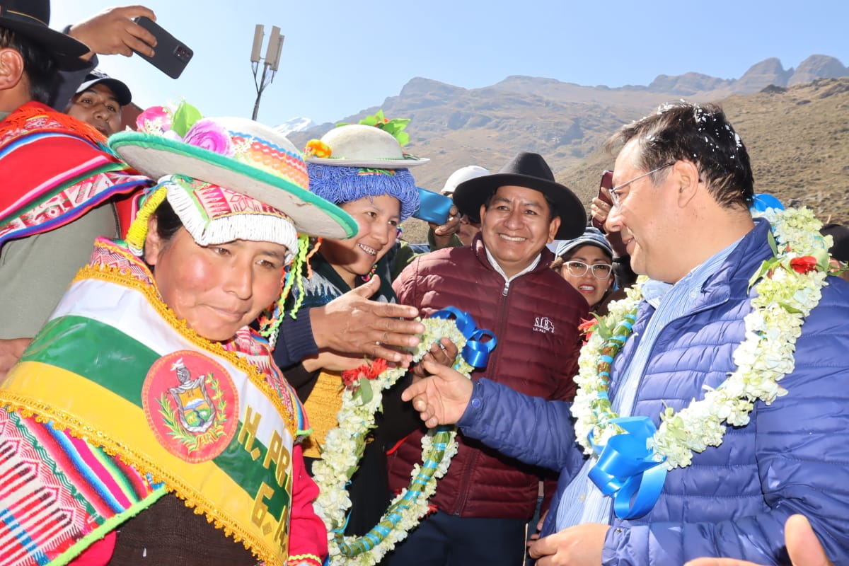 Presidente del Estado Luis Arce, entrega el mejoramiento del Sistema de Producción de Trucha, Construcción de Reservorios de Agua y Radio Bases en el municipio de Curva, La Paz. Fuente: Comunicación Presidencial