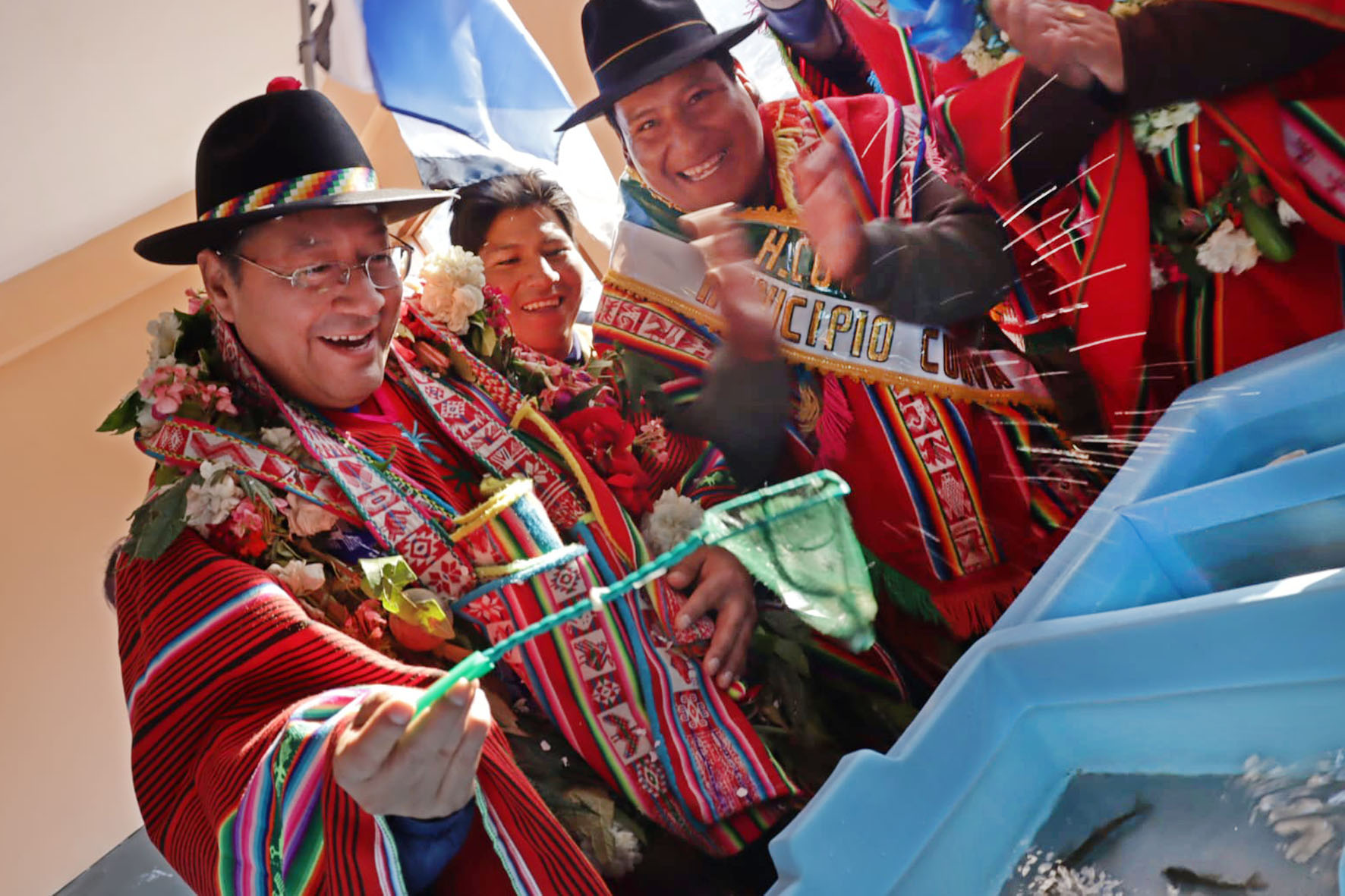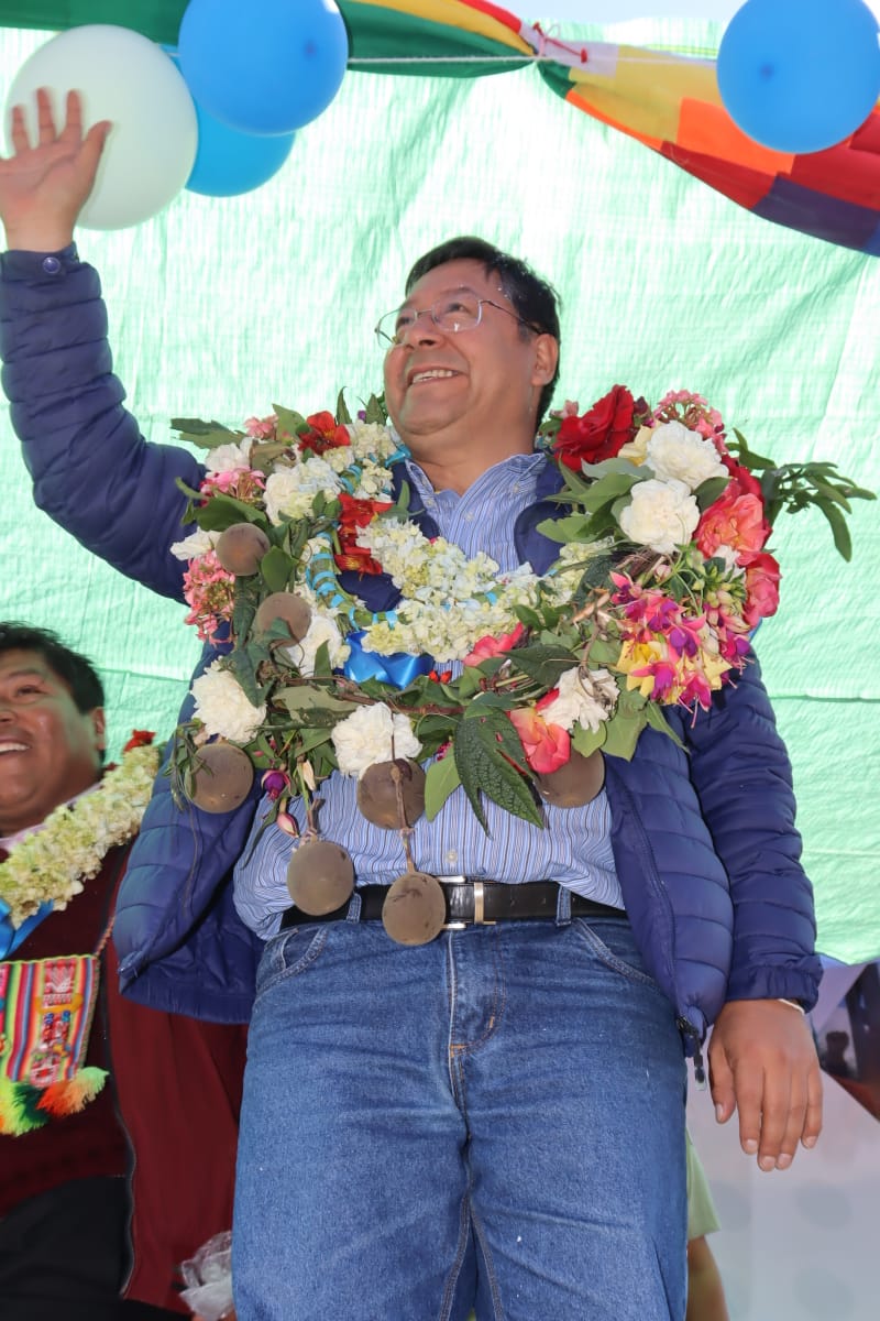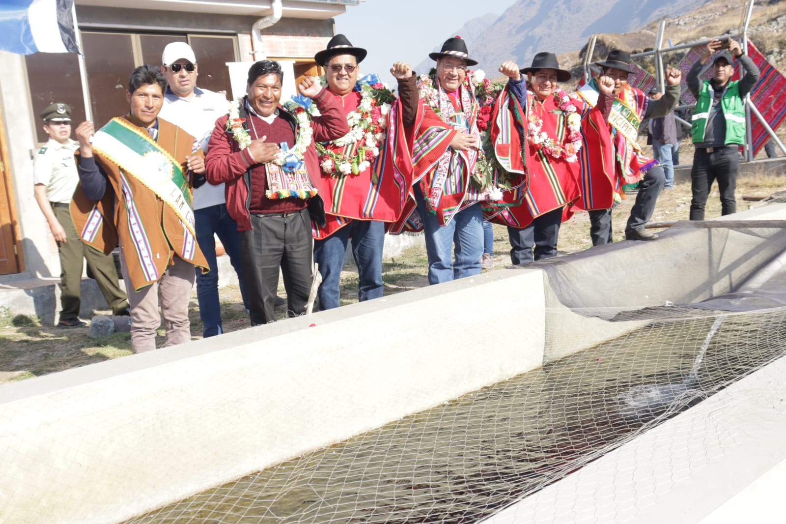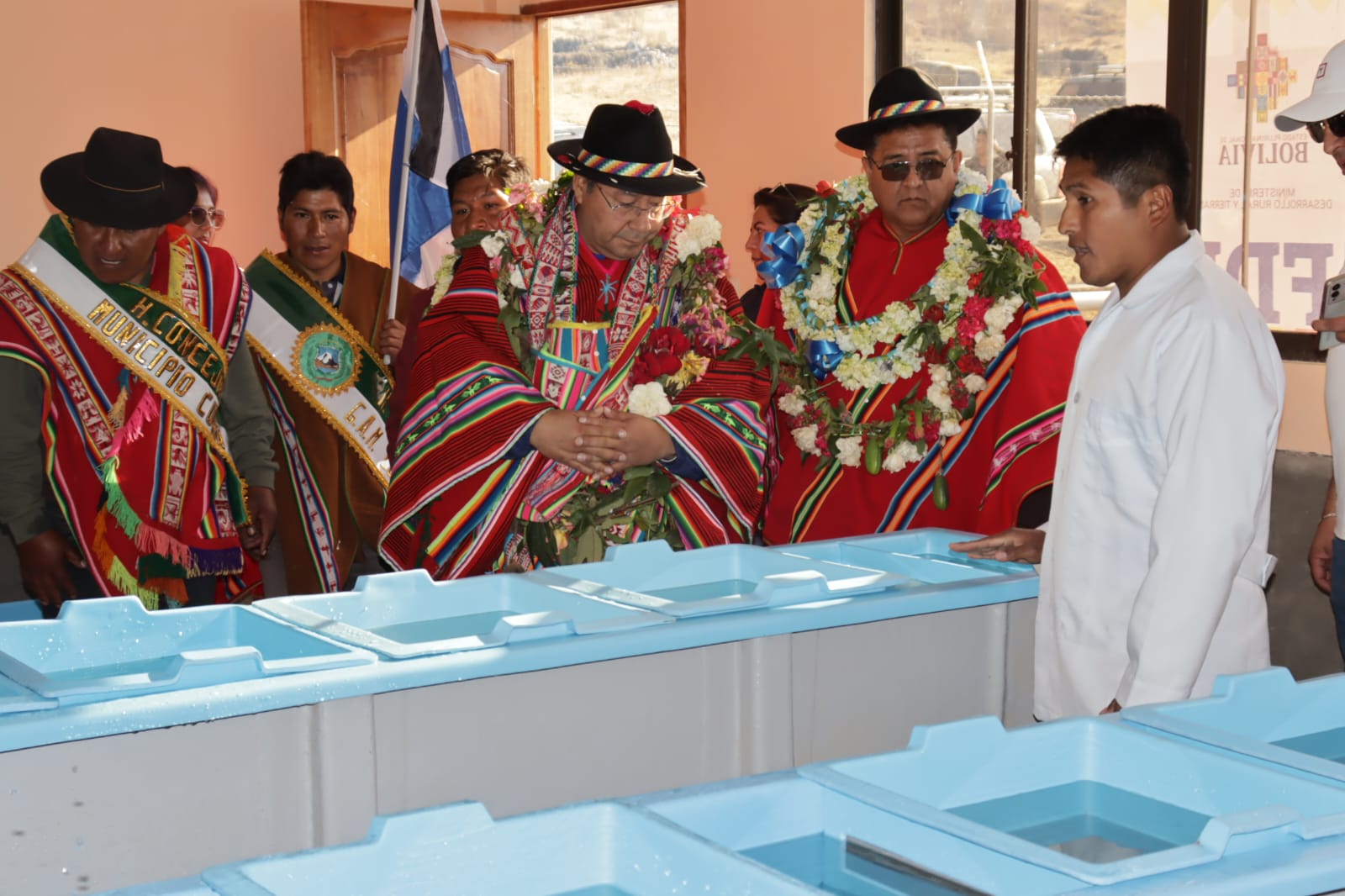 Presidente del Estado Luis Arce, entrega el mejoramiento del Sistema de Producción de Trucha, Construcción de Reservorios de Agua y Radio Bases en el municipio de Curva, La Paz. Fuente: Comunicación Presidencial