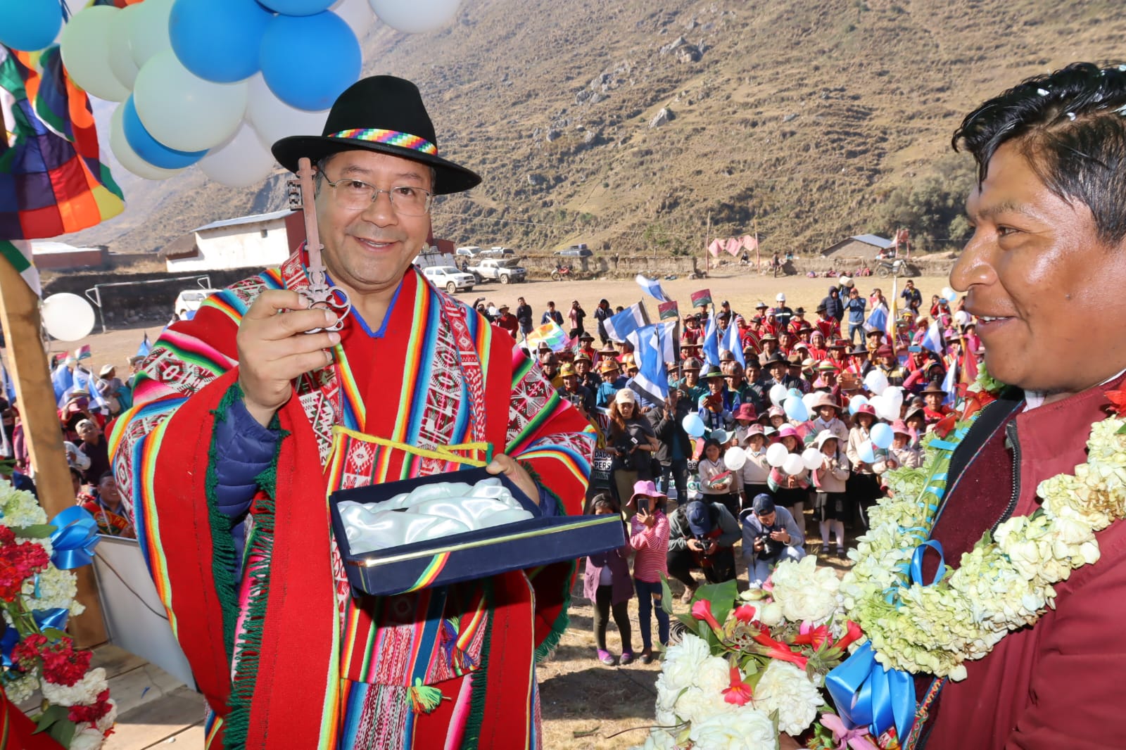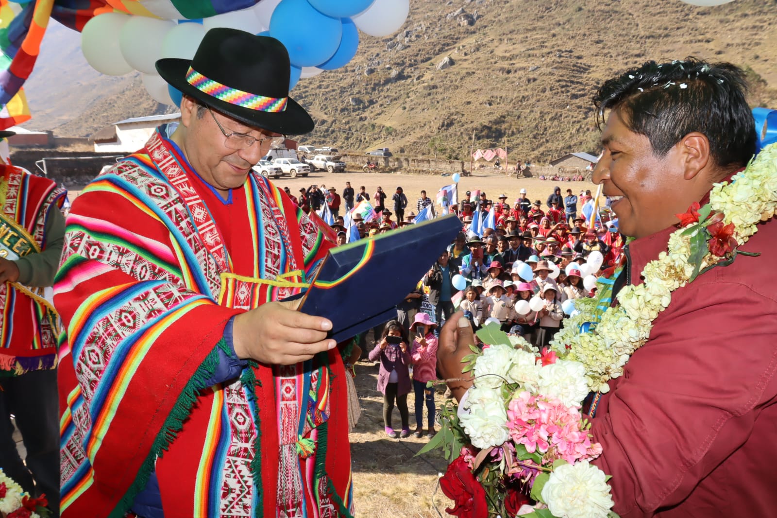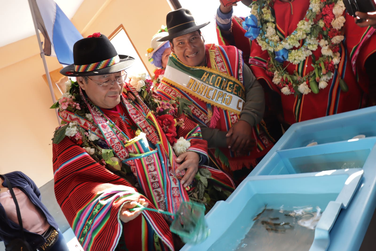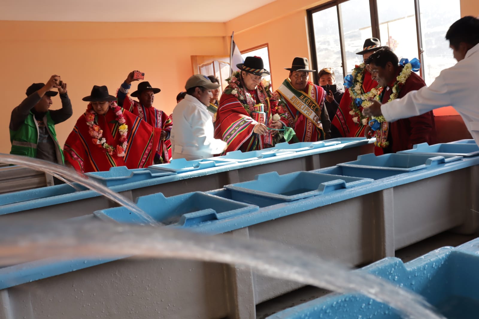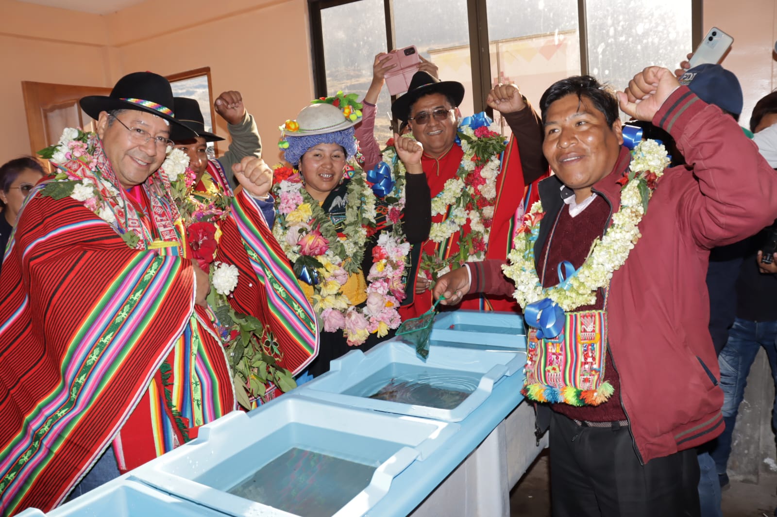 Presidente del Estado Luis Arce, entrega el mejoramiento del Sistema de Producción de Trucha, Construcción de Reservorios de Agua y Radio Bases en el municipio de Curva, La Paz. Fuente: Comunicación Presidencial