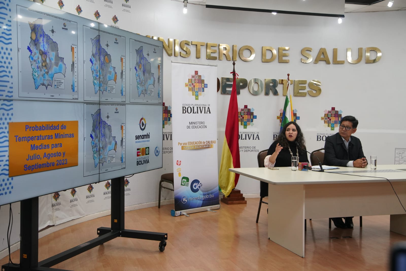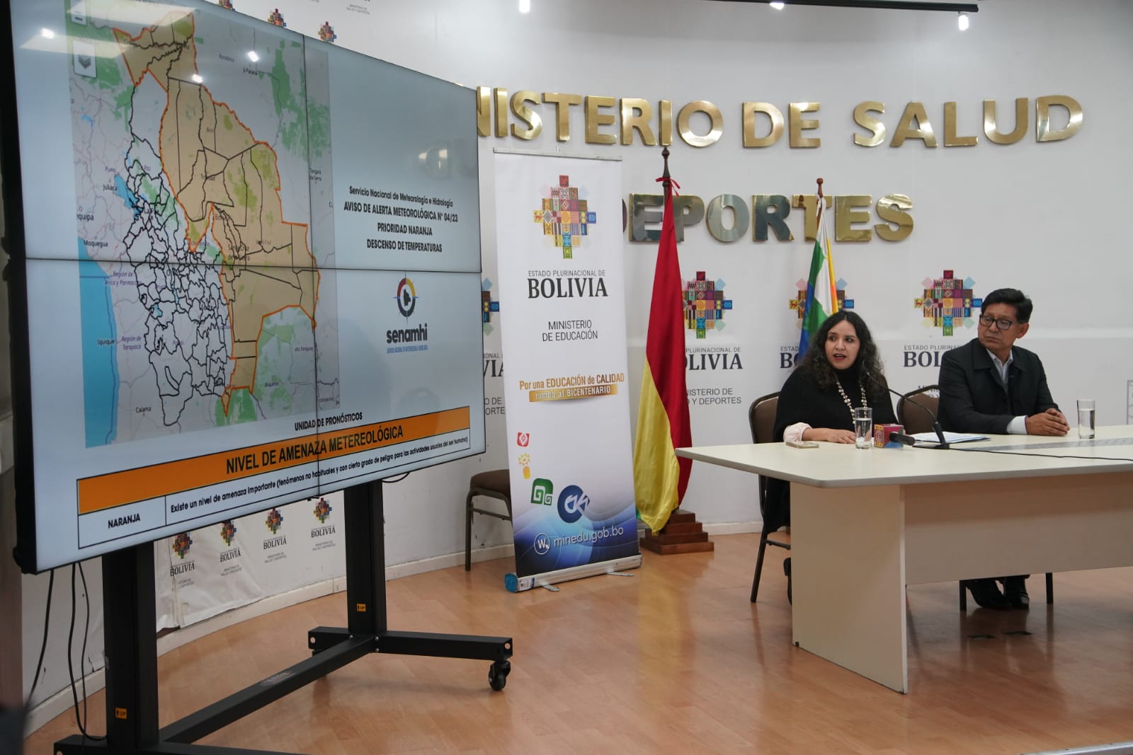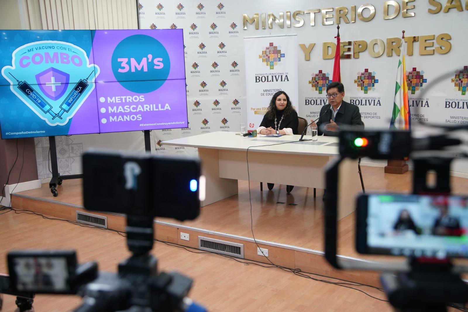 Conferencia de prensa de la Ministra de Salud María Renee Castro y el Ministro de Educación Edgar Pary, sobre la ampliación del descanso pedagógico por una semana más. Fotos: Jorge Mamani