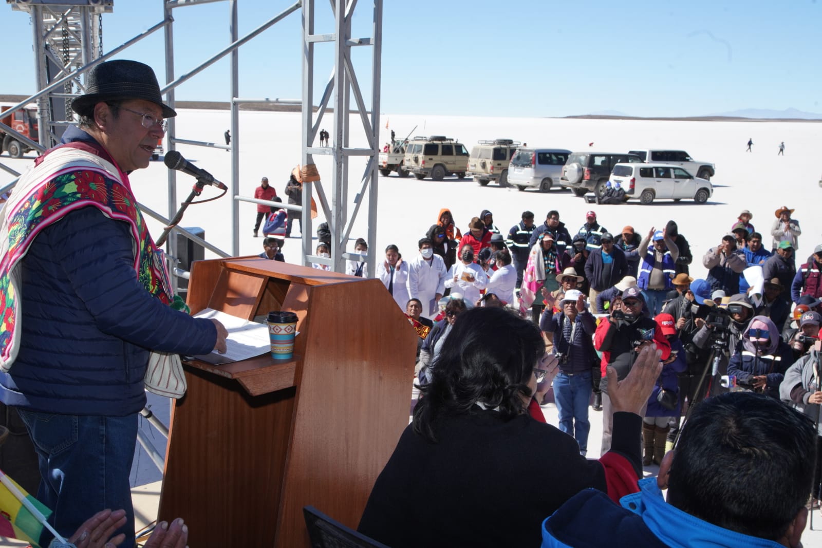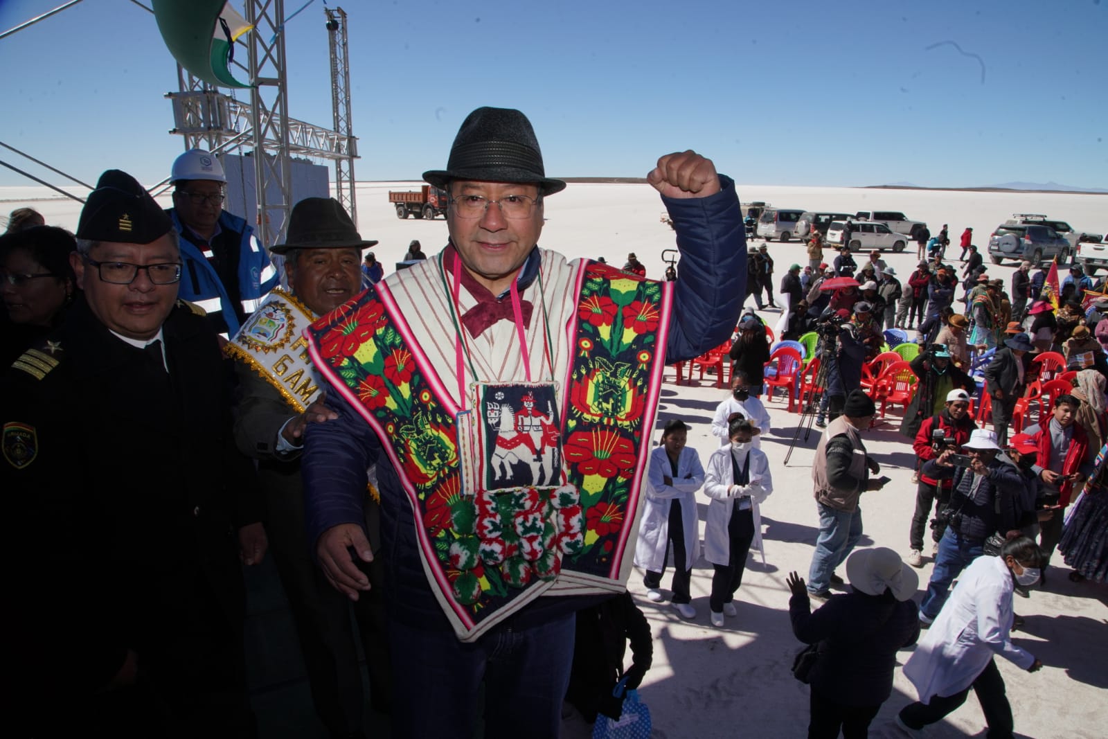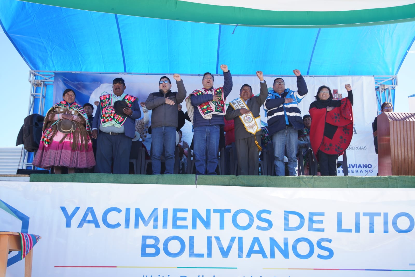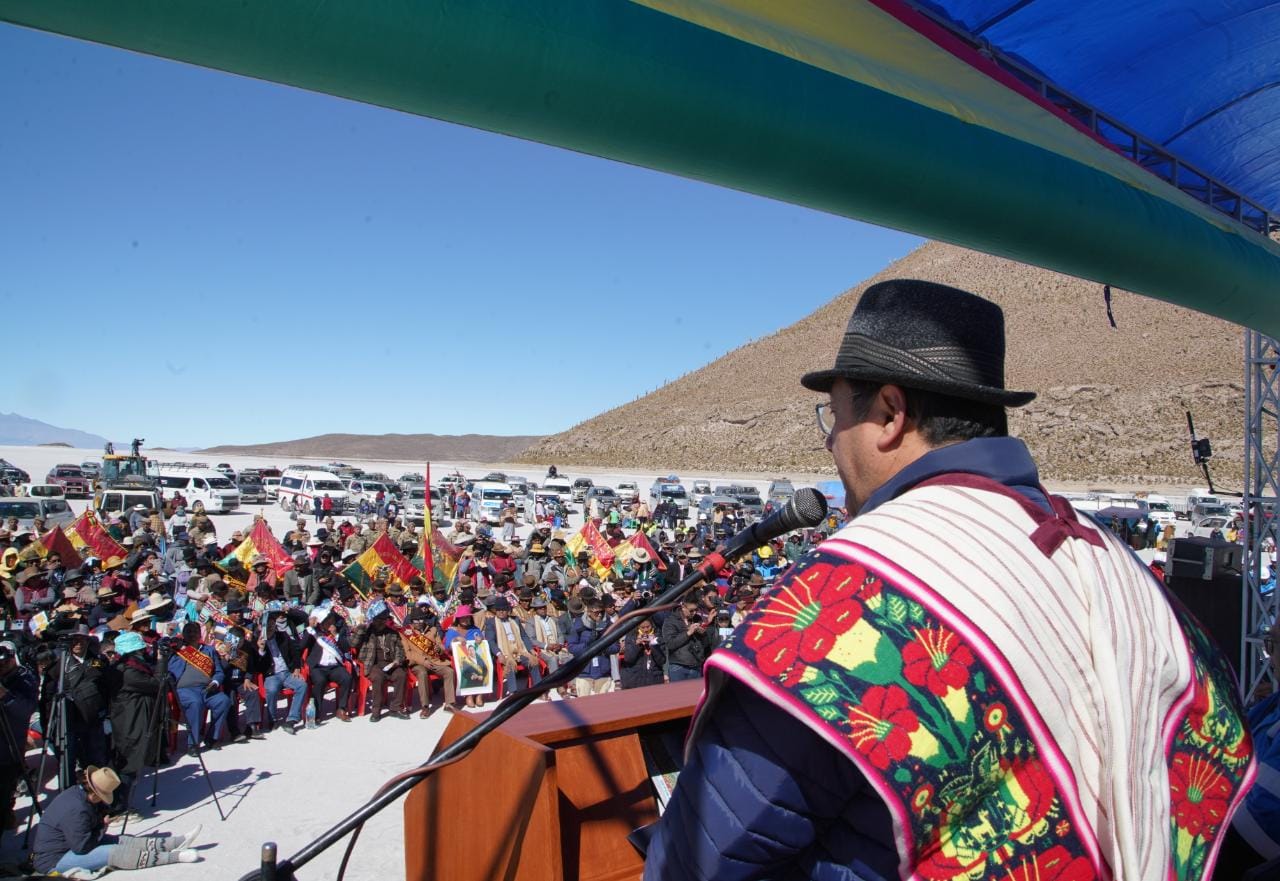 Presidente del Estado Luis Arce, anuncia en el municipio de Coipasa, Oruro, la cuantificación de reservas de litio que existe en Bolivia. Fuente: Comunicación Presidencial.