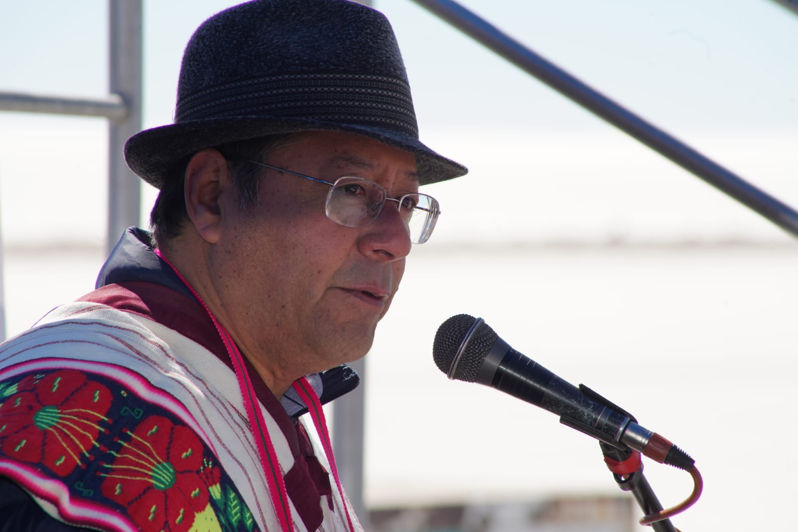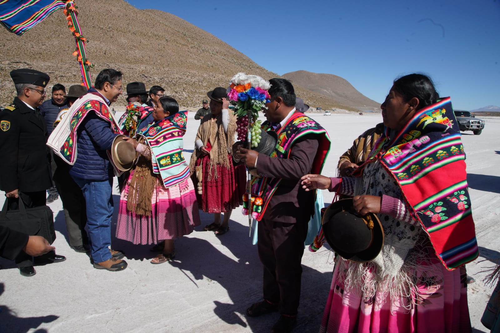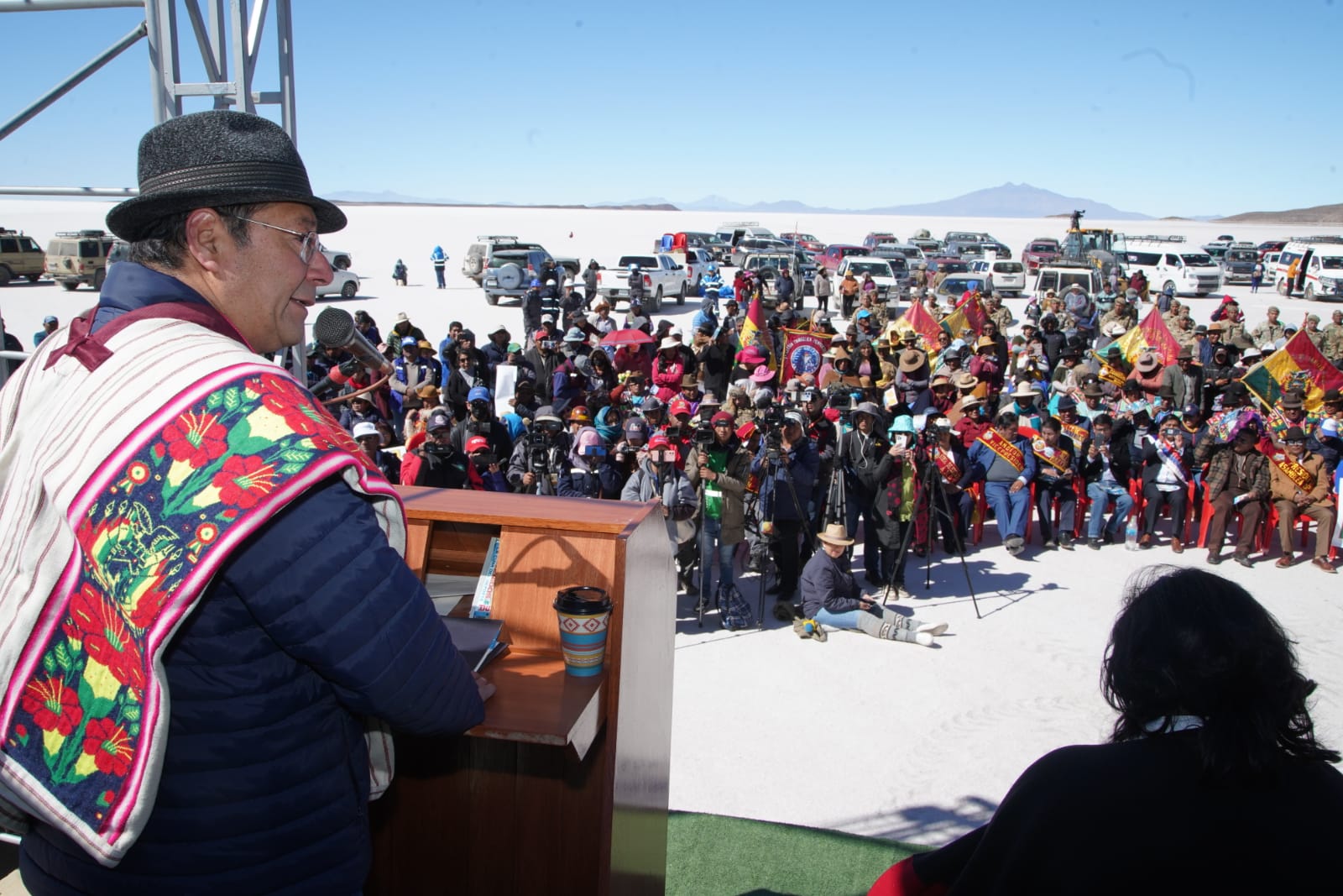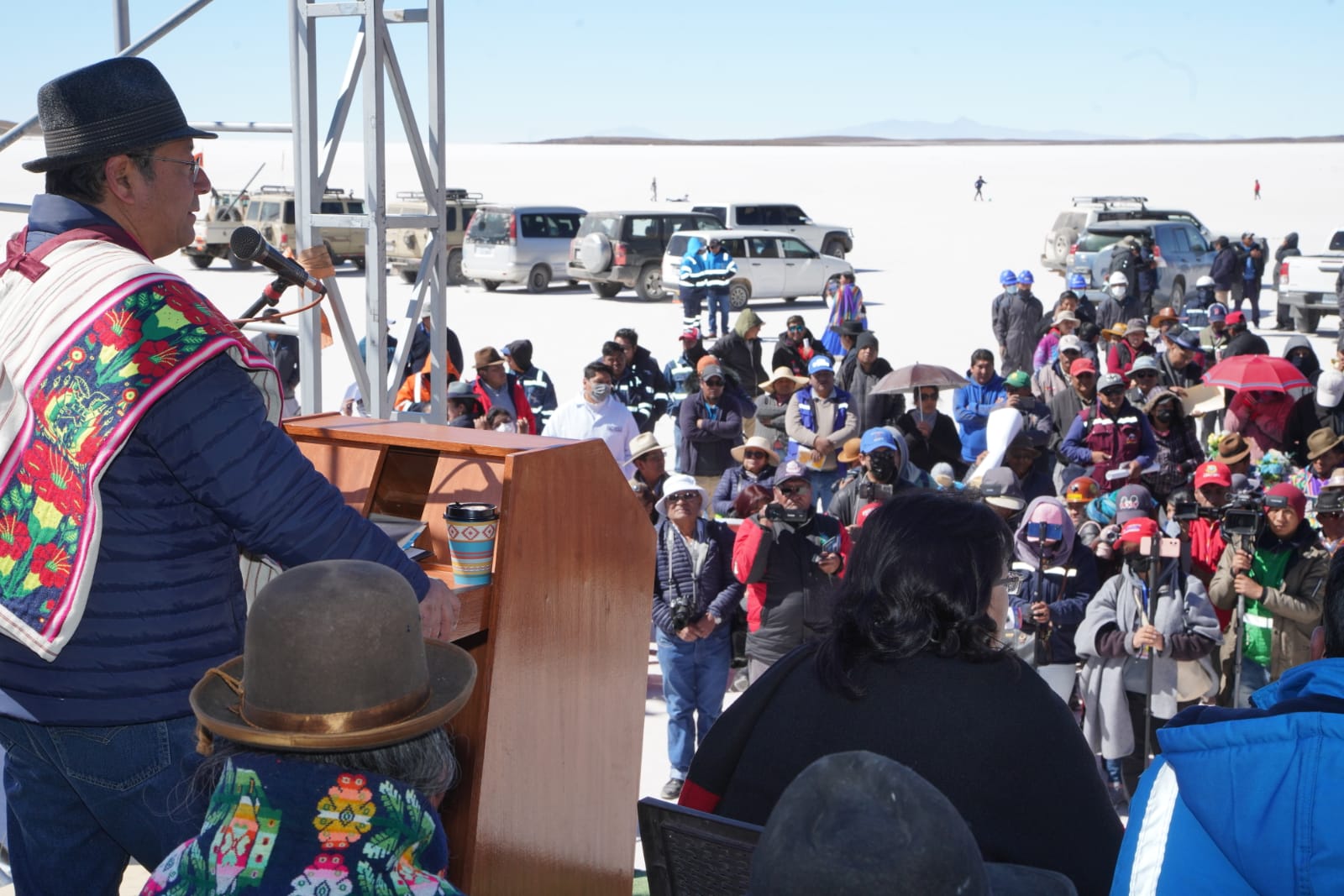 Presidente del Estado Luis Arce, anuncia en el municipio de Coipasa, Oruro, la cuantificación de reservas de litio que existe en Bolivia. Fuente: Comunicación Presidencial.