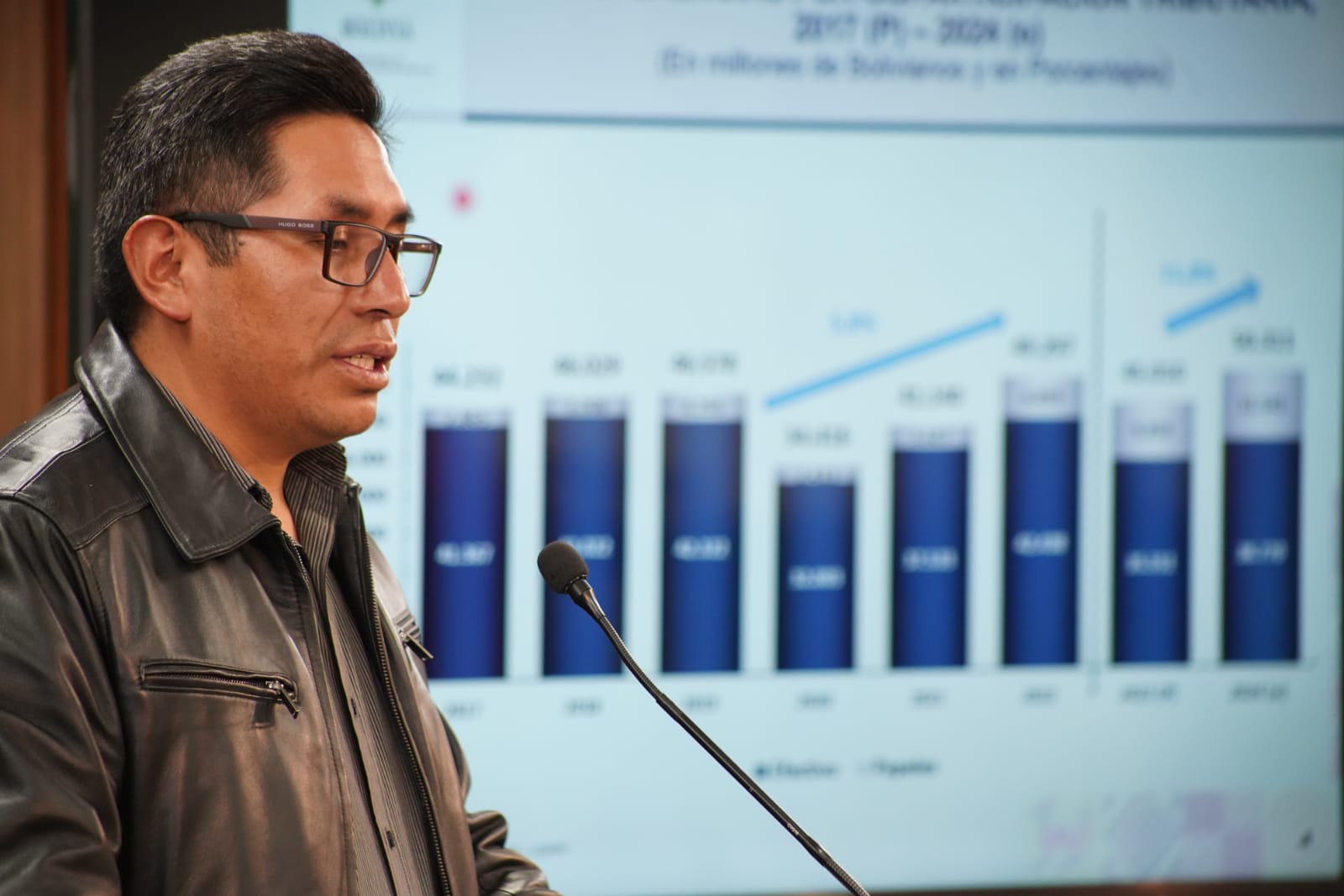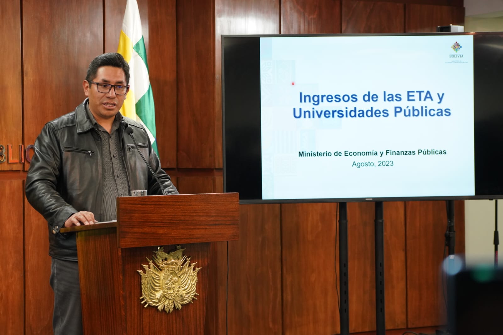 Viceministro de Presupuesto y Contabilidad Fiscal Zenón Mamani, informa sobre el proyecto de Presupuesto General del Estado (PGE) 2024 que establece un incremento de 1,6% para Entidades Territoriales Autónomas (ETA) y universidades públicas. Fotos: Jorge Mamani