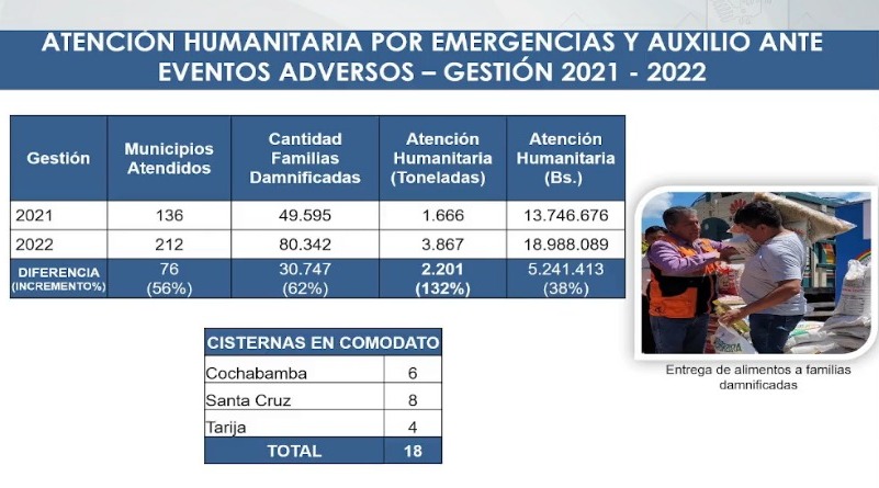 “En la gestión 2022 se han atendido 212 municipios, 80.342 familias damnificadas y se ha entregado 3.867 toneladas y esto obviamente tienen un costo, se ha invertido 18.988.089, que significa un 38 por ciento adicional en relación a la gestión 2021”, informó Calvimontes, durante la rendición de cuentas del Ministerio de Defensa.