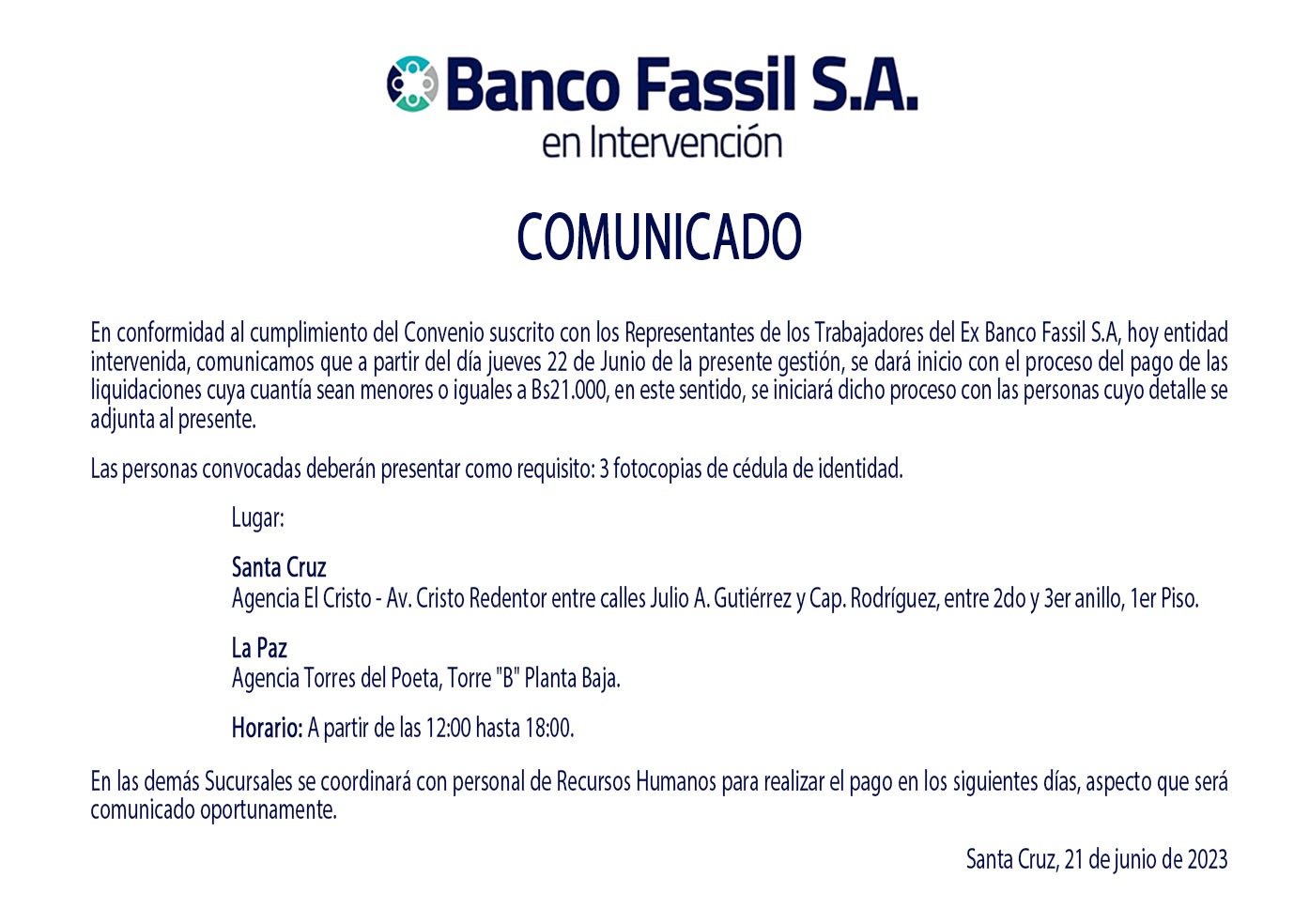 “A partir del día jueves 22 de junio de la presente gestión, se dará inicio con el proceso del pago de las liquidaciones cuya cuantía sea menor o igual a Bs 21.000; en este sentido, se iniciará dicho proceso con las personas cuyo detalle se adjunta al presente”, indica un comunicado.