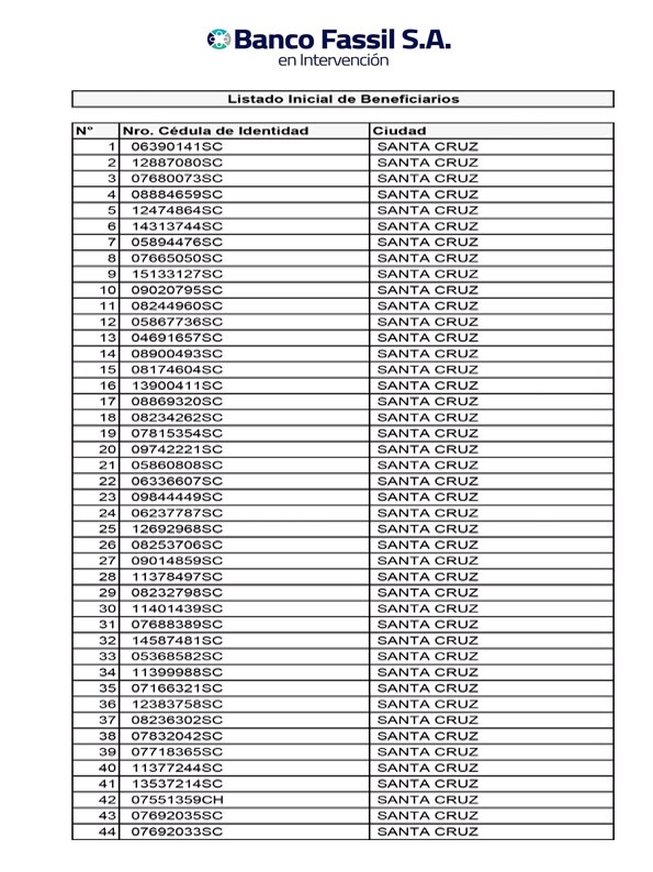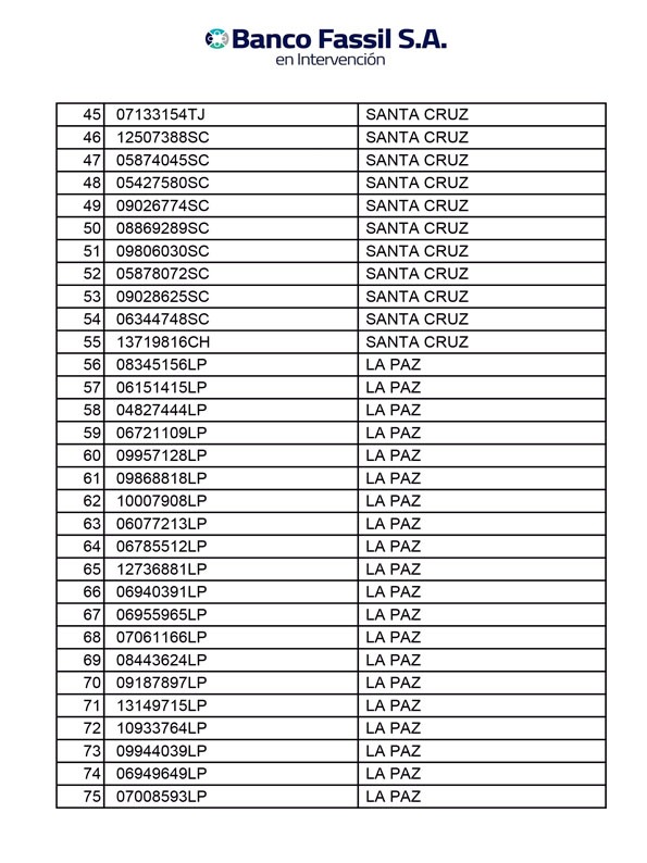 En ese sentido, se publicó la lista con el número de cédula de identidad de los beneficiarios que alcanzan a 75. Las personas convocadas deberán presentar como requisito tres fotocopias de cédula de identidad, en agencias de Santa Cruz y La Paz, de 12h00 hasta 18h00.