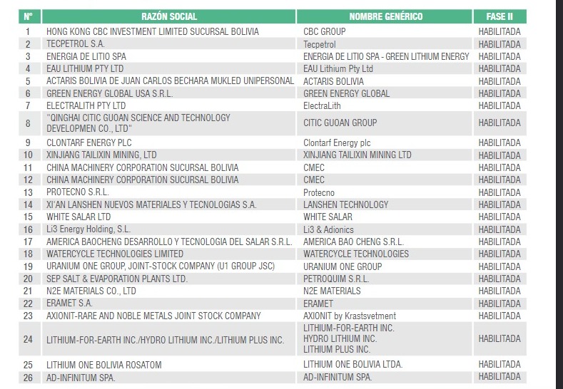 A través de un comunicado, la empresa estatal publicó la lista de las 26 firmas habilitadas, luego de que una comisión técnica de YLB verificara el cumplimiento de requisitos, de acuerdo a la convocatoria, refiere un boletín institucional.