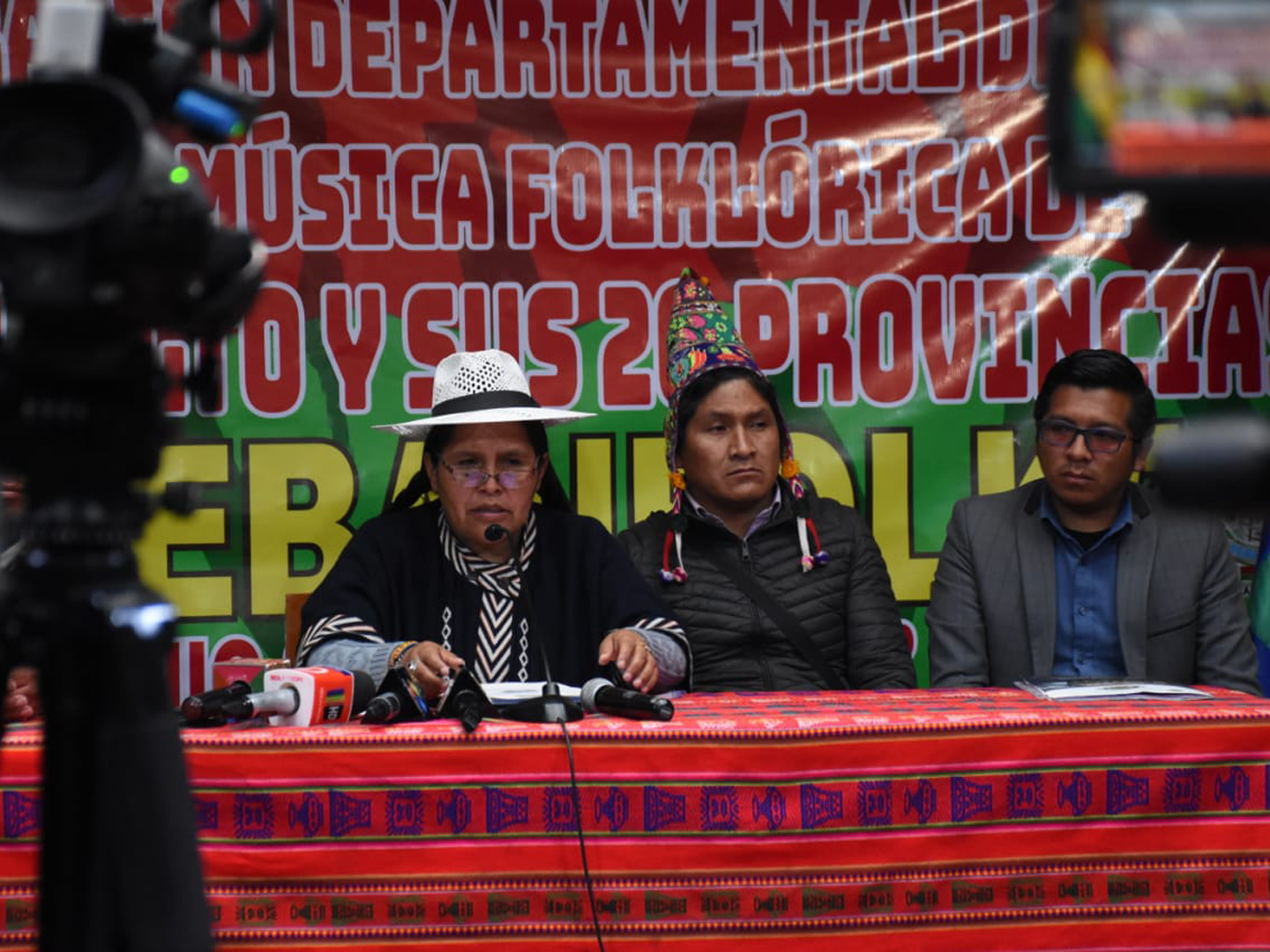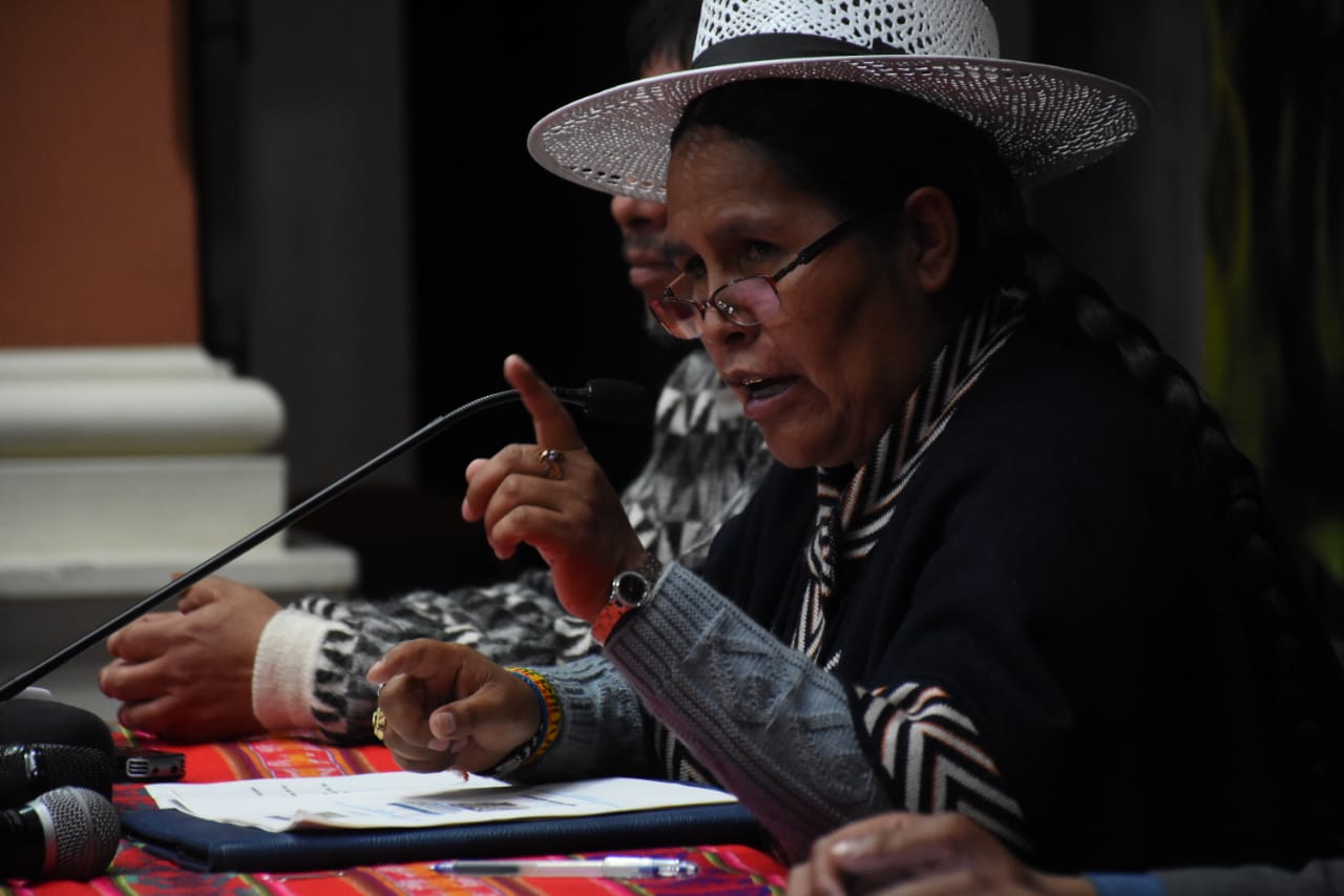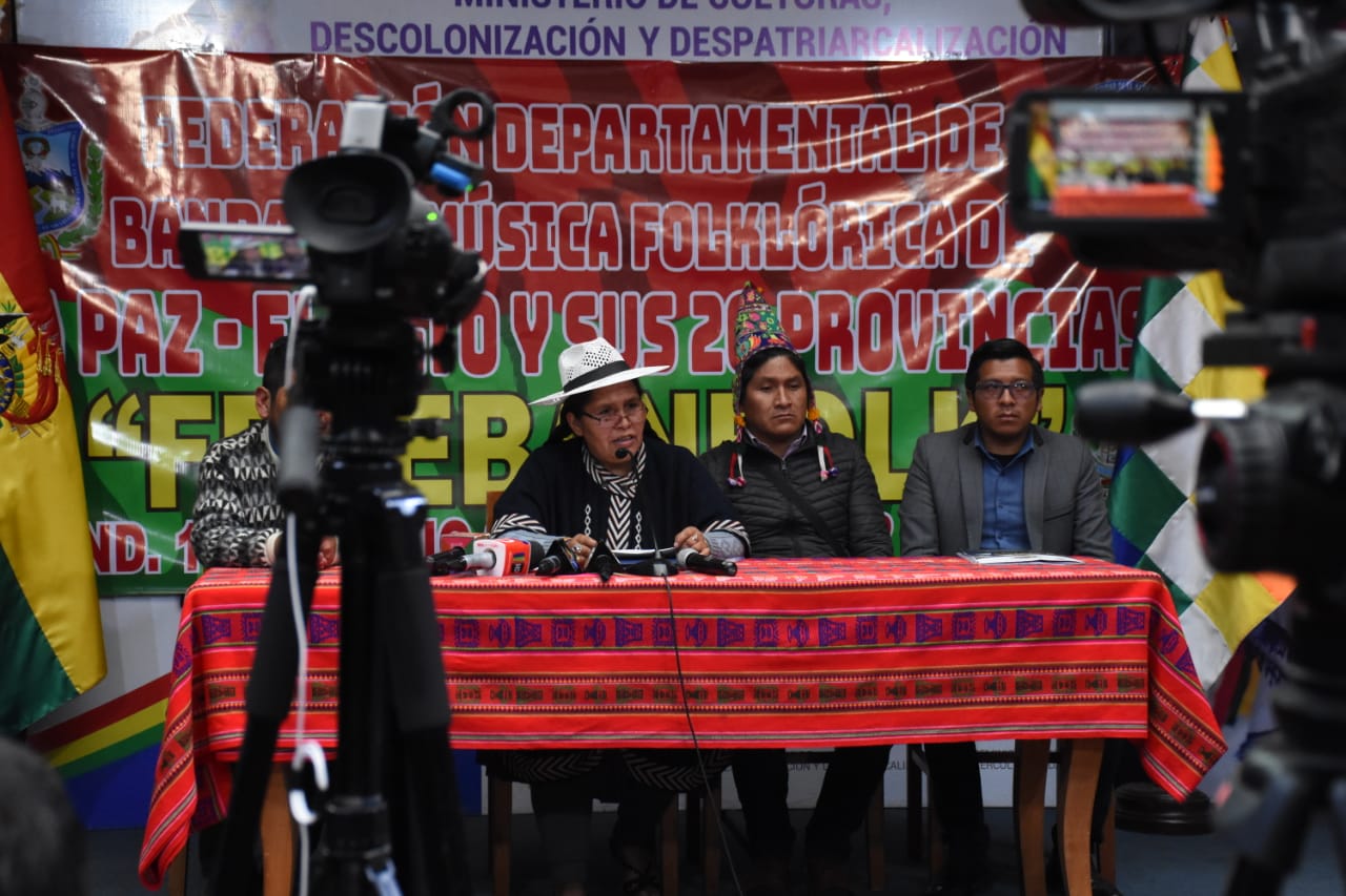 La Ministra de Culturas Sabina Orellana, en conferencia de prensa sobre la posición frente al anuncio del representante de Bandas de Músicos de Puno, de prohibir la participación de Bandas Bolivianas en la Festividad de Candelaria