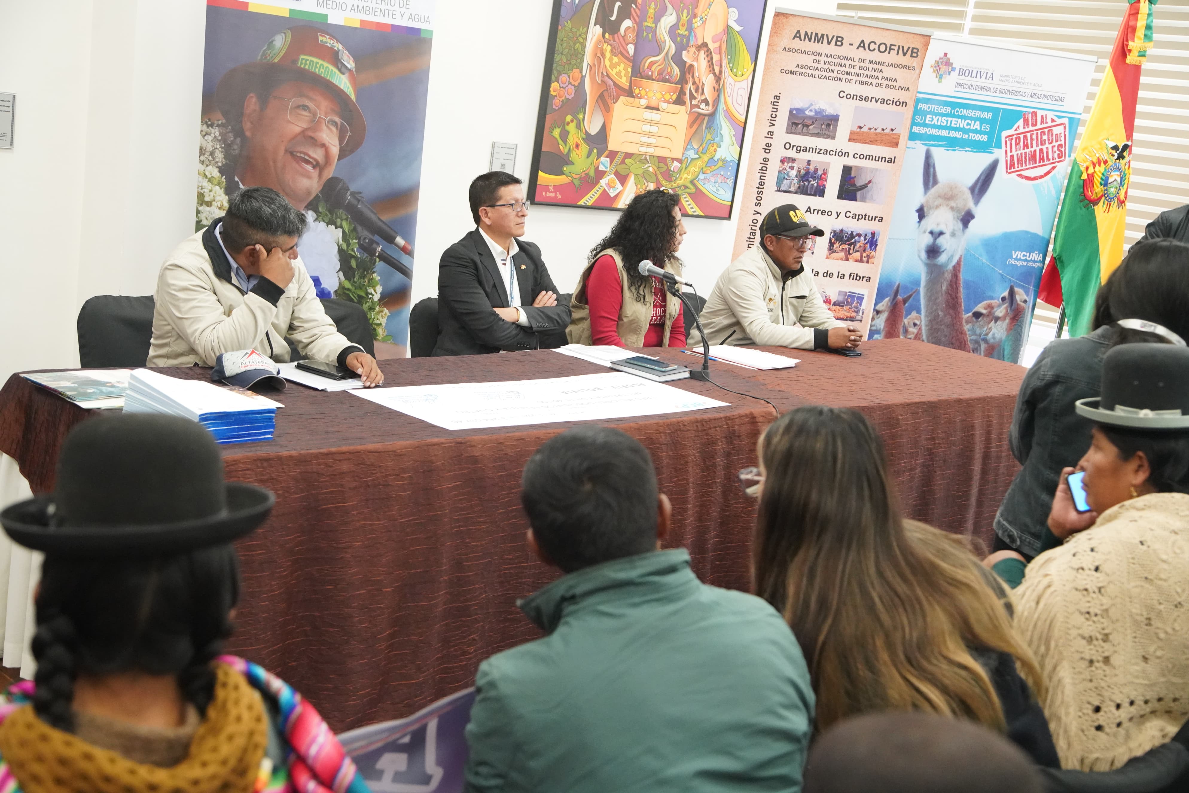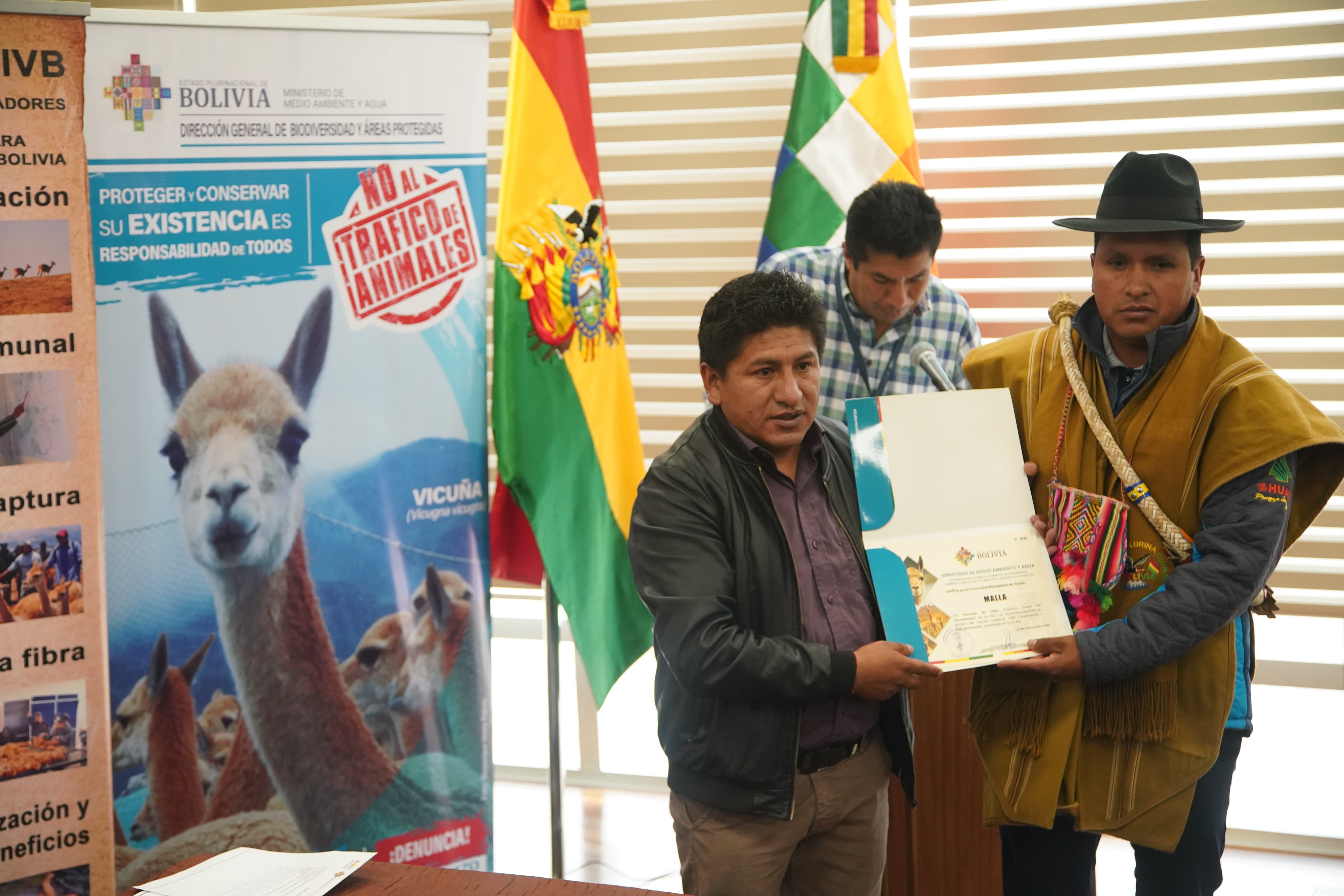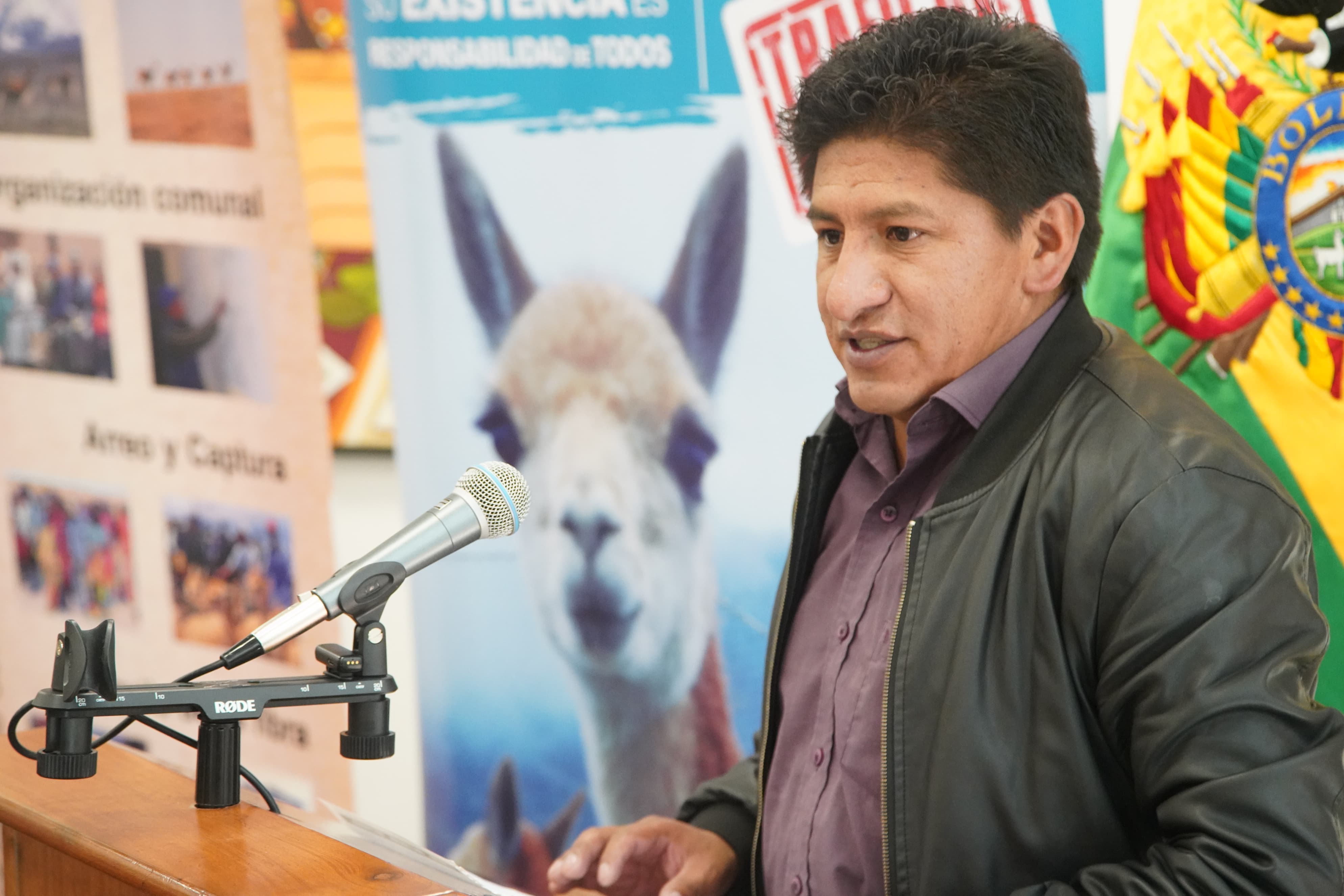 Entrega de recursos económicos por un monto de 300.264.037 Bs. en favor de la asociación nacional de manejadores de vicuña de 52 comunidades, por el vocero Omar Tejerina director general de Gestión y desarrollo forestal
