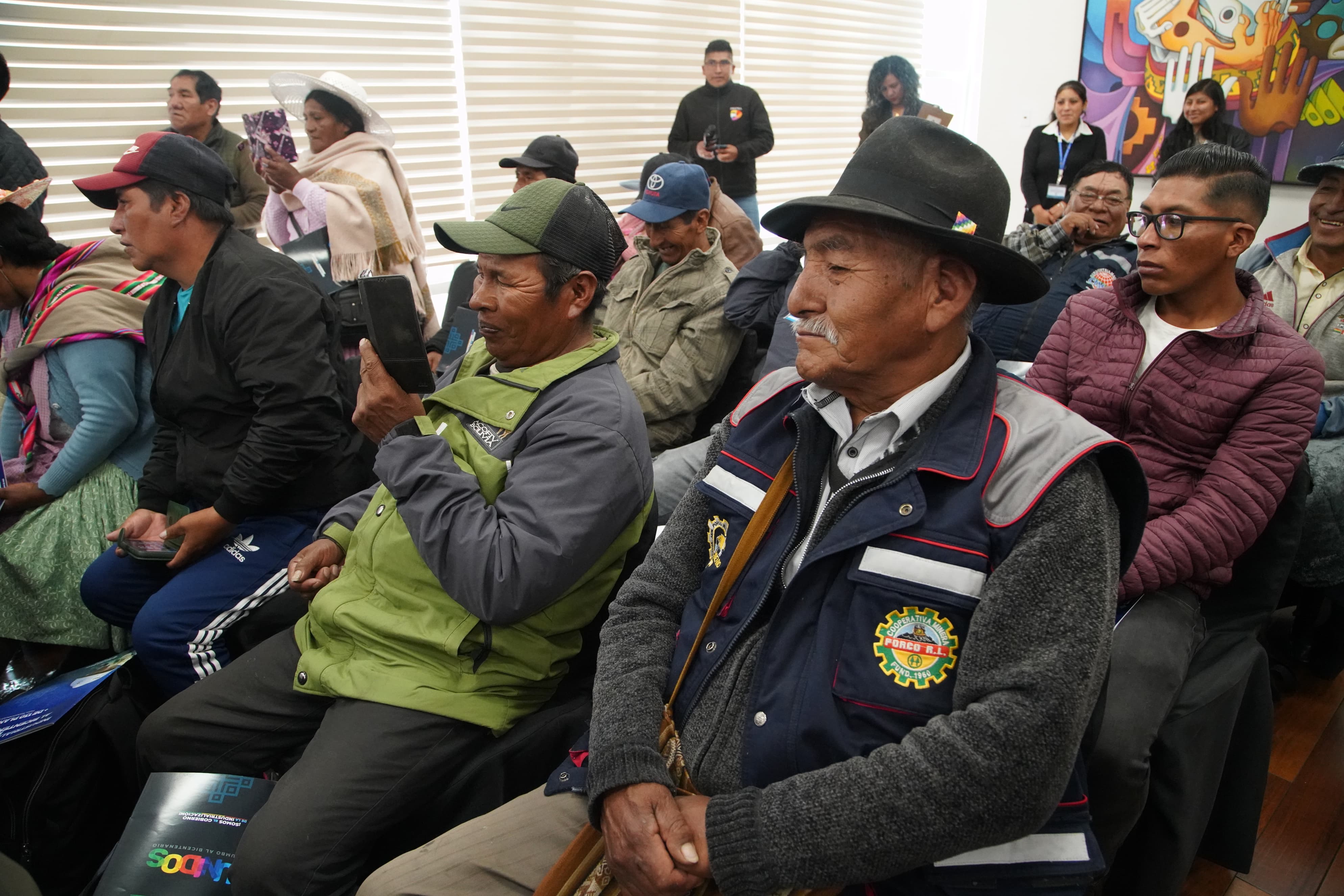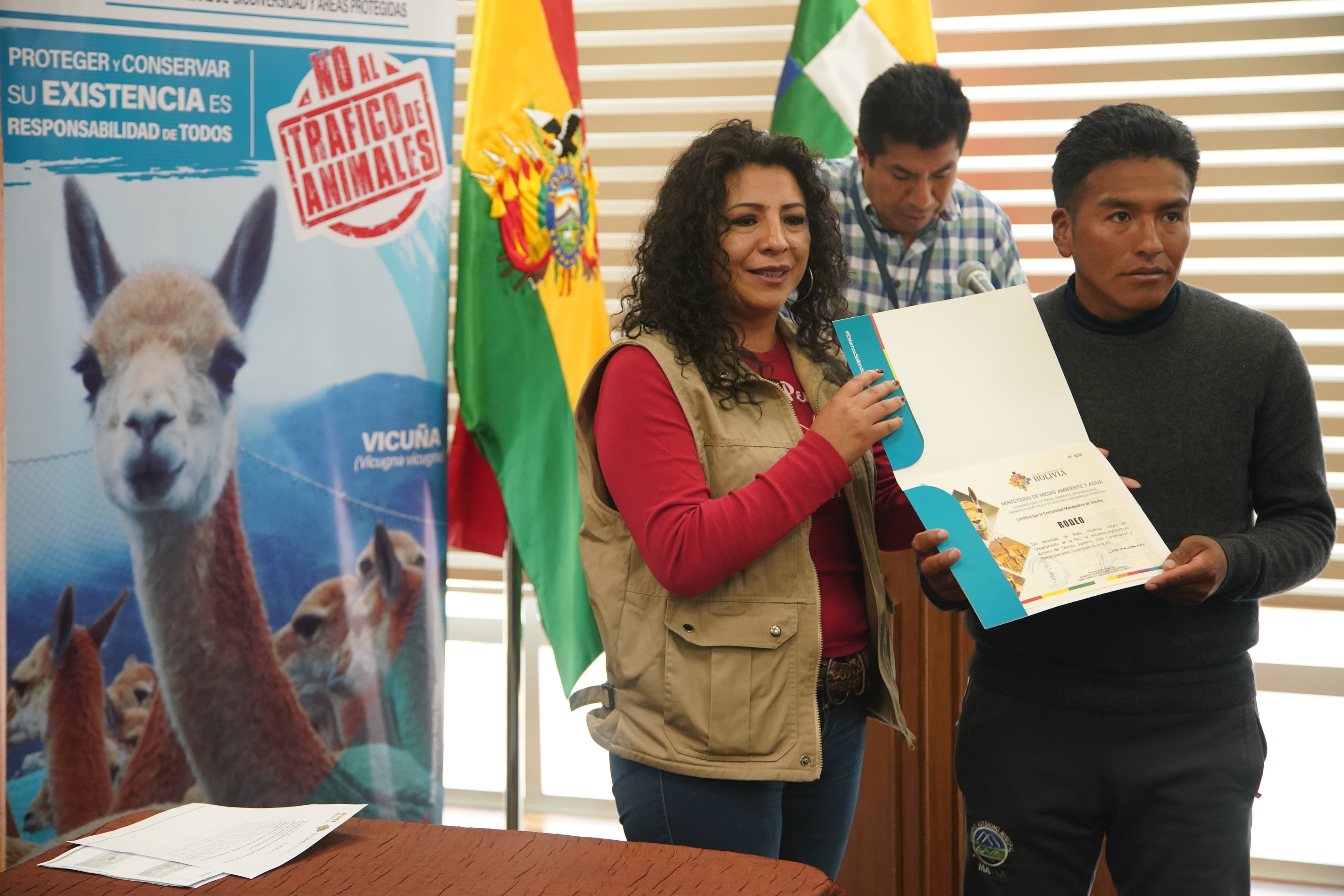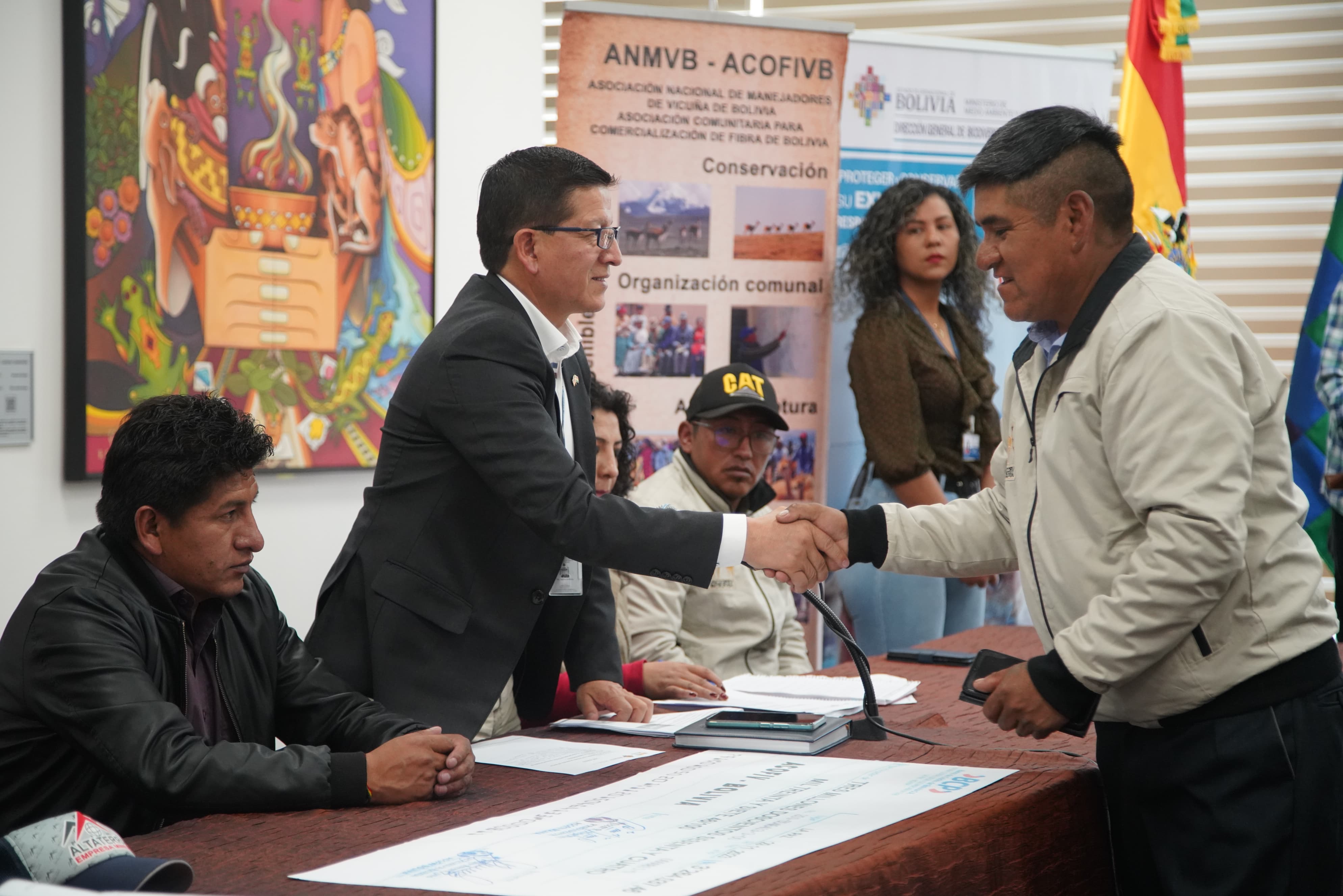 Entrega de recursos económicos por un monto de 300.264.037 Bs. en favor de la asociación nacional de manejadores de vicuña de 52 comunidades, por el vocero Omar Tejerina director general de Gestión y desarrollo forestal