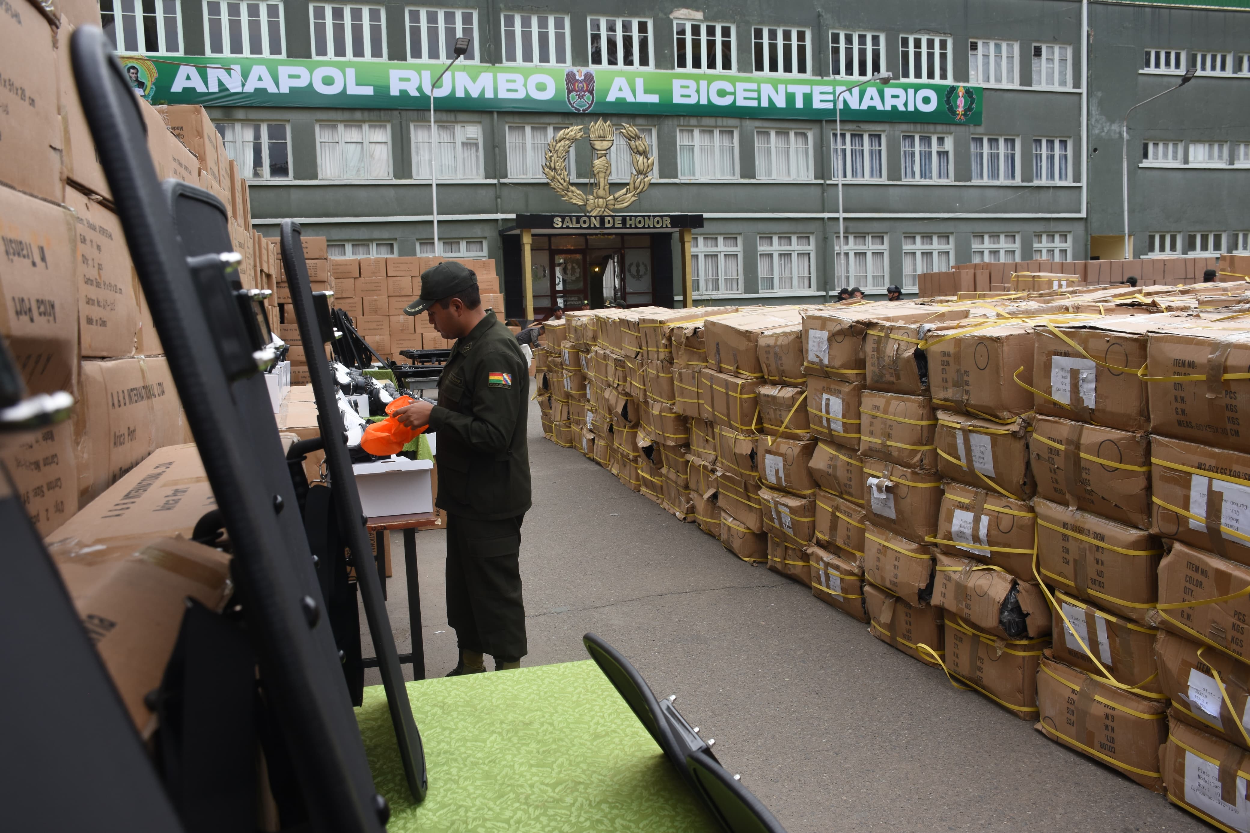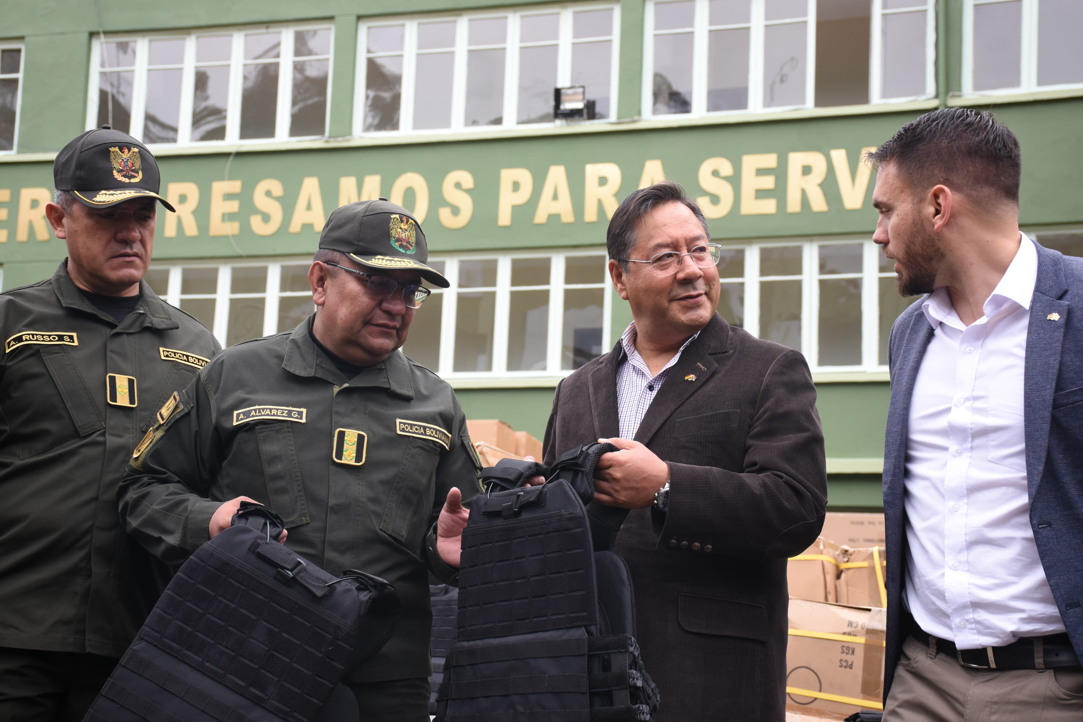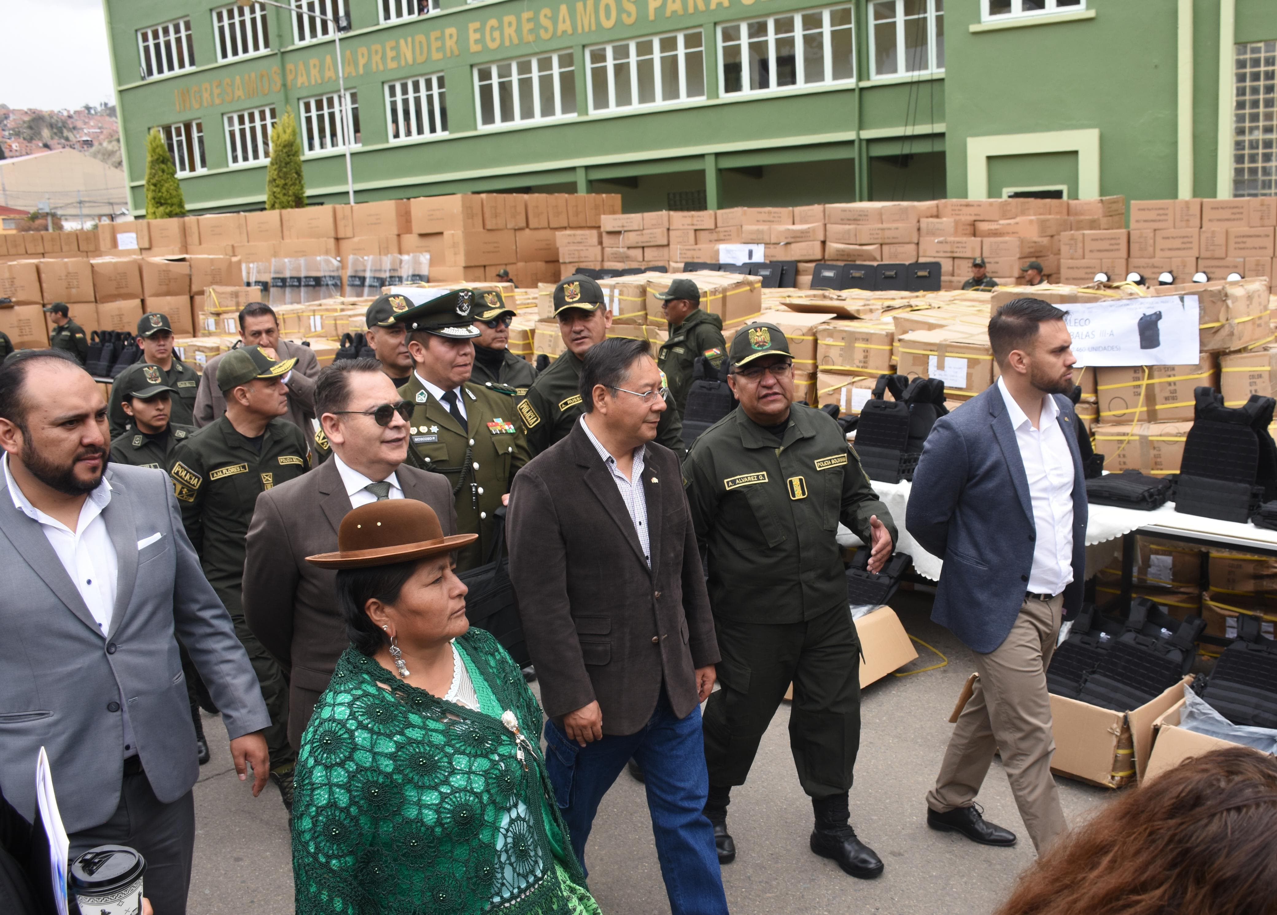 El presidente del Estado Luis Arce Catacora durante el acto de entrega de vestuario y equipamiento a la Policía Boliviana en el patio de Honor de la Academia Nacional de Policías - Anapol, ciudad de La Paz (1 Parte)