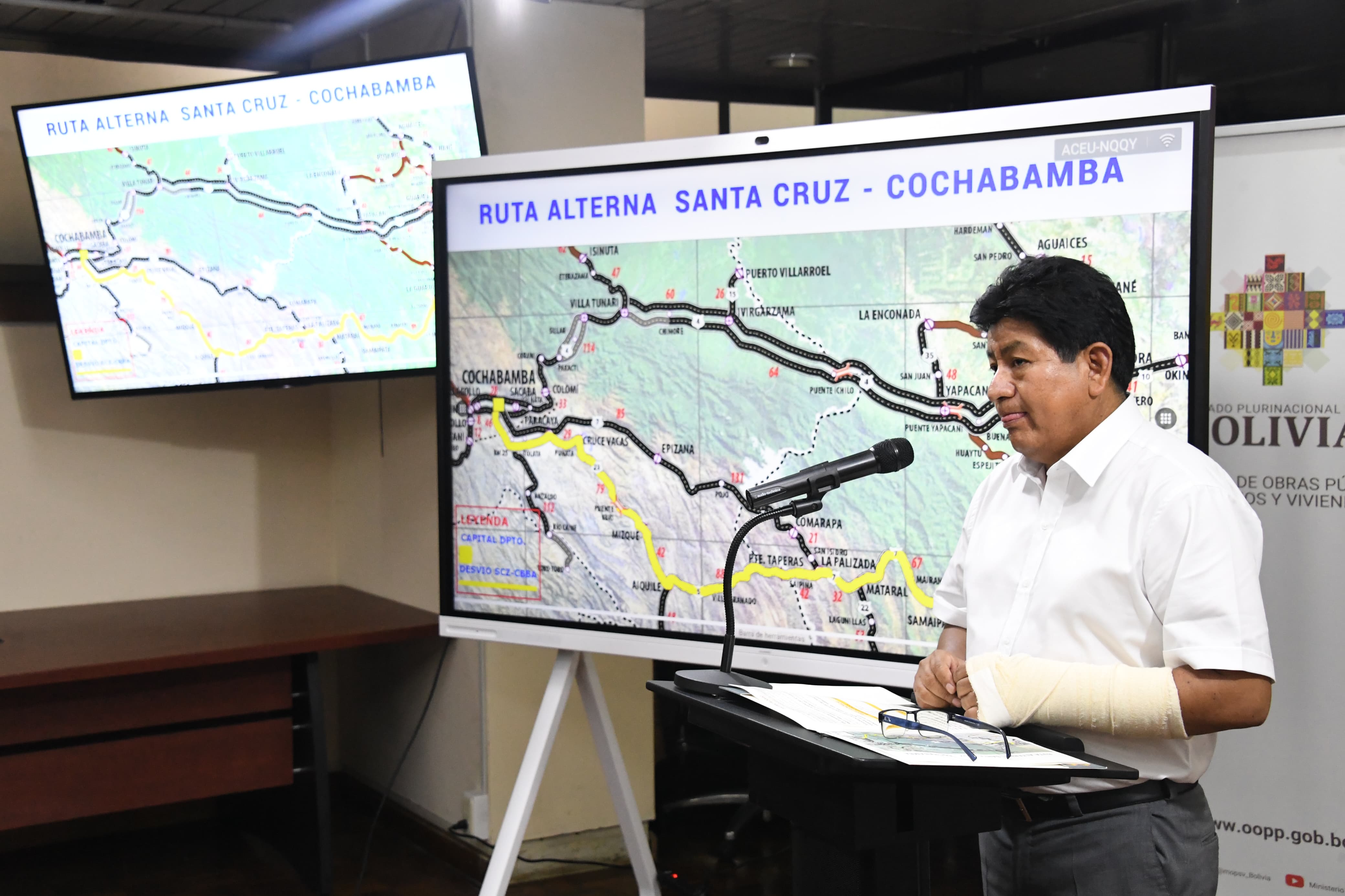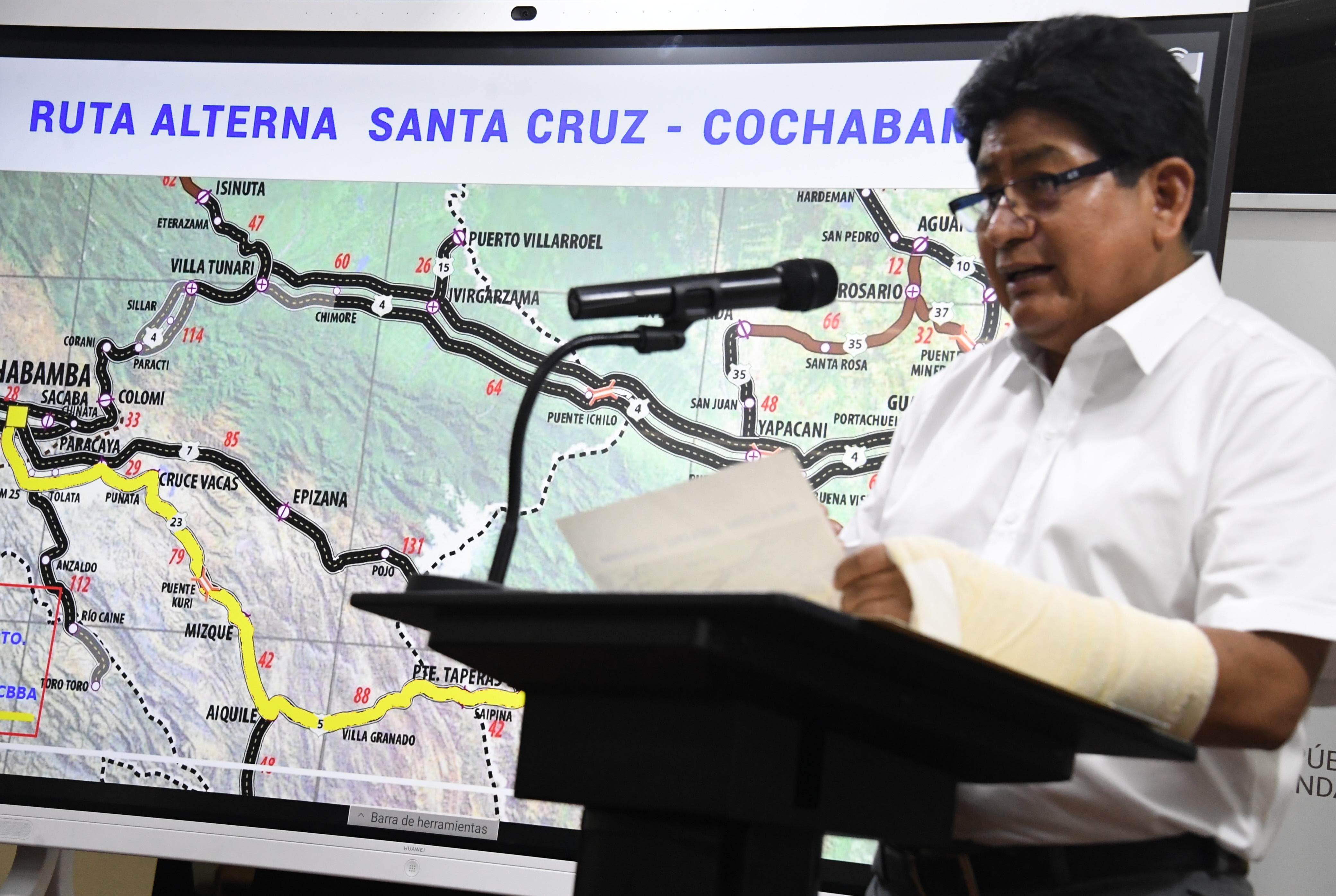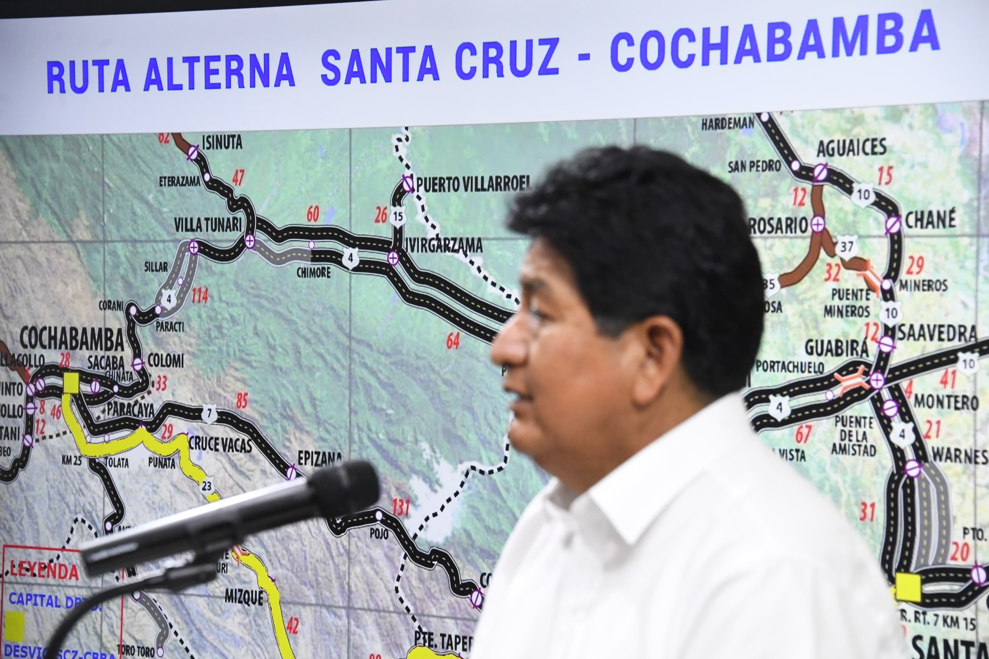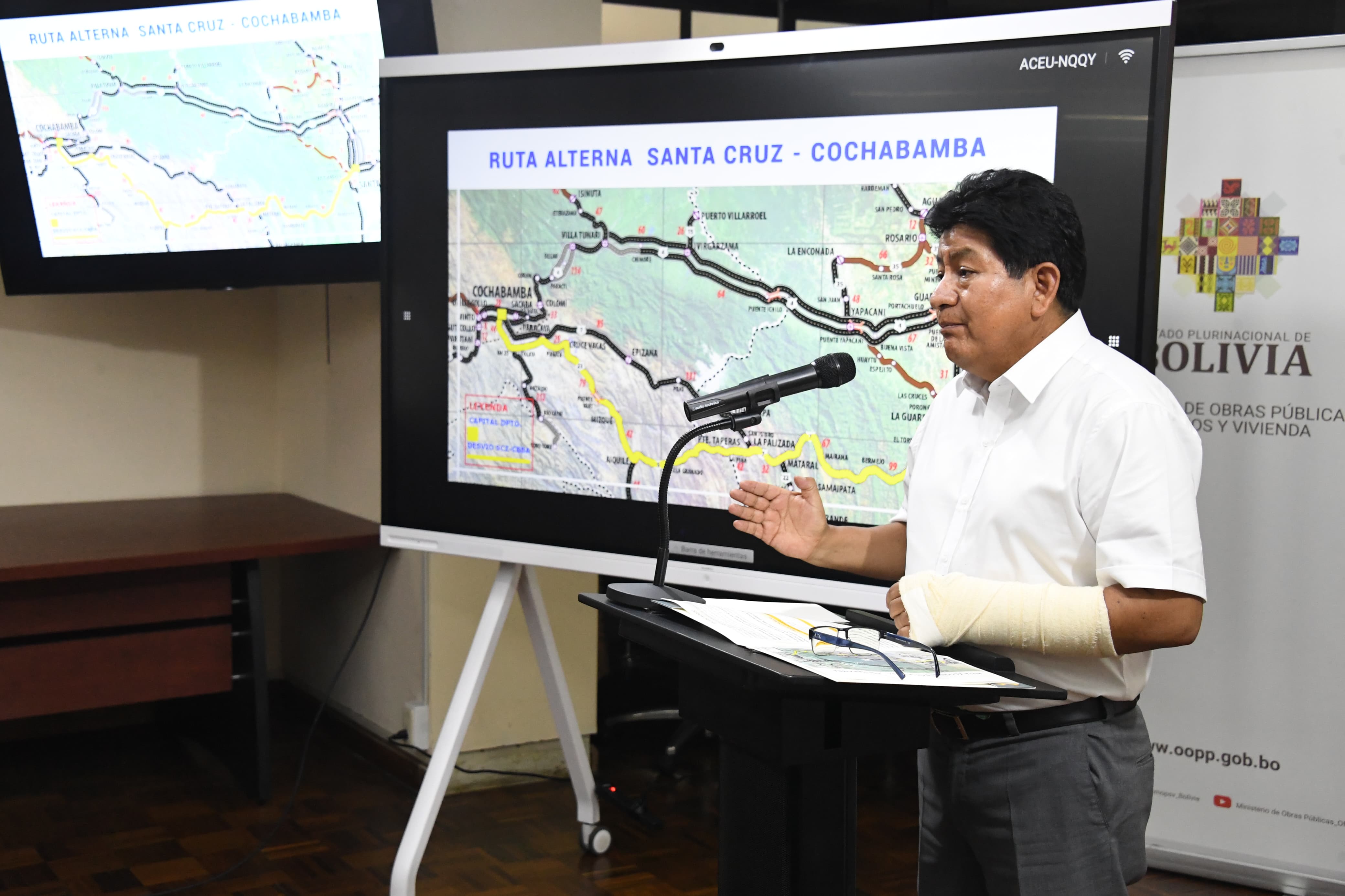 El ministro de Obras Públicas, Servicios y Vivienda, Edgar Montaño, brinda datos de las pérdidas económicas por bloqueos en la carretera Cochabamba - Santa Cruz, y rutas alternas