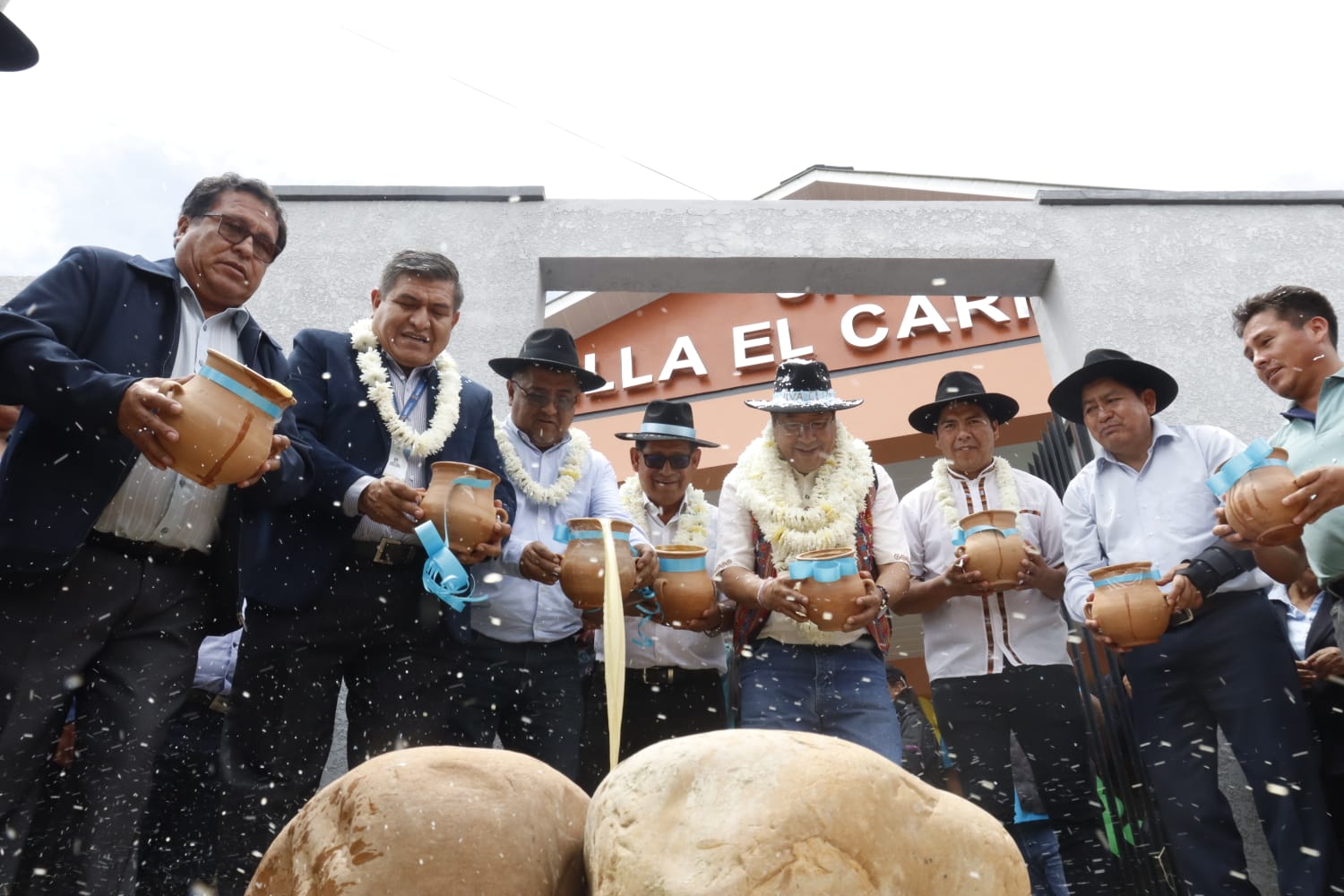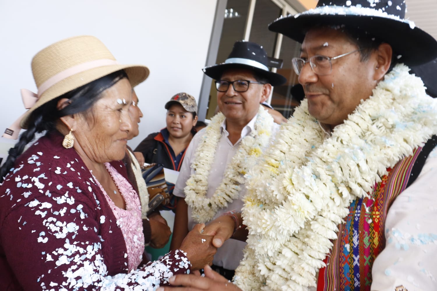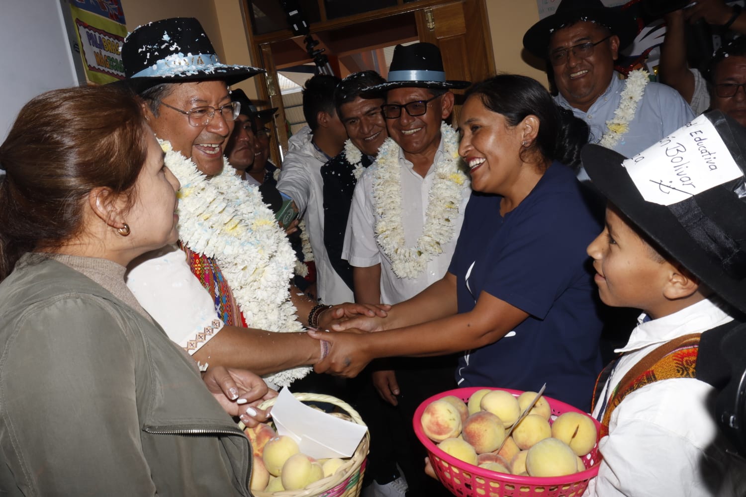 El presidente del Estado, Luis Arce, ch'alla la Unidad Educativa Villa El Carmen y el Proyecto de Ampliación del Canal de Riego Sector Poza Rancho, en el municipio de Cliza, Cochabamba